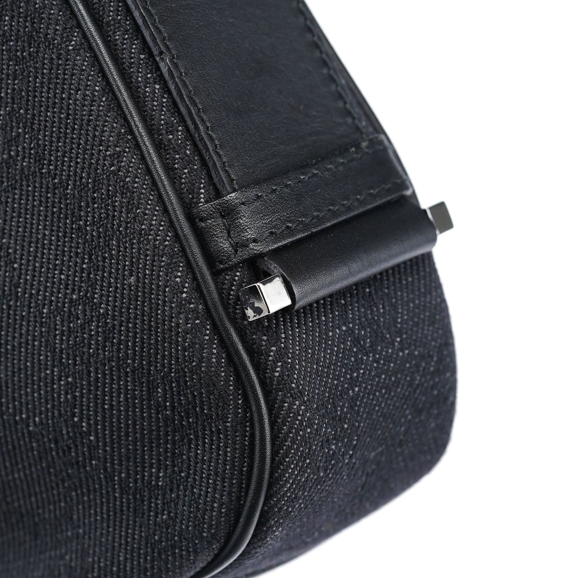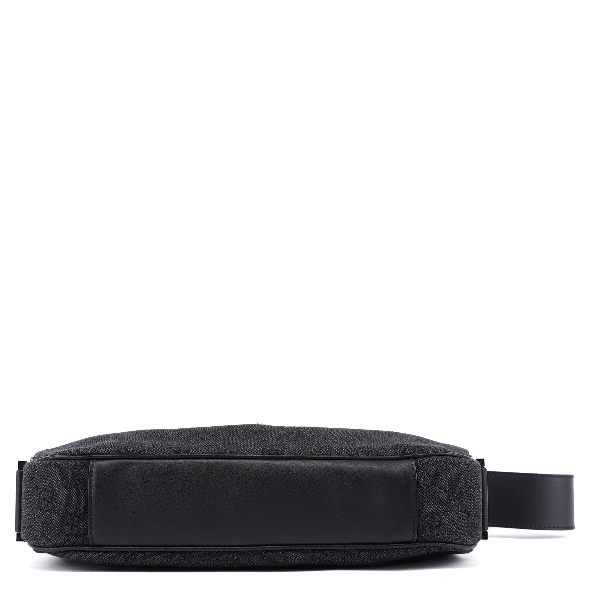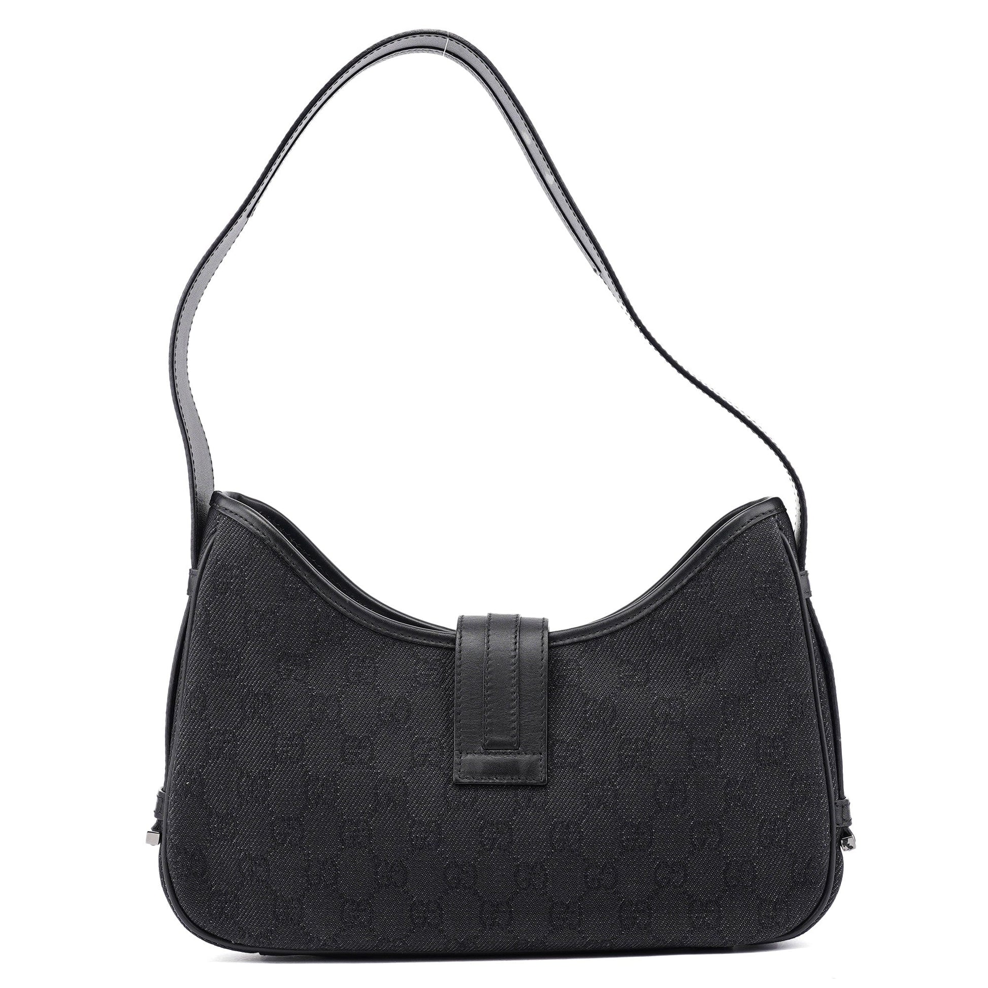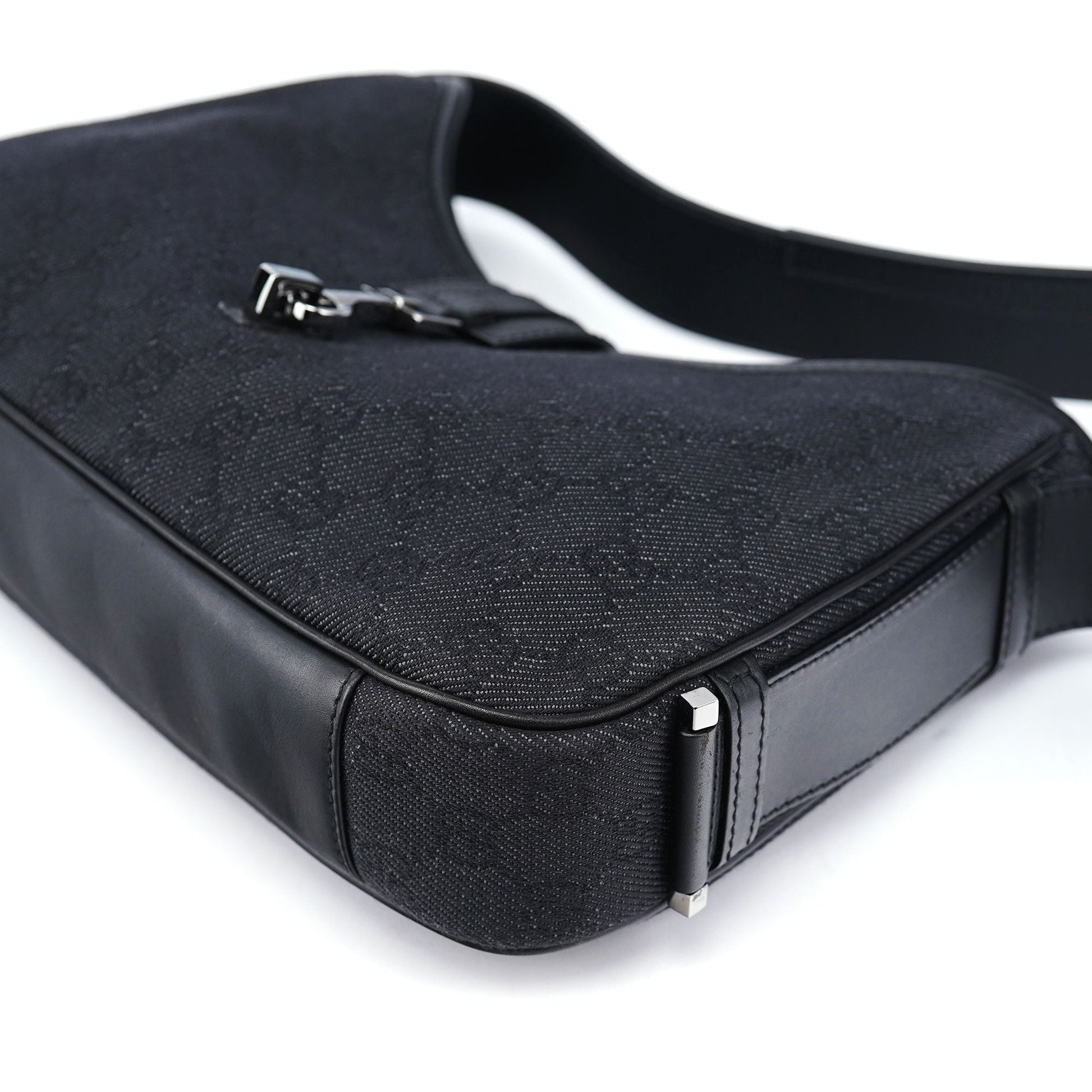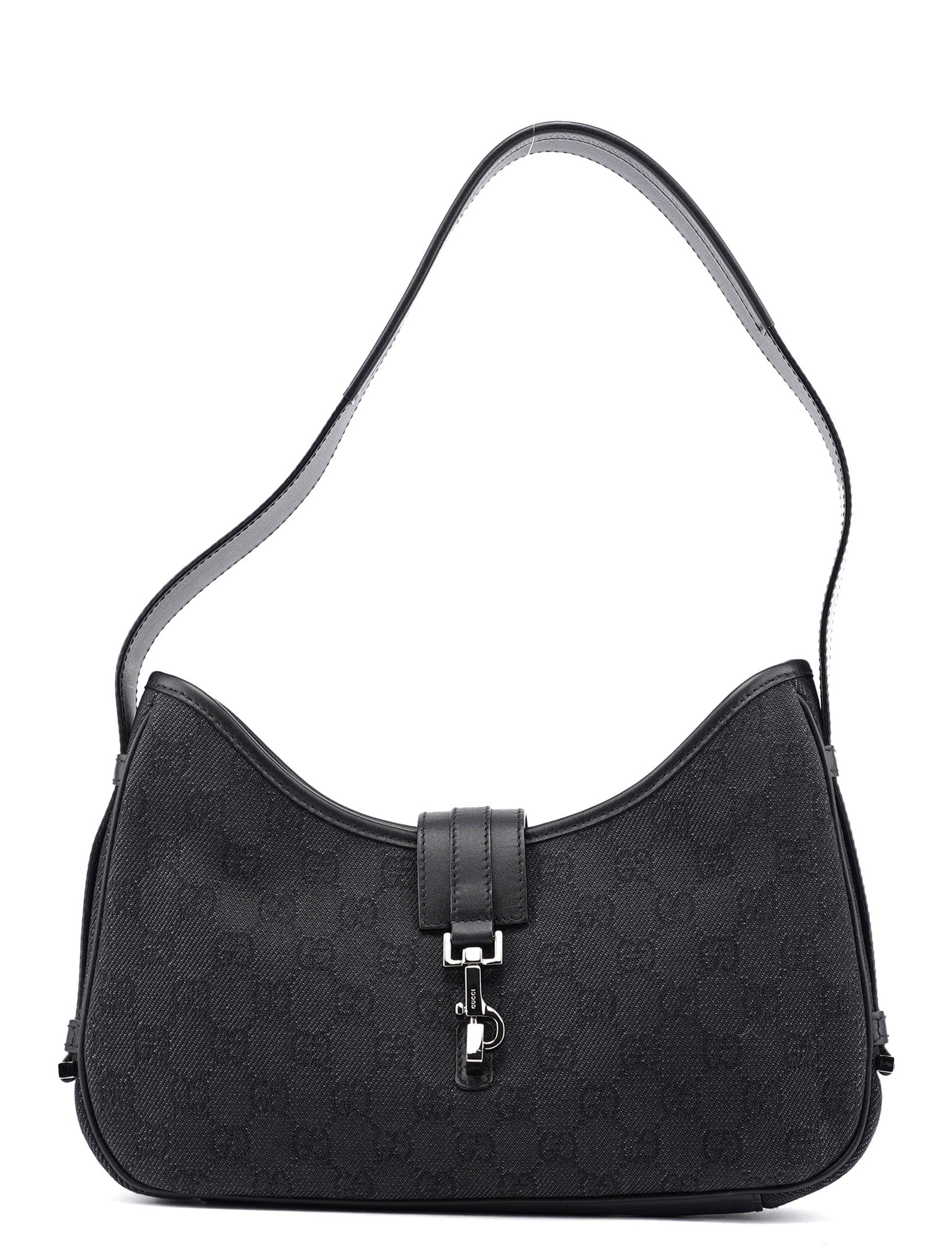 Handcrafted from GG denim monogram canvas with black calfskin leather trim, the Gucci GG Jackie bag, designed by Tom Ford in the late 1990s, features brass hardware with Gucci logo engraving and the iconic Jackie clasp closure. A satin-lined interior with a zipper pocket combines timeless elegance with practical sophistication.