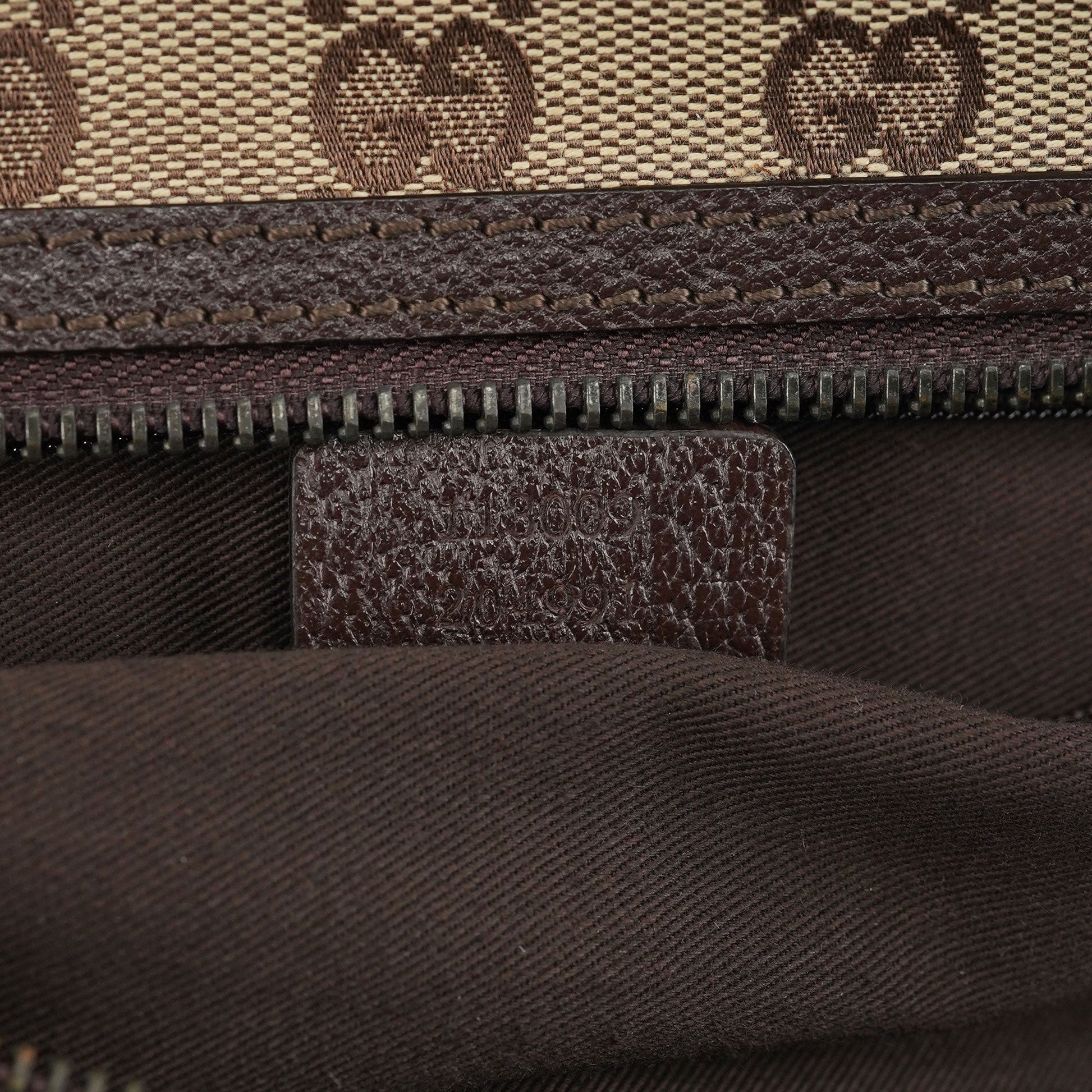 Designed by Tom Ford in the late 1990s, this Gucci GG monogram tote bag is handcrafted from beige GG monogram canvas with brown calfskin leather trim. It features silver-tone hardware, a secure zipper closure, and a cotton-lined interior with an interior zipper pocket, blending timeless elegance with practicality.