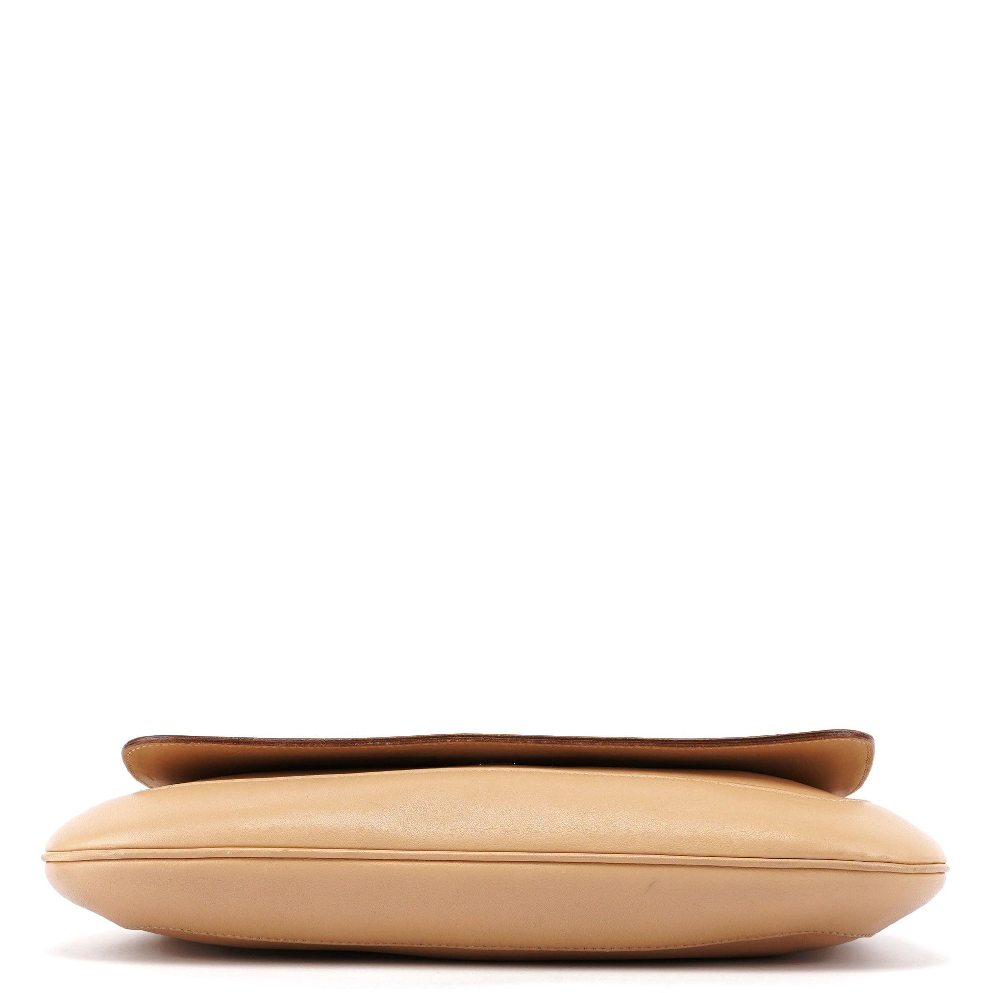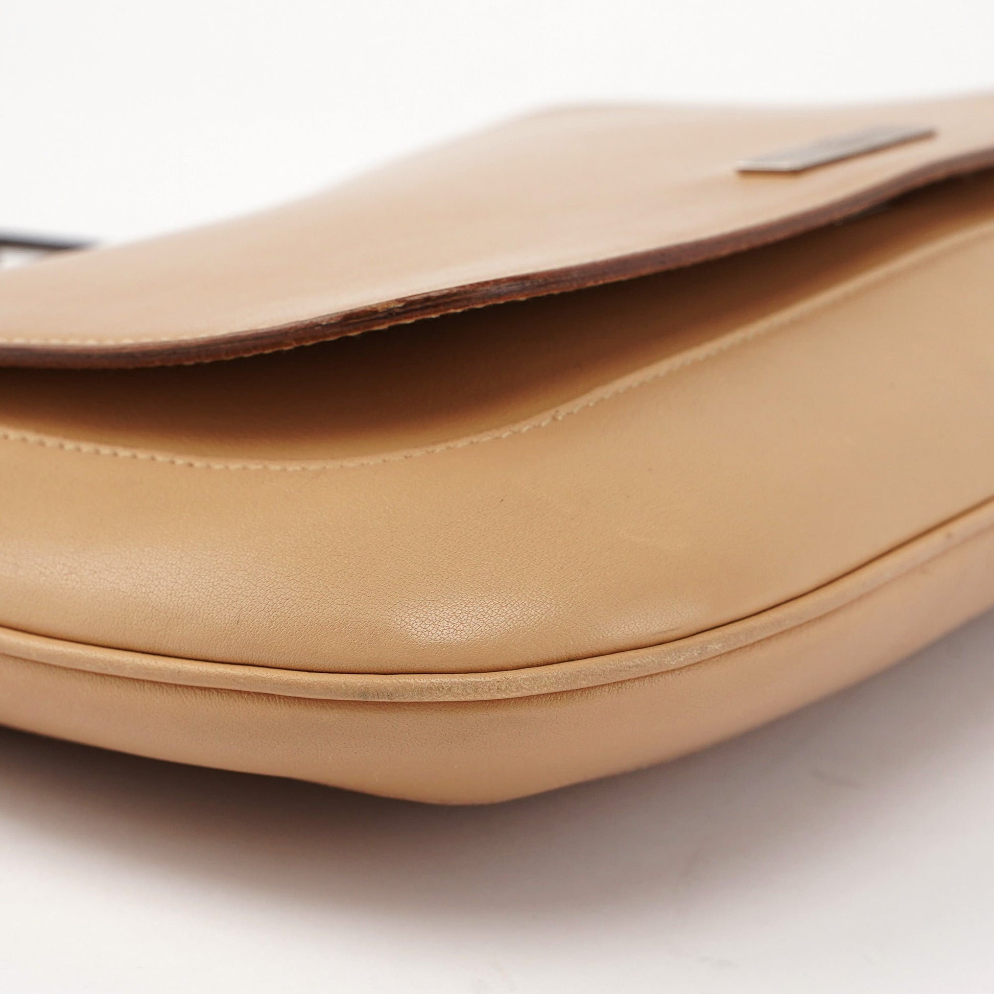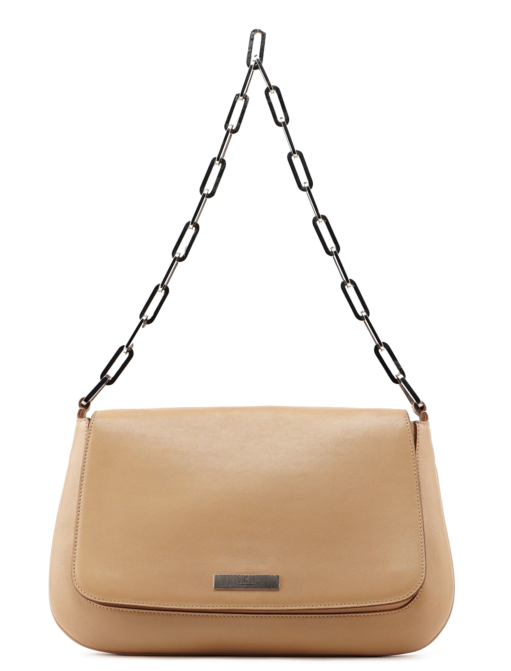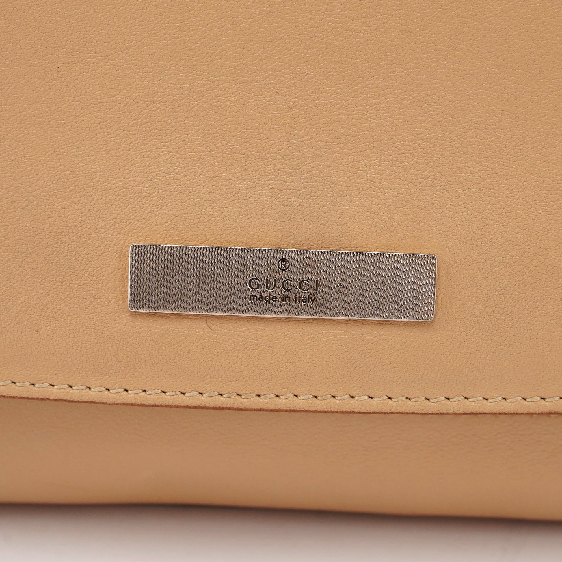 Designed by Tom Ford in the late 1990s, this Gucci Vitello Chain bag is handcrafted in beige leather and silver-tone hardware engraved with Gucci logo. It features chain strap, a magnetic closure, an interior lined with satin that includes an interior zipper pocket. The Gucci logo plate adorns the front, showcasing timeless elegance.