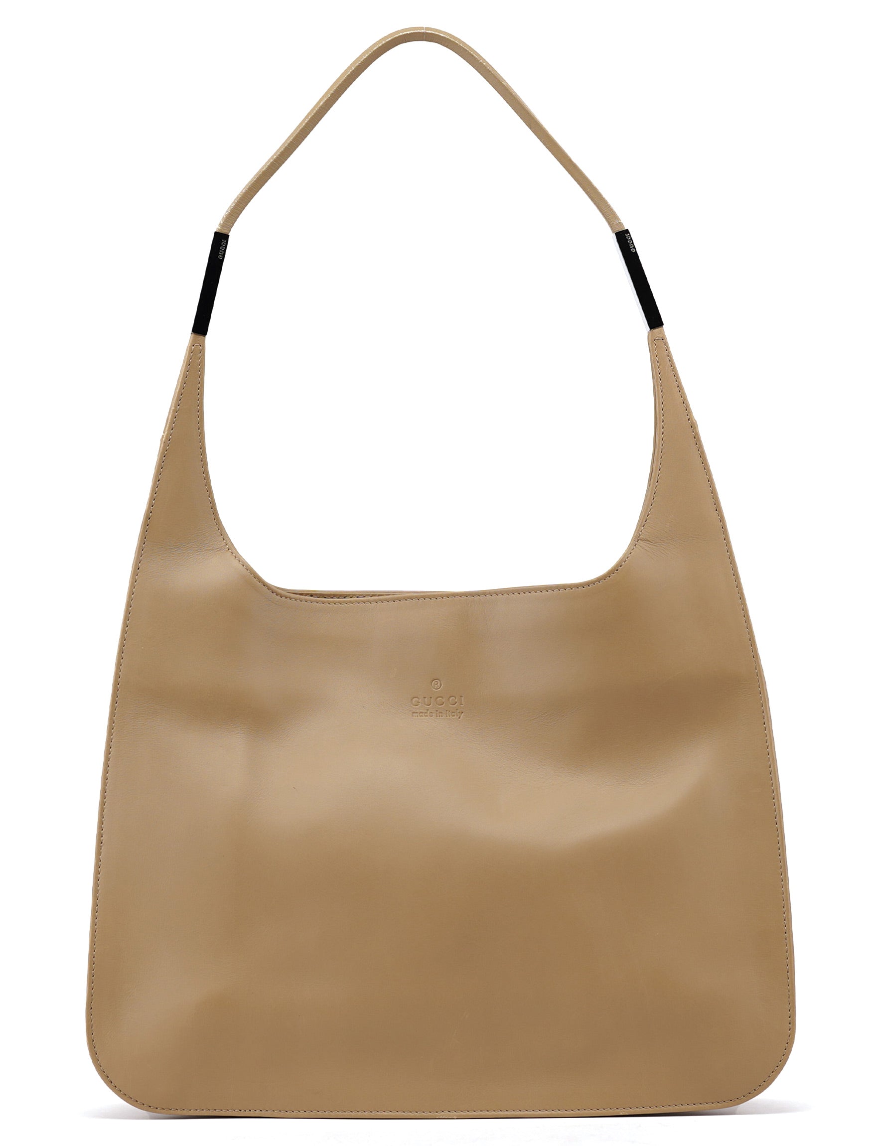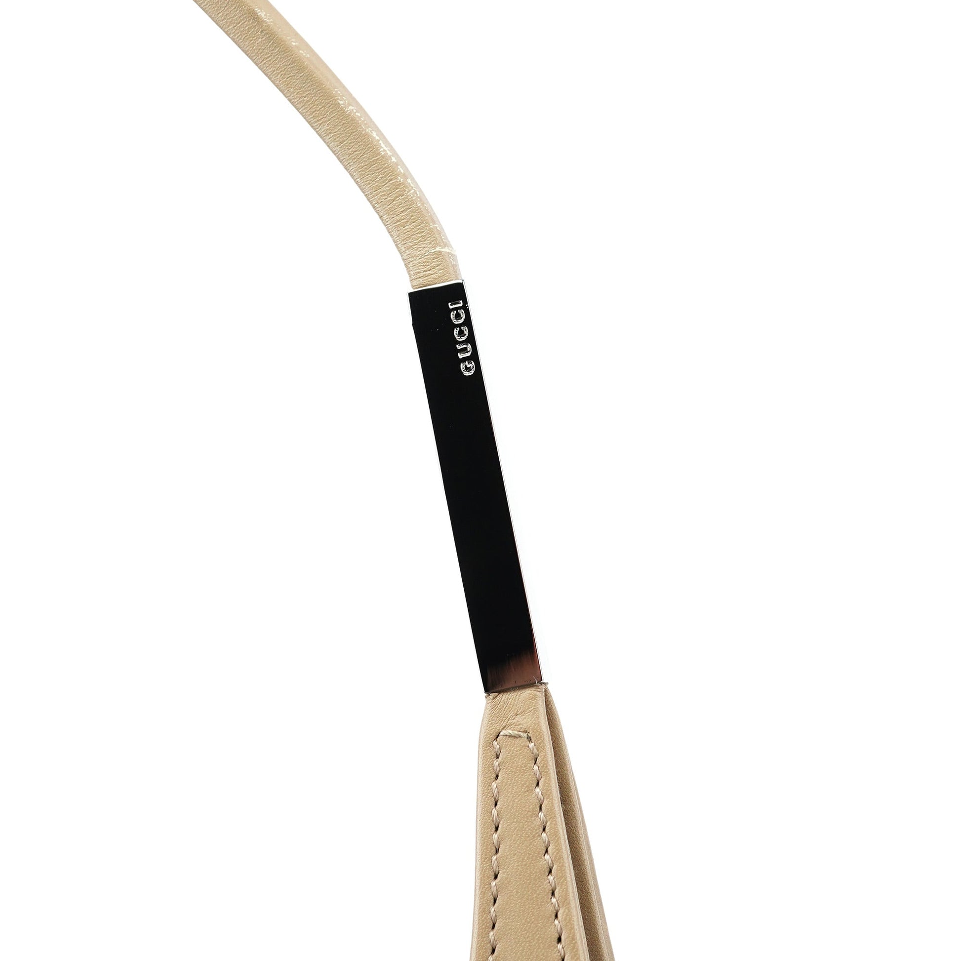 Designed by Tom Ford in the late 1990s, this Gucci hobo bag is crafted from beige calfskin leather with silver-tone hardware engraved with the Gucci logo. It features a magnetic closure, a calfskin-lined interior with a zipper pocket, and a subtly embossed Gucci logo at the front.