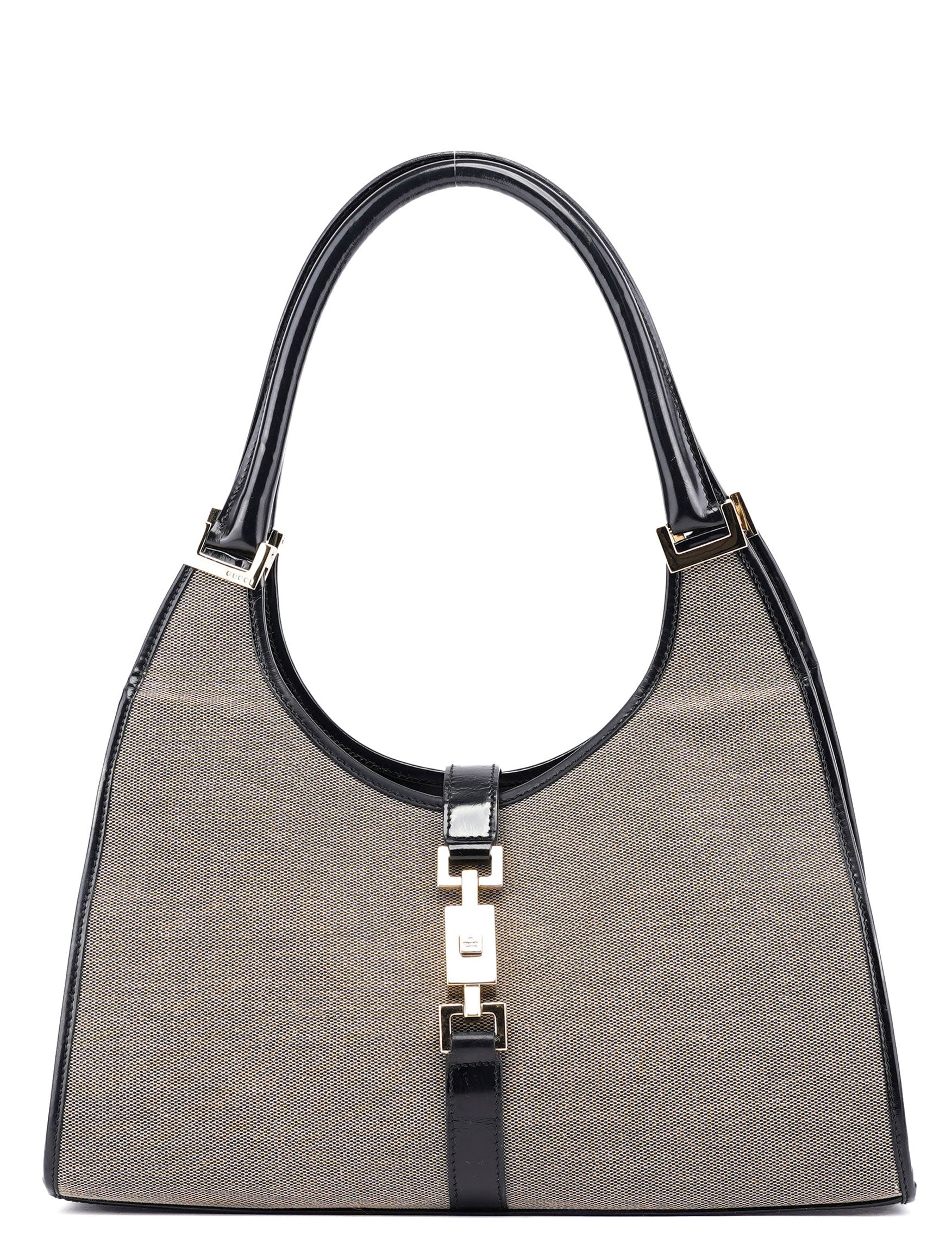 Designed by Tom Ford in the late 1990s, this Gucci Jackie shoulder bag is handcrafted in beige cotton canvas with black leather trim, accented by gold-tone hardware. It features the classic Jackie style closure. The interior, lined with satin and includes a zipper pocket.