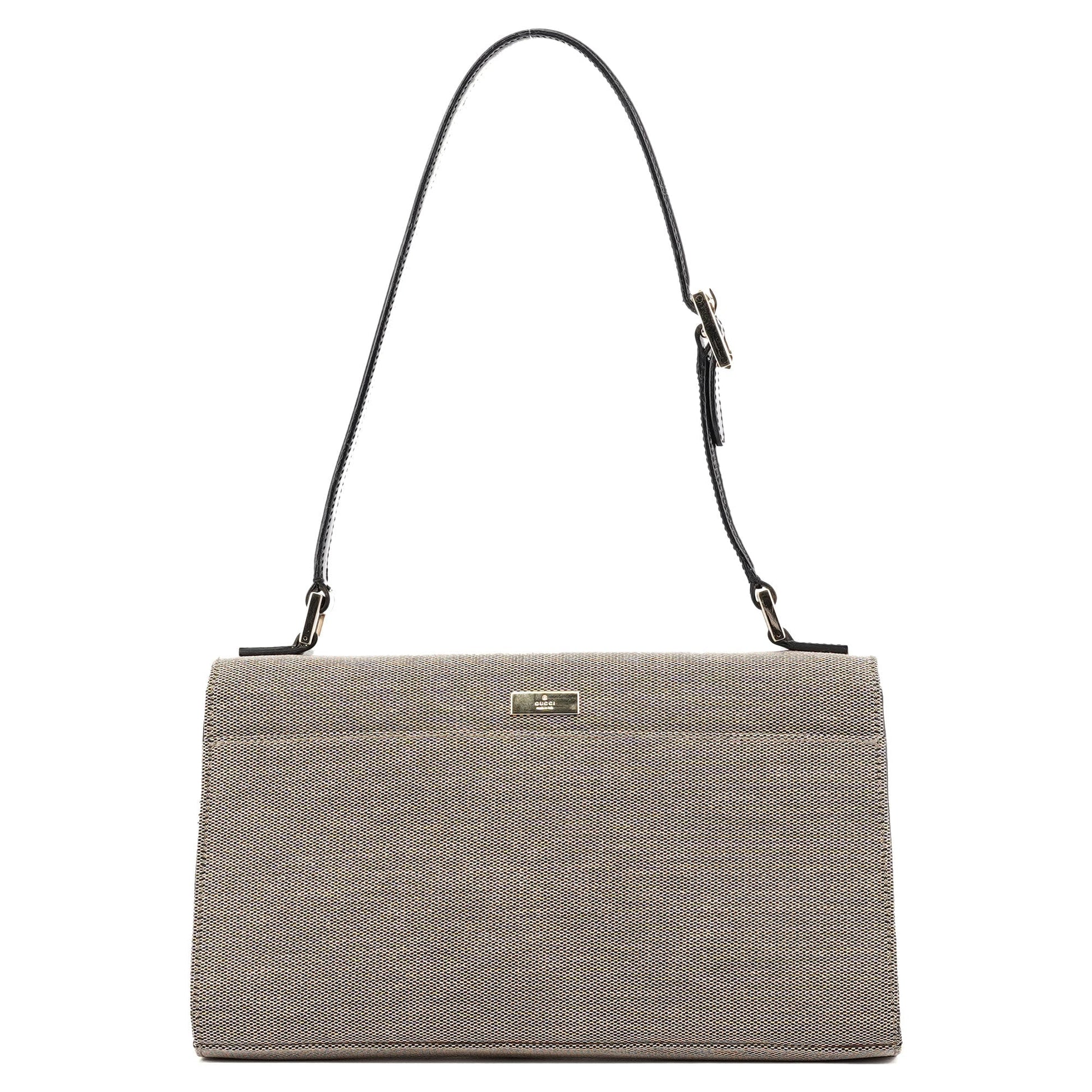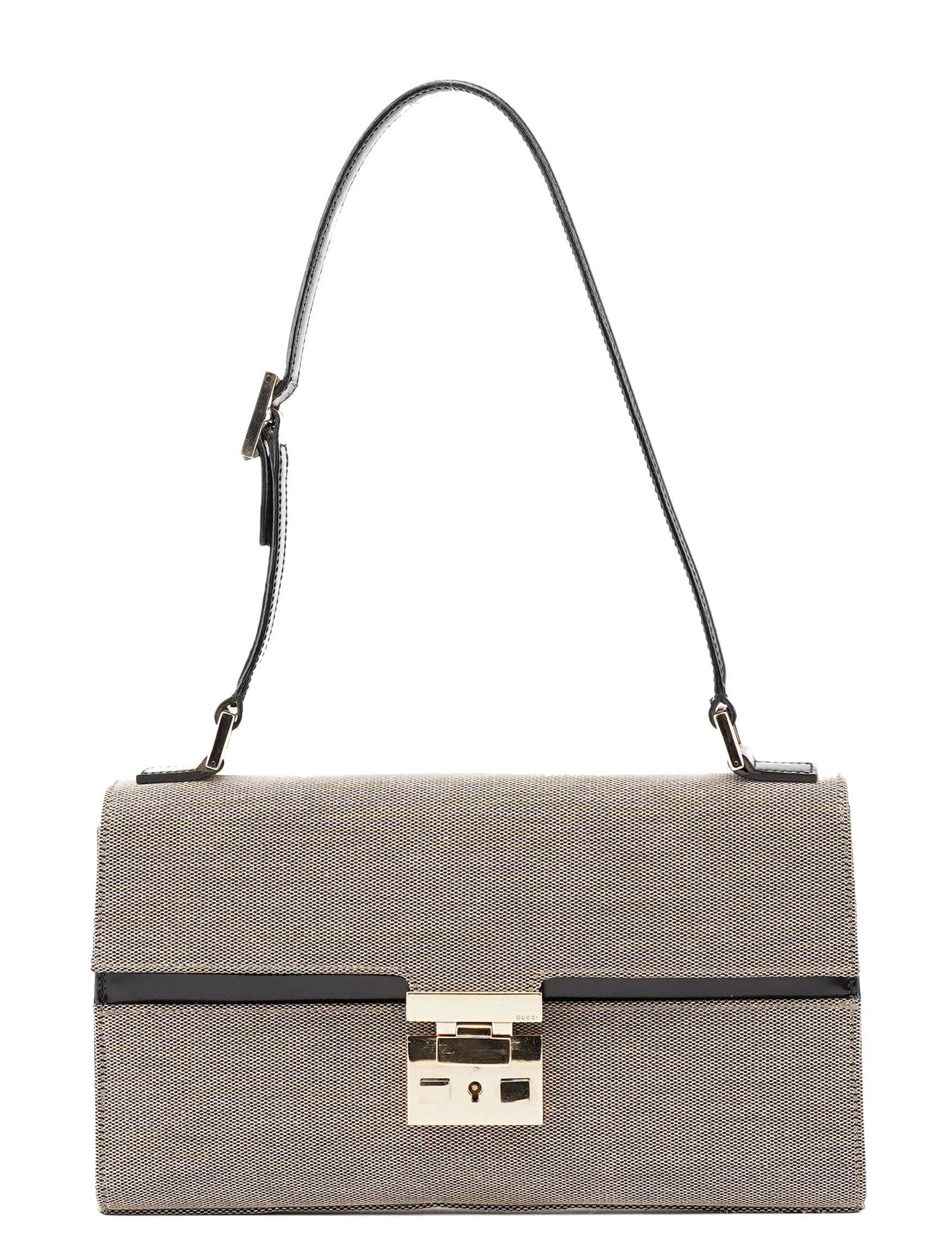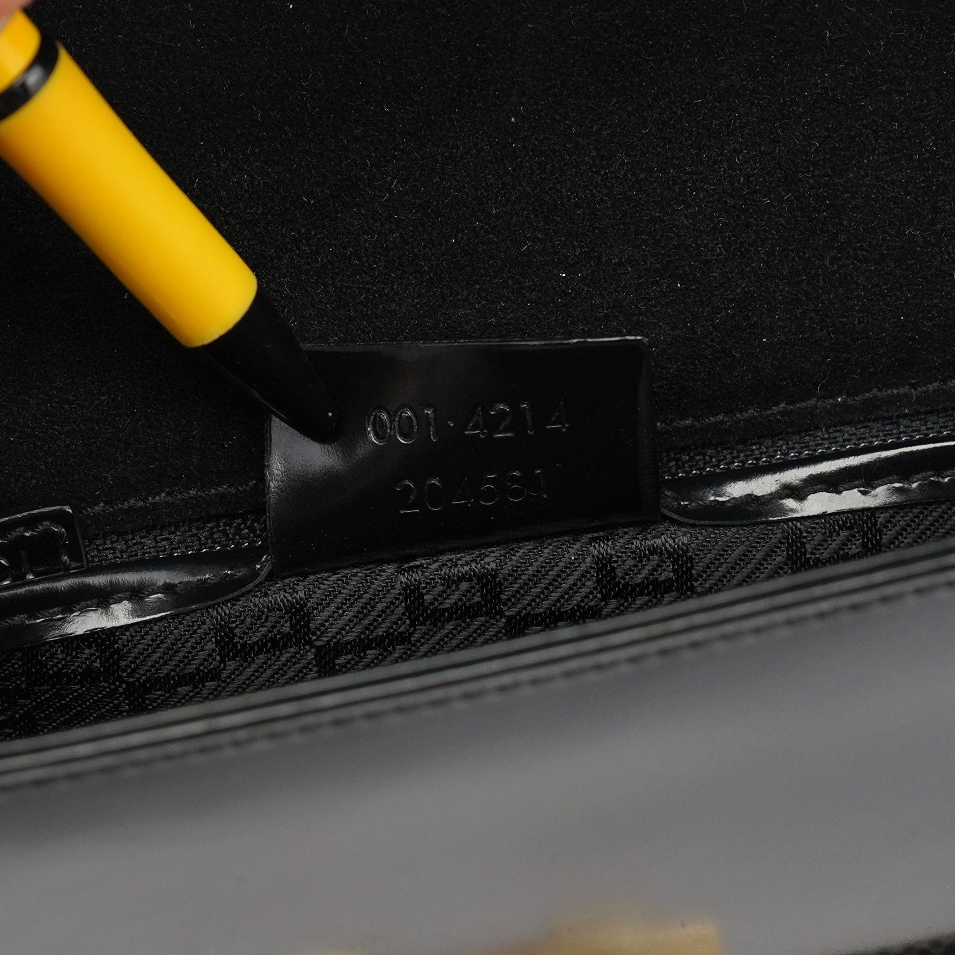 Designed by Tom Ford in the late 1990s, the Gucci Lady Lock shoulder bag is crafted from beige canvas with gloss black leather trim. Featuring gold-tone hardware, a lock closure with key, and a satin-lined interior with a zipper pocket, it blends elegance with functionality.