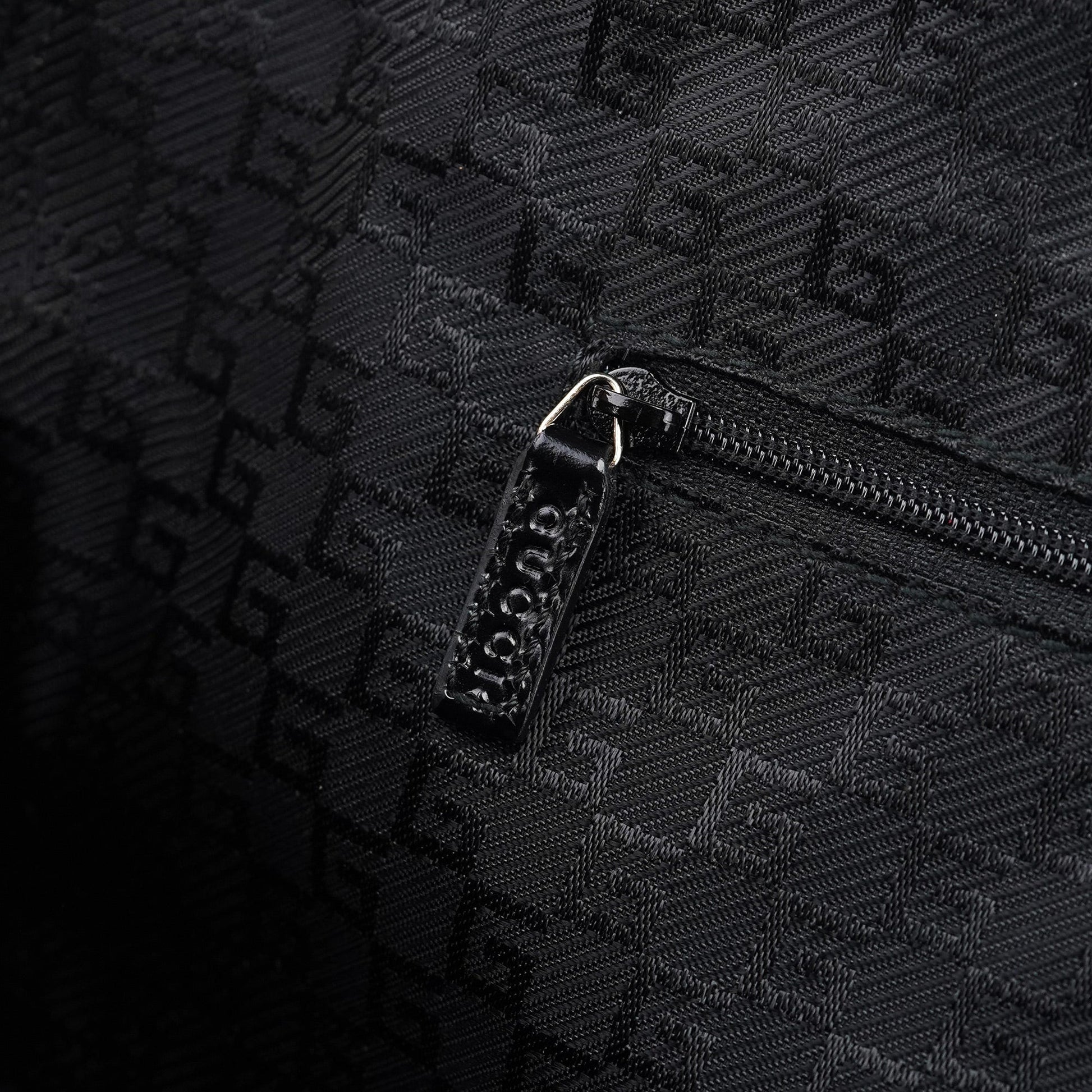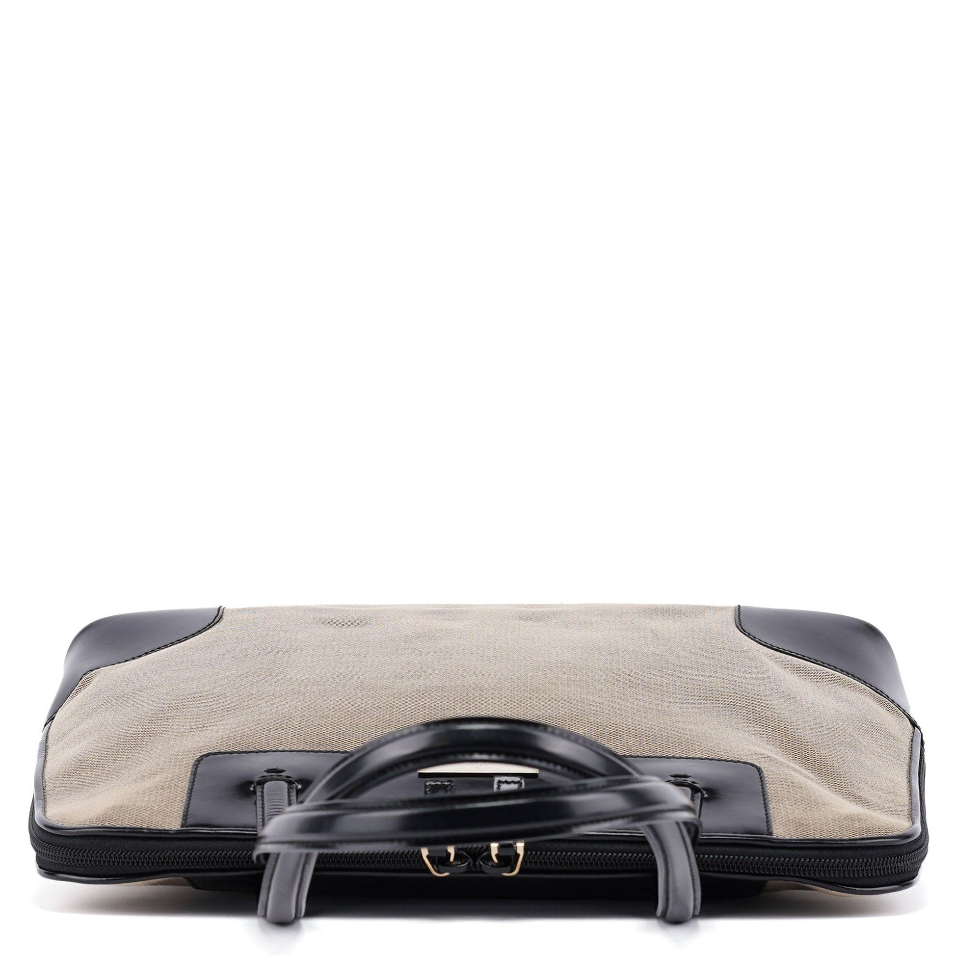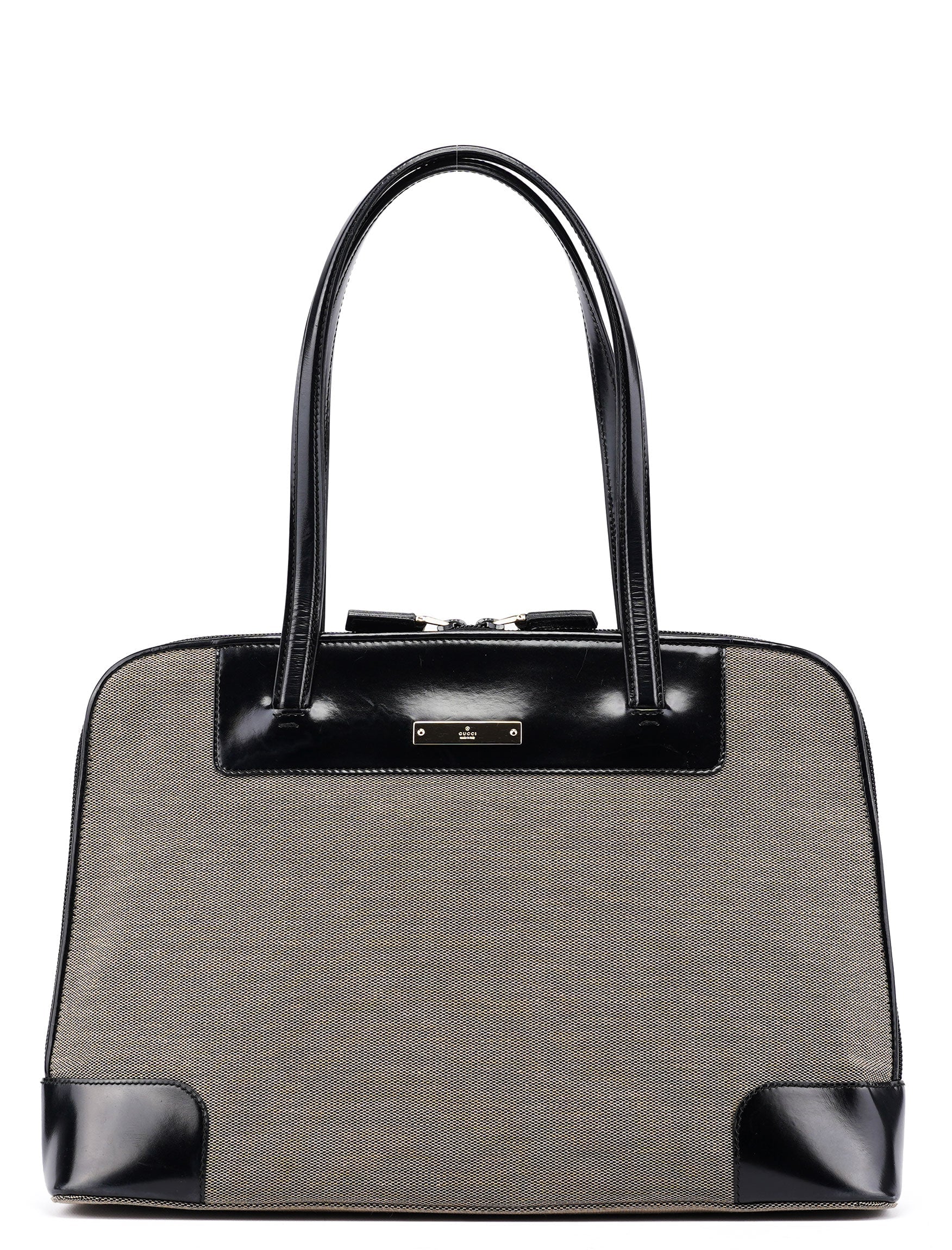 This Gucci tote bag, designed by Tom Ford in the late 1990s, is a striking blend of beige canvas and black patent leather. Accented with gold-tone hardware, it features a secure zipper closure and a satin-lined interior with a convenient zipper pocket. Finished with a Gucci logo plate on the front, this tote combines timeless elegance with functional design.