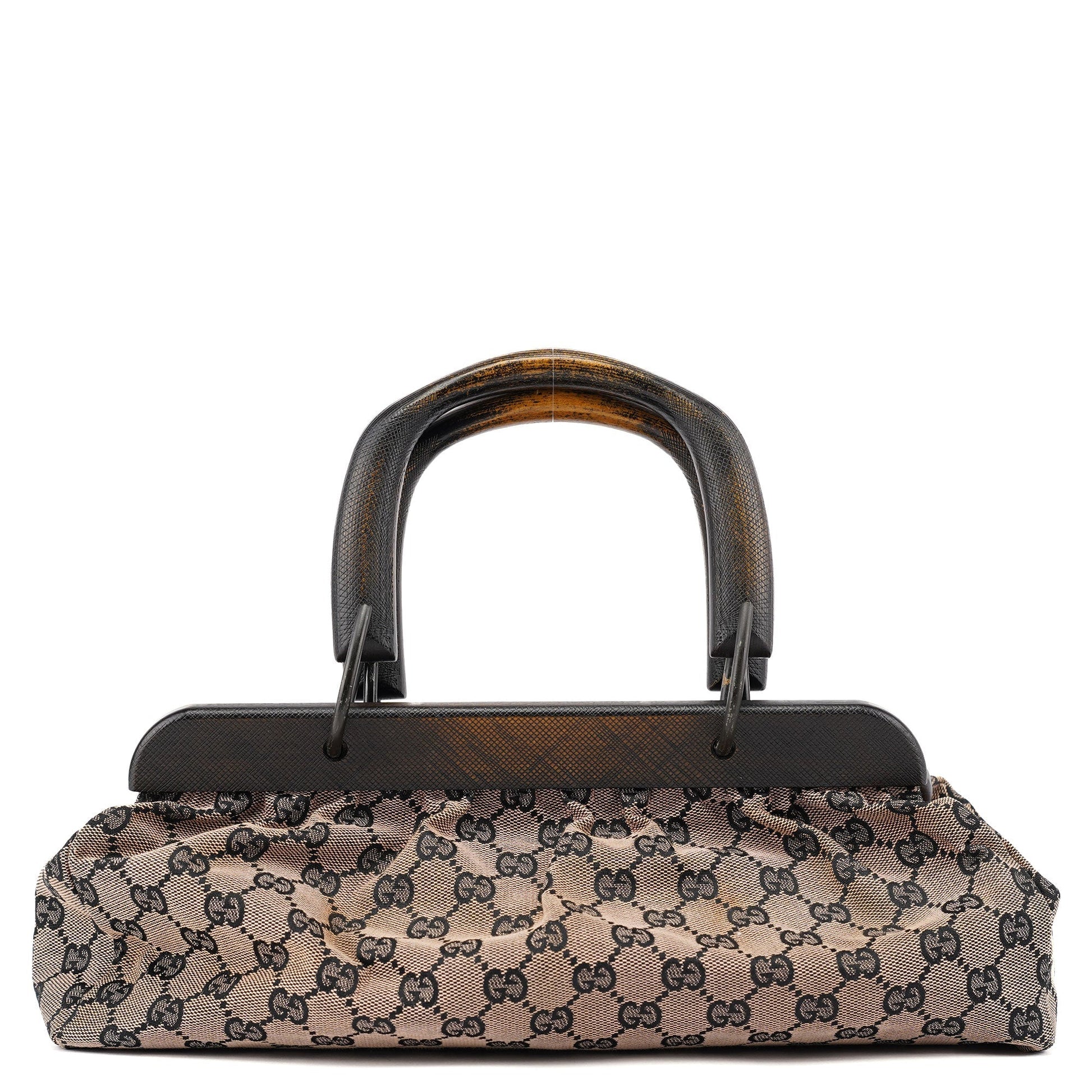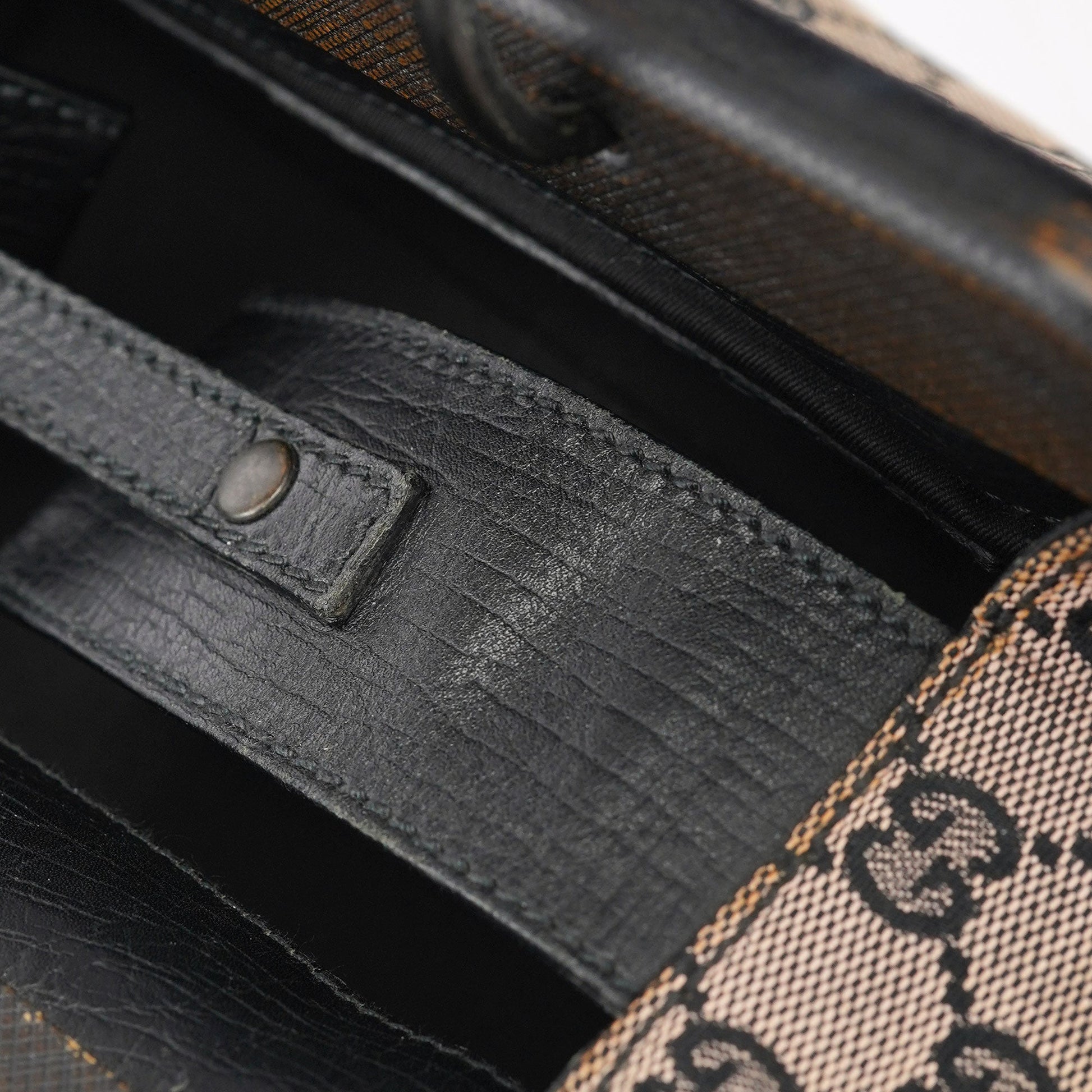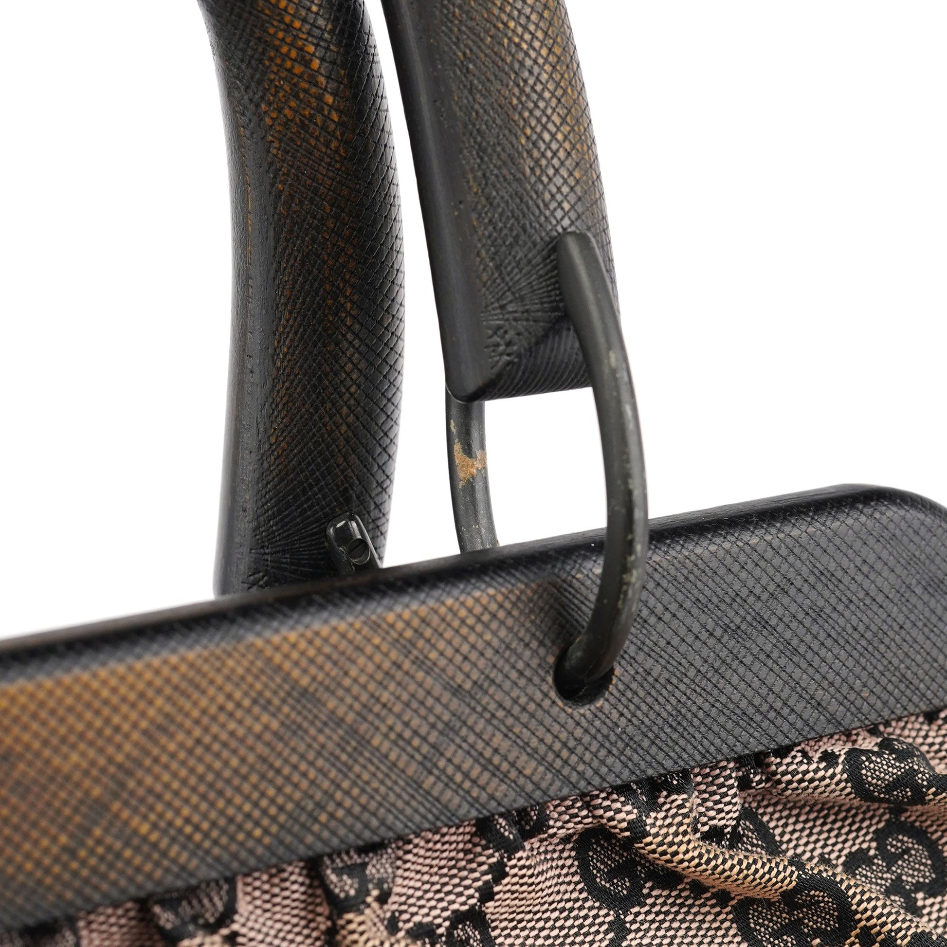 Designed by Tom Ford for the Fall 2002 collection, this Gucci GG doctor bag is crafted in beige GG monogram canvas with textured black leather trim. It features a cotton-lined interior with a zip pocket and is finished with a subtle front plaque, as seen on the runway.