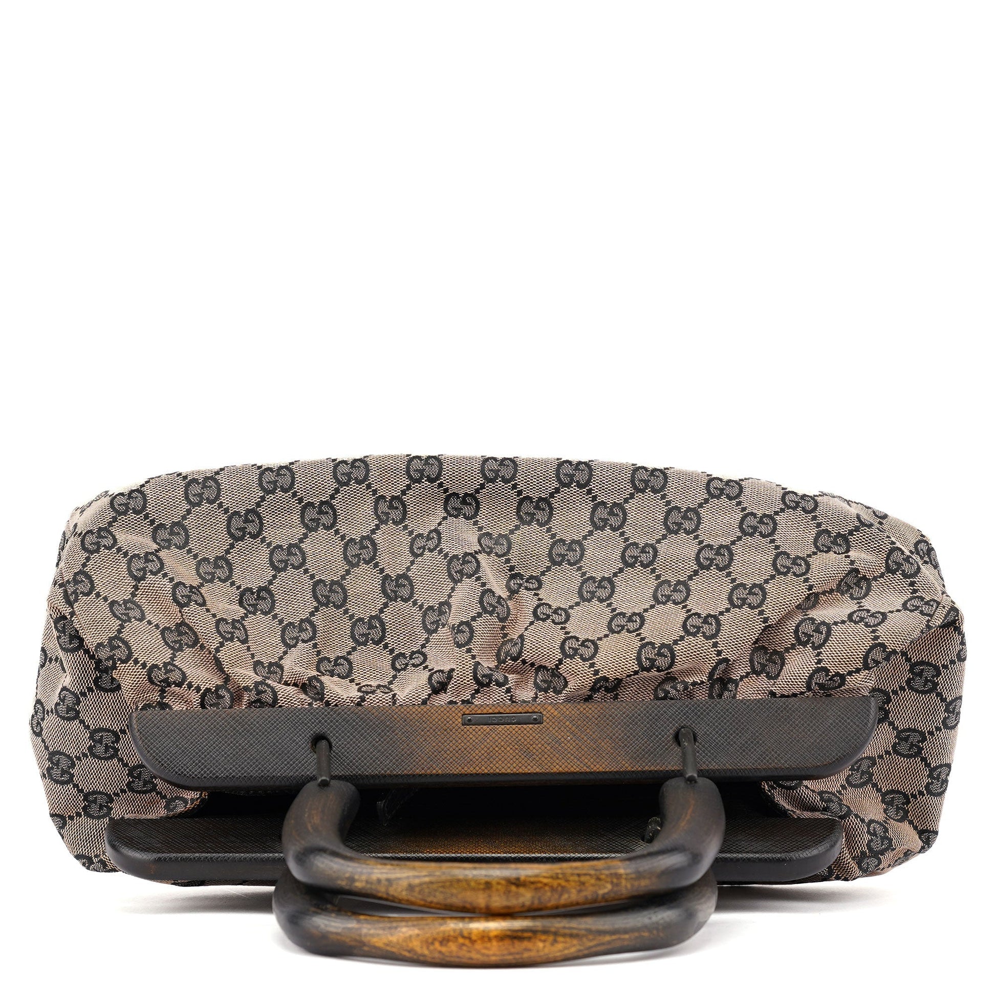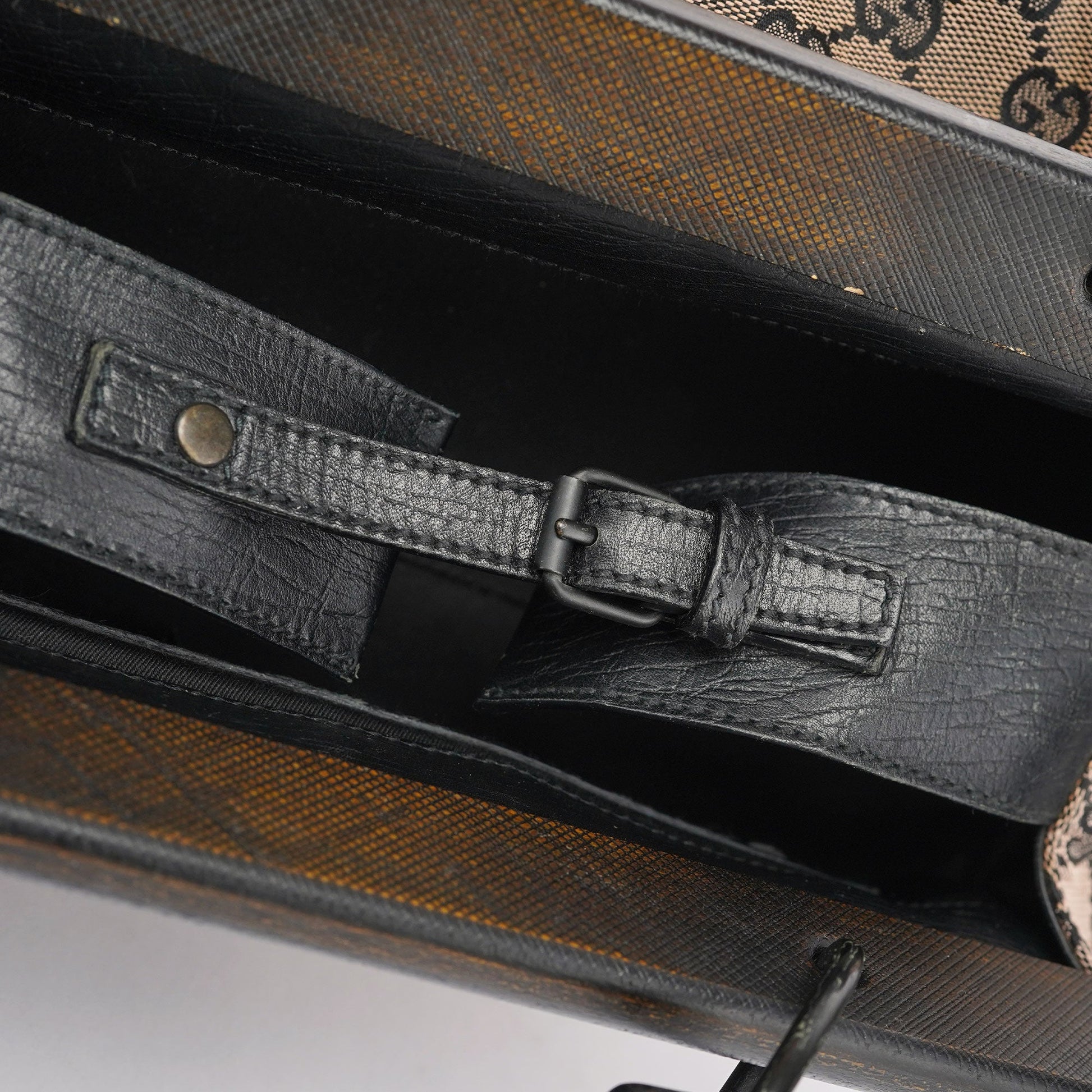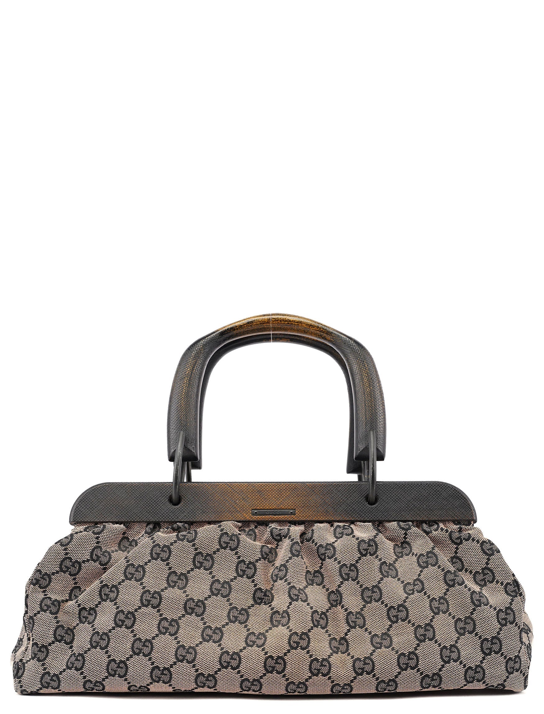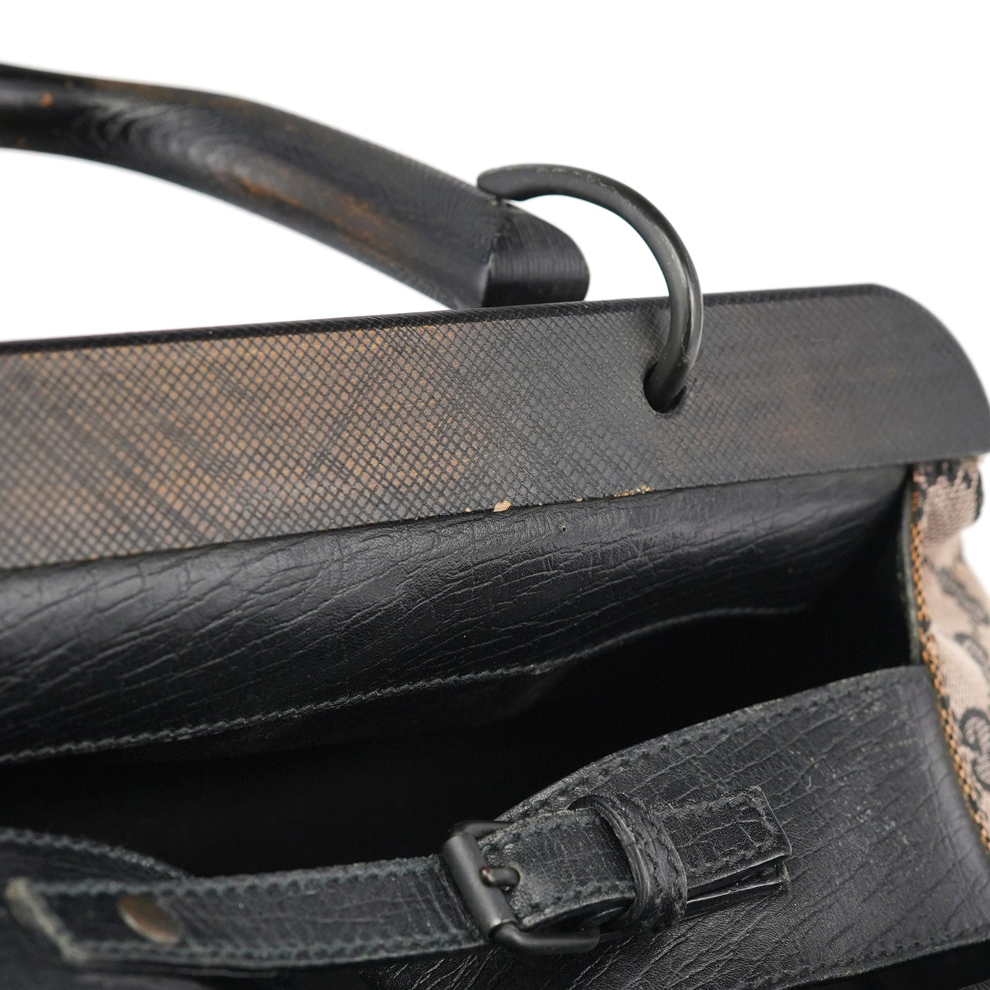 Designed by Tom Ford for the Fall 2002 collection, this Gucci GG doctor bag is crafted in beige GG monogram canvas with textured black leather trim. It features a cotton-lined interior with a zip pocket and is finished with a subtle front plaque, as seen on the runway.