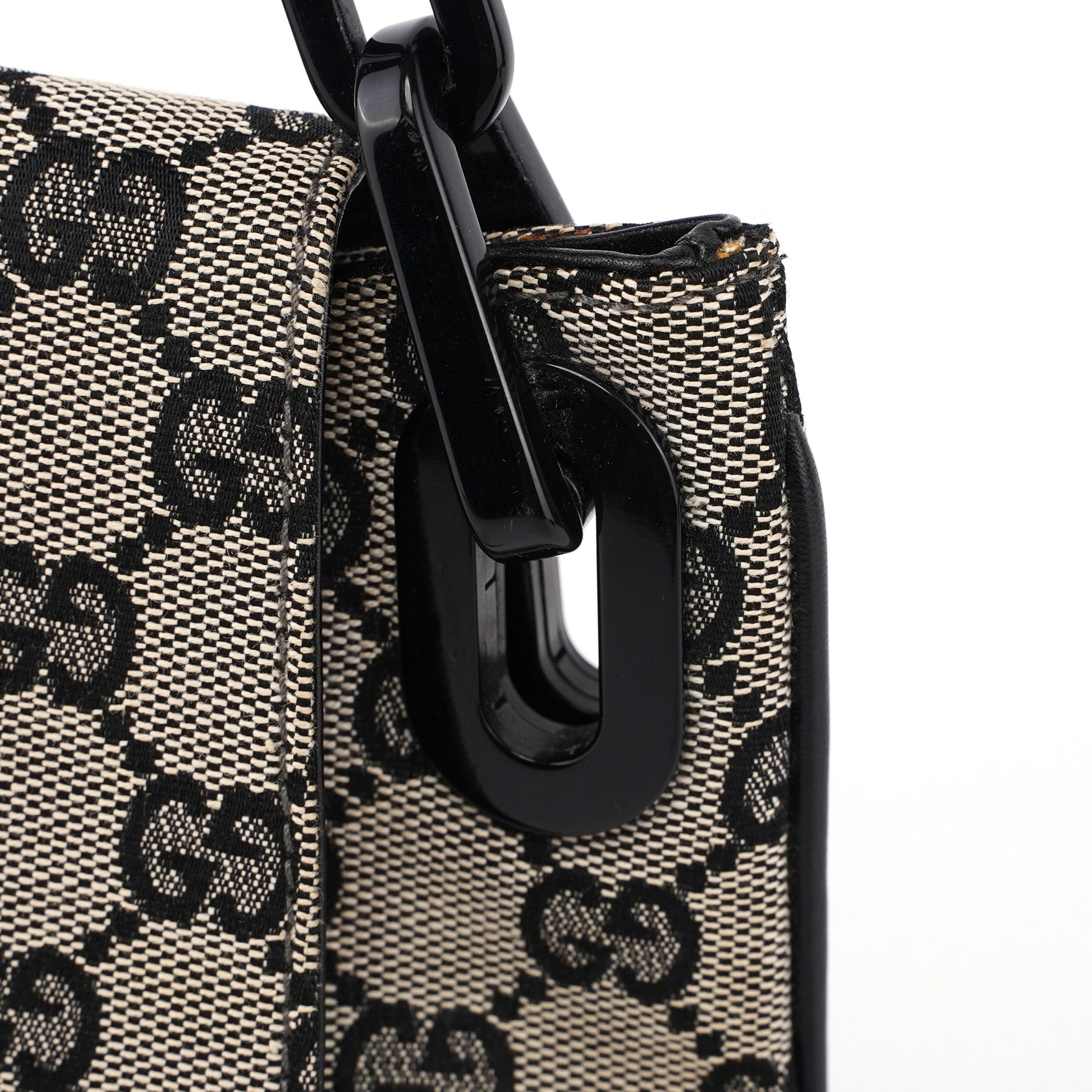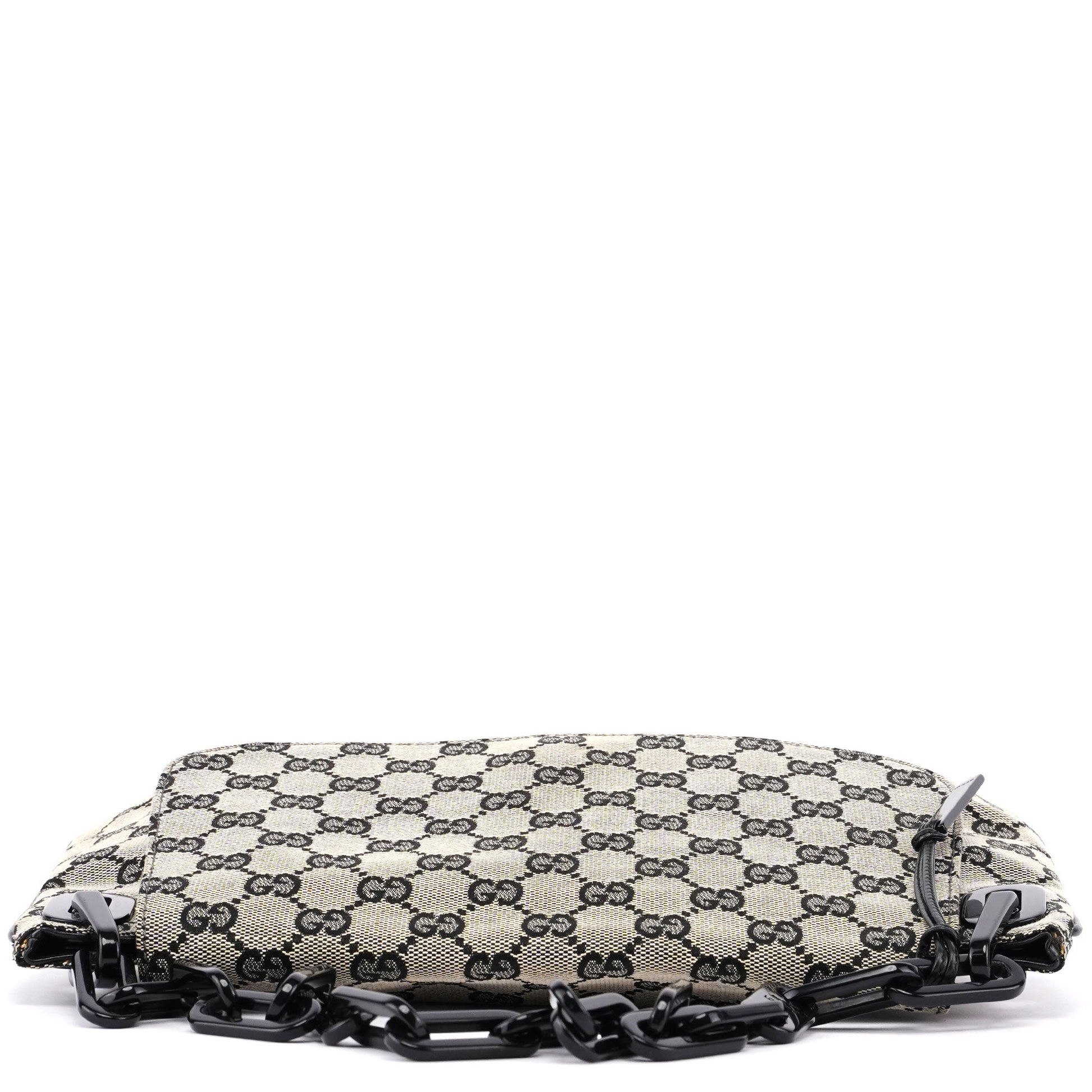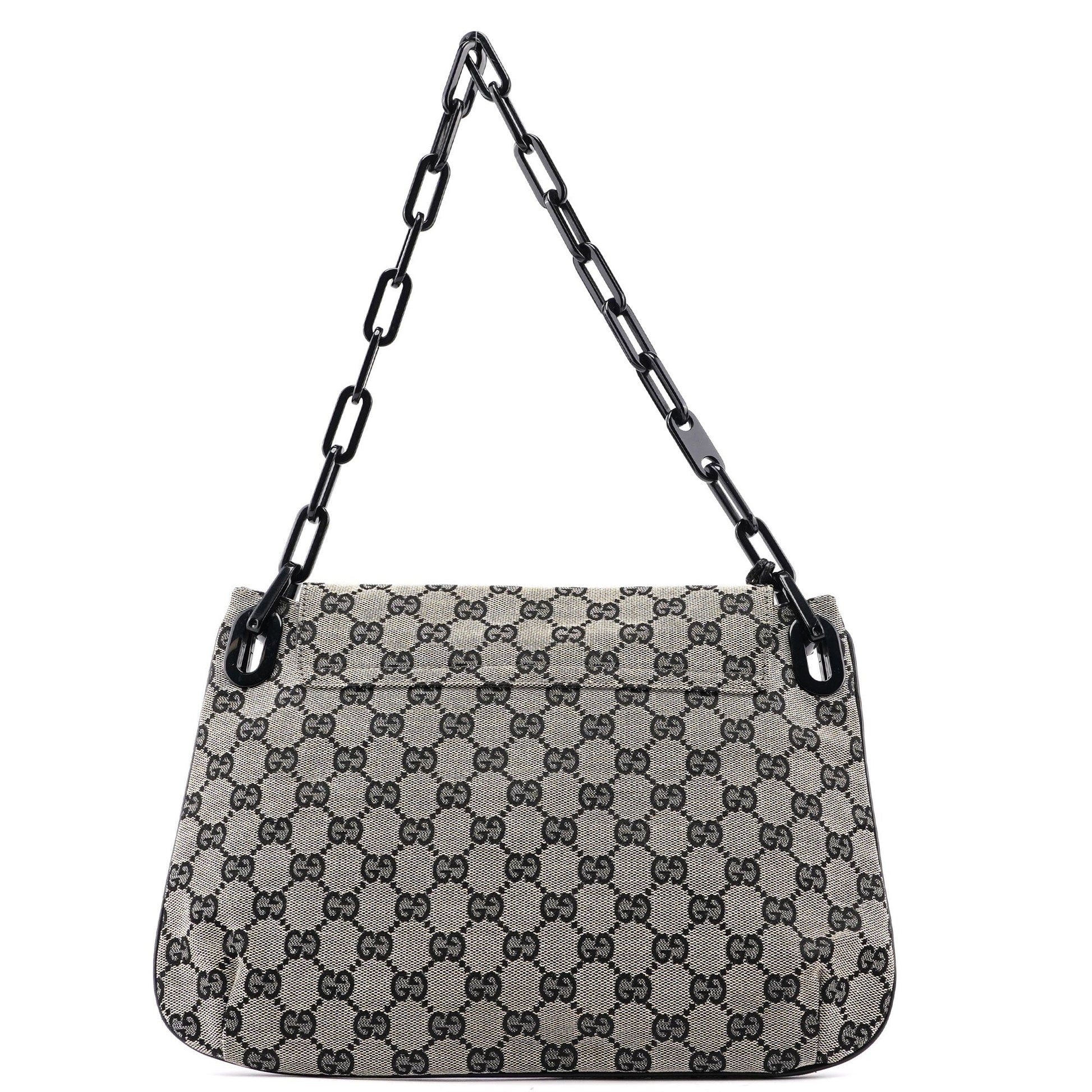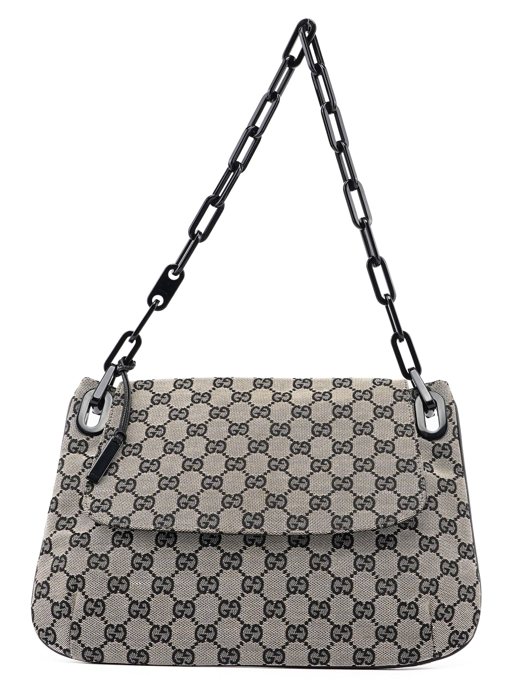 Handcrafted from beige GG monogram canvas with black calfskin leather trim, this Gucci GG Chain bag by Tom Ford from the 1990s features matte black and a gloss black plastic chain handle with Gucci logo engraving. The bag has a flap closure, a satin-lined interior with an interior pocket, and a Gucci logo plate attached, showcasing timeless elegance.