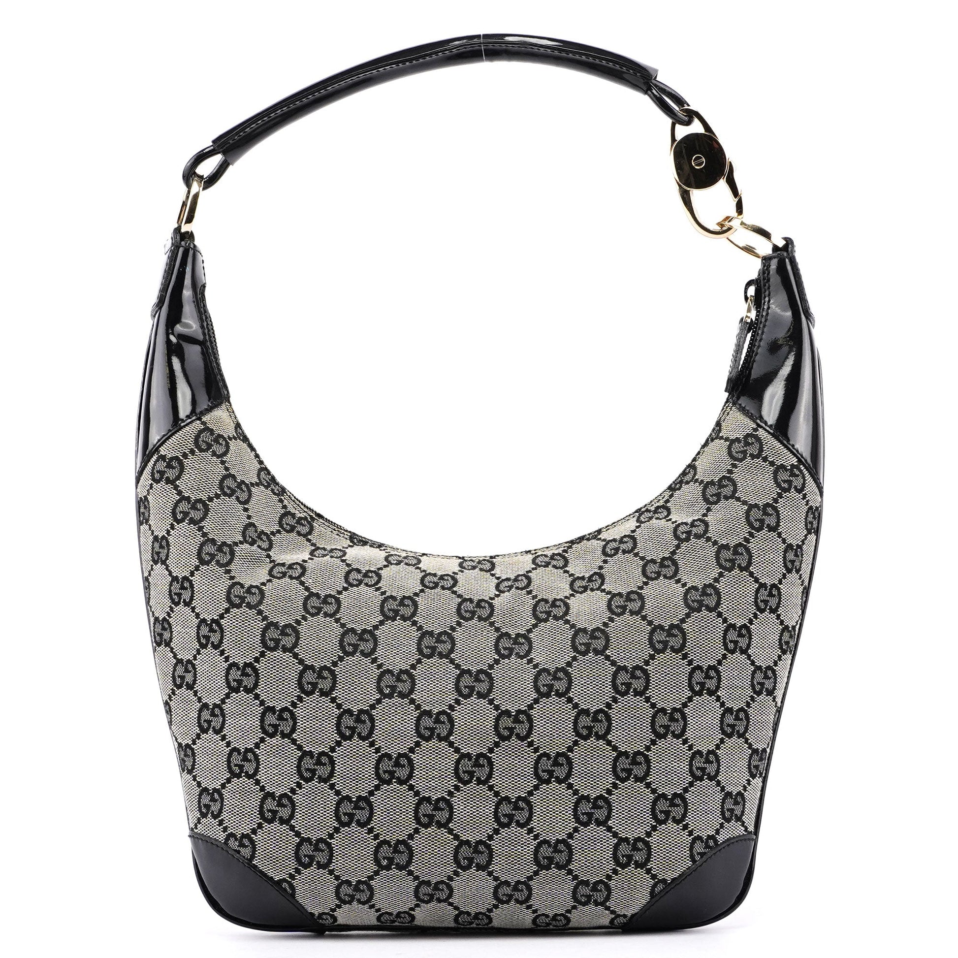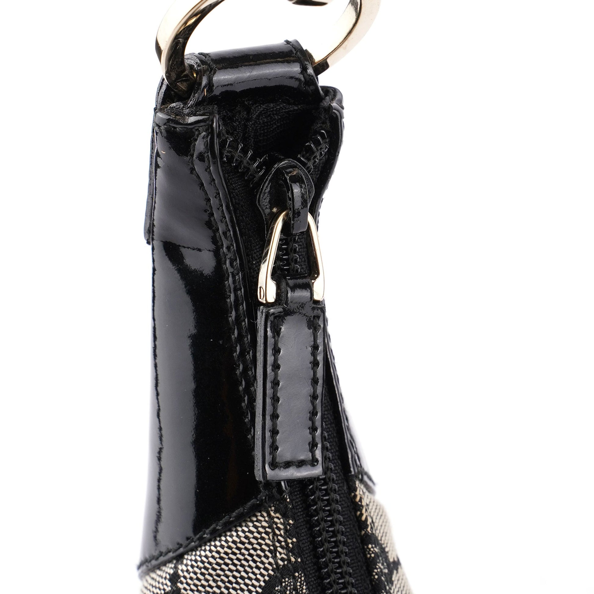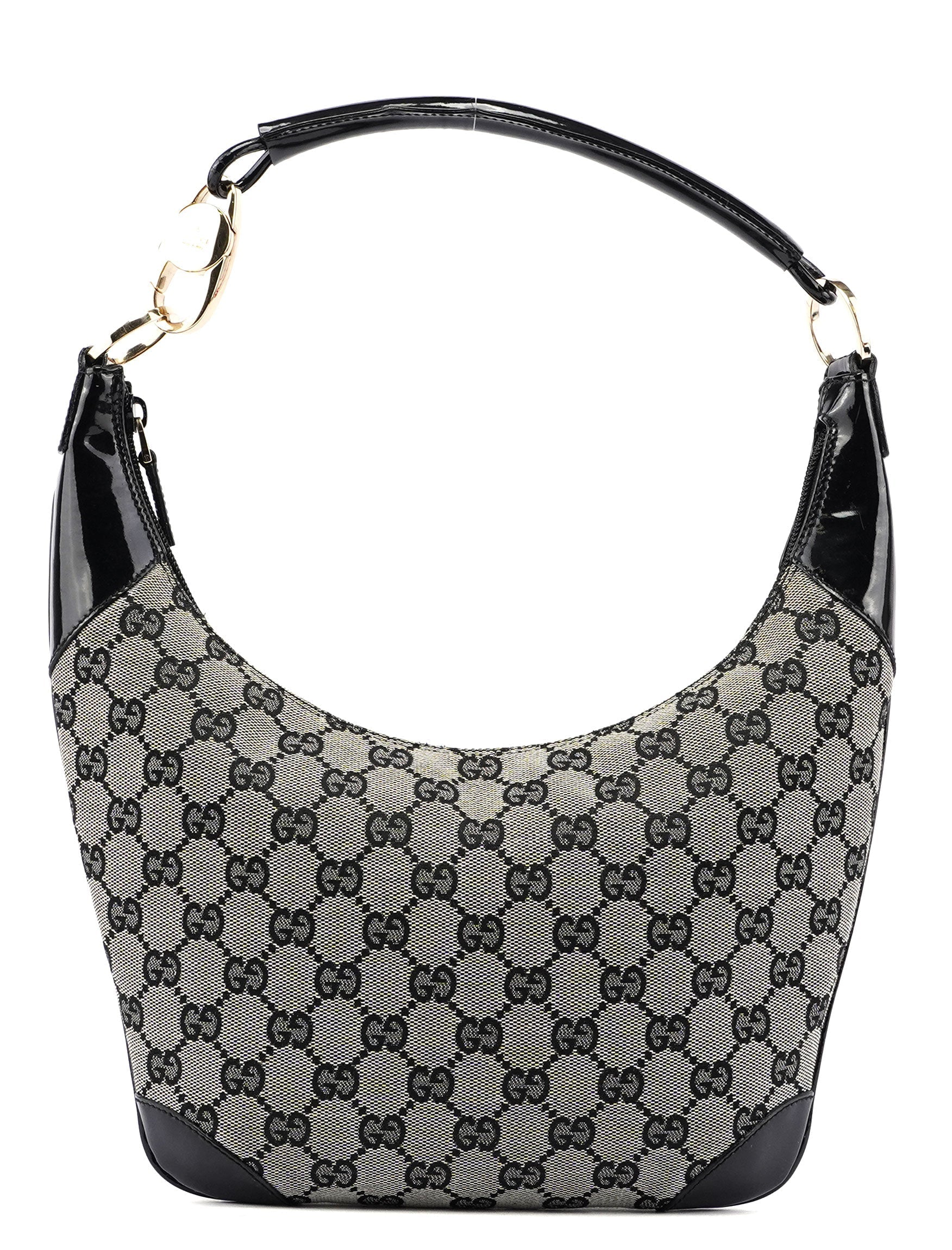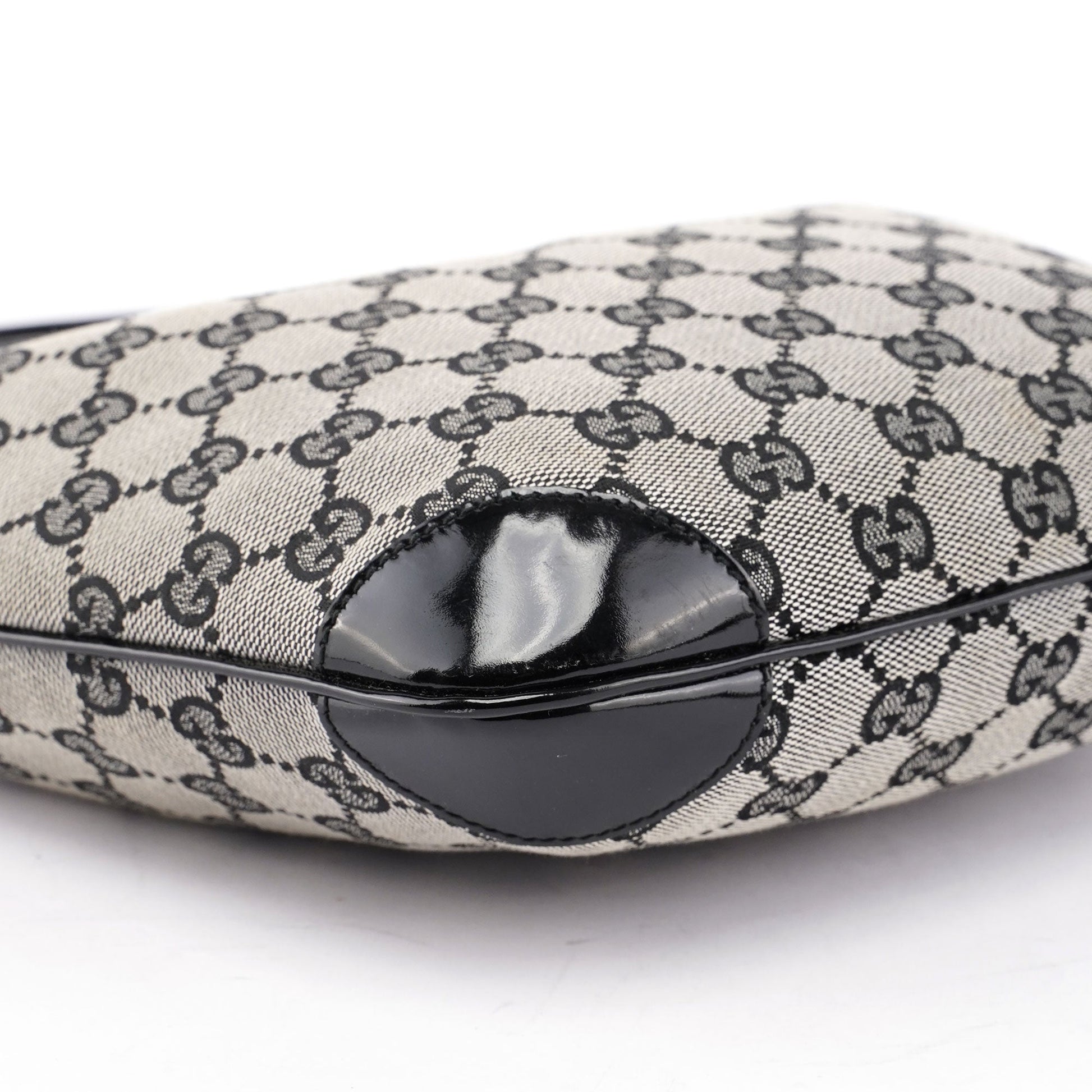 This Gucci GG shoulder bag, designed by Tom Ford in the late 1990s, combines grey GG monogram canvas with black patent leather trim and gold-tone Gucci-engraved hardware. It features a satin-lined interior with a zip pocket and zipper closure.