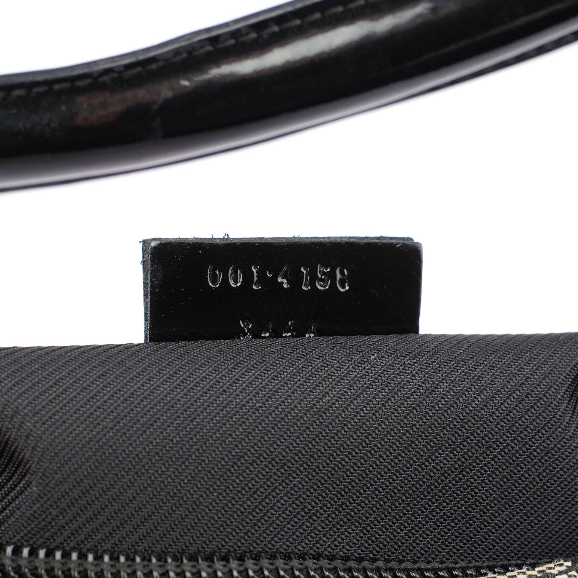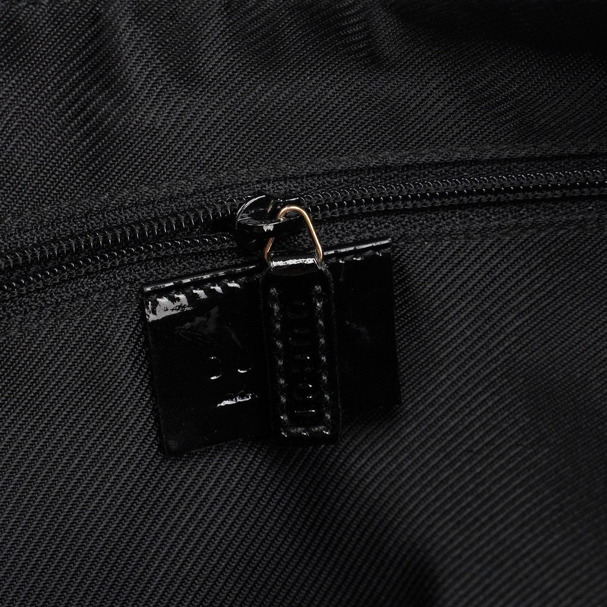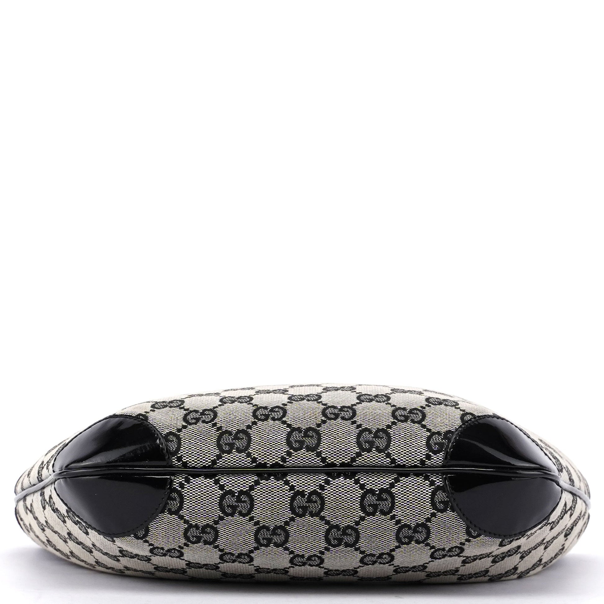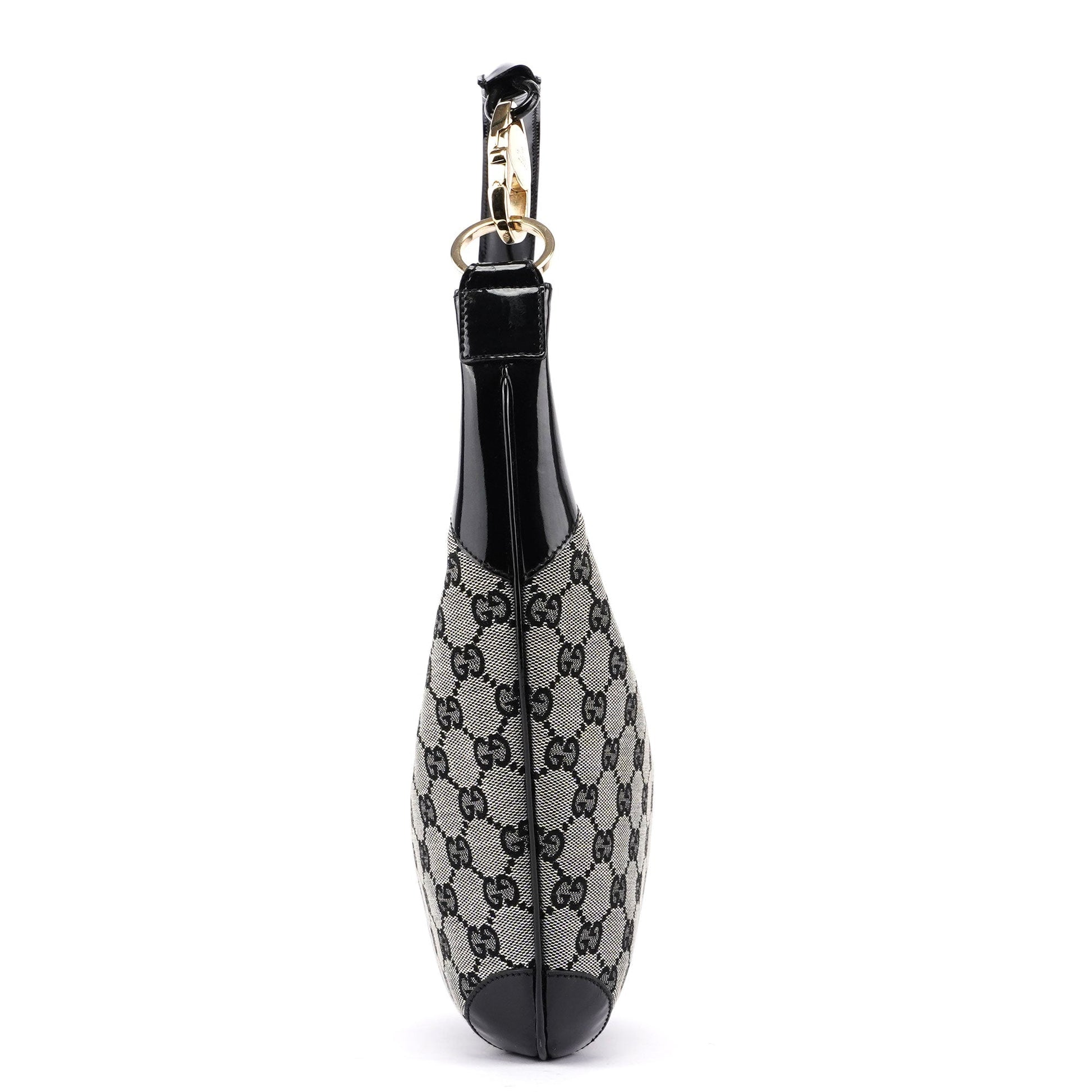 This Gucci GG shoulder bag, designed by Tom Ford in the late 1990s, combines grey GG monogram canvas with black patent leather trim and gold-tone Gucci-engraved hardware. It features a satin-lined interior with a zip pocket and zipper closure.