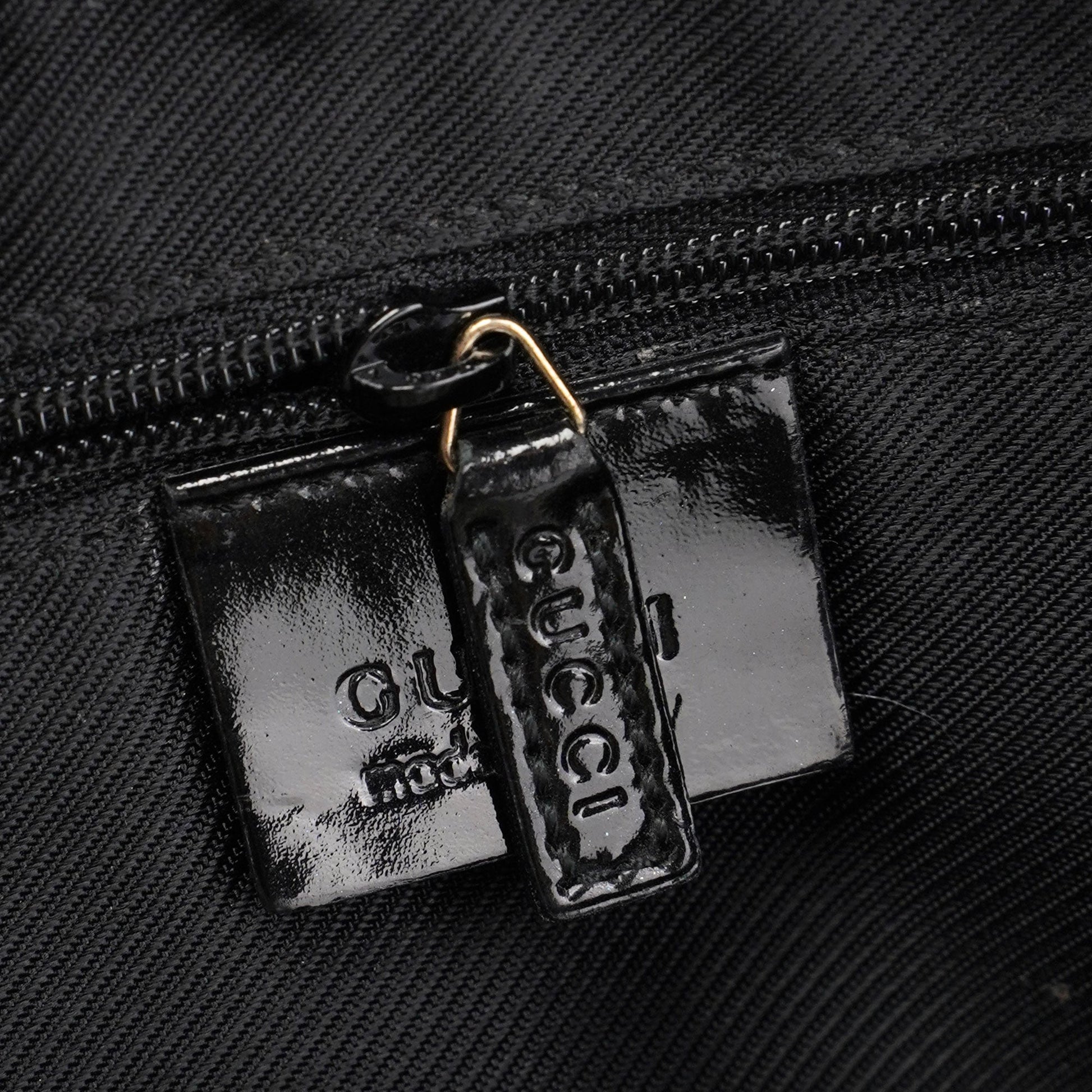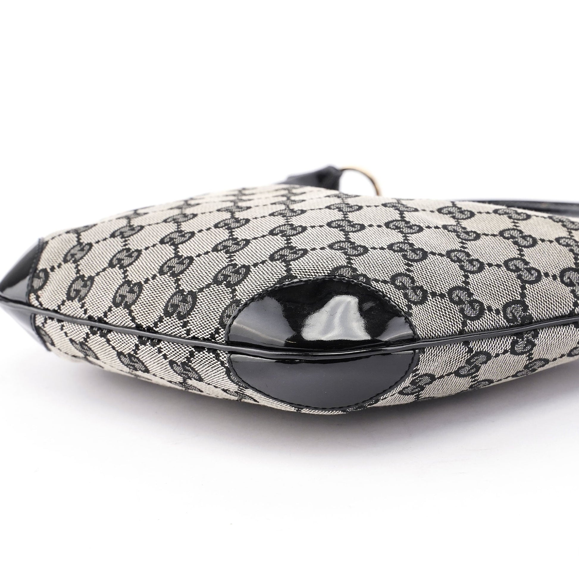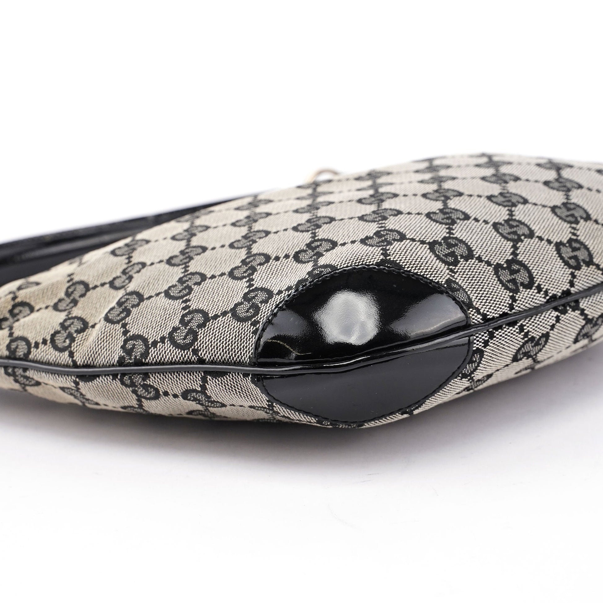 This Gucci GG shoulder bag, designed by Tom Ford in the late 1990s, combines grey GG monogram canvas with black patent leather trim and gold-tone Gucci-engraved hardware. It features a satin-lined interior with a zip pocket and zipper closure.