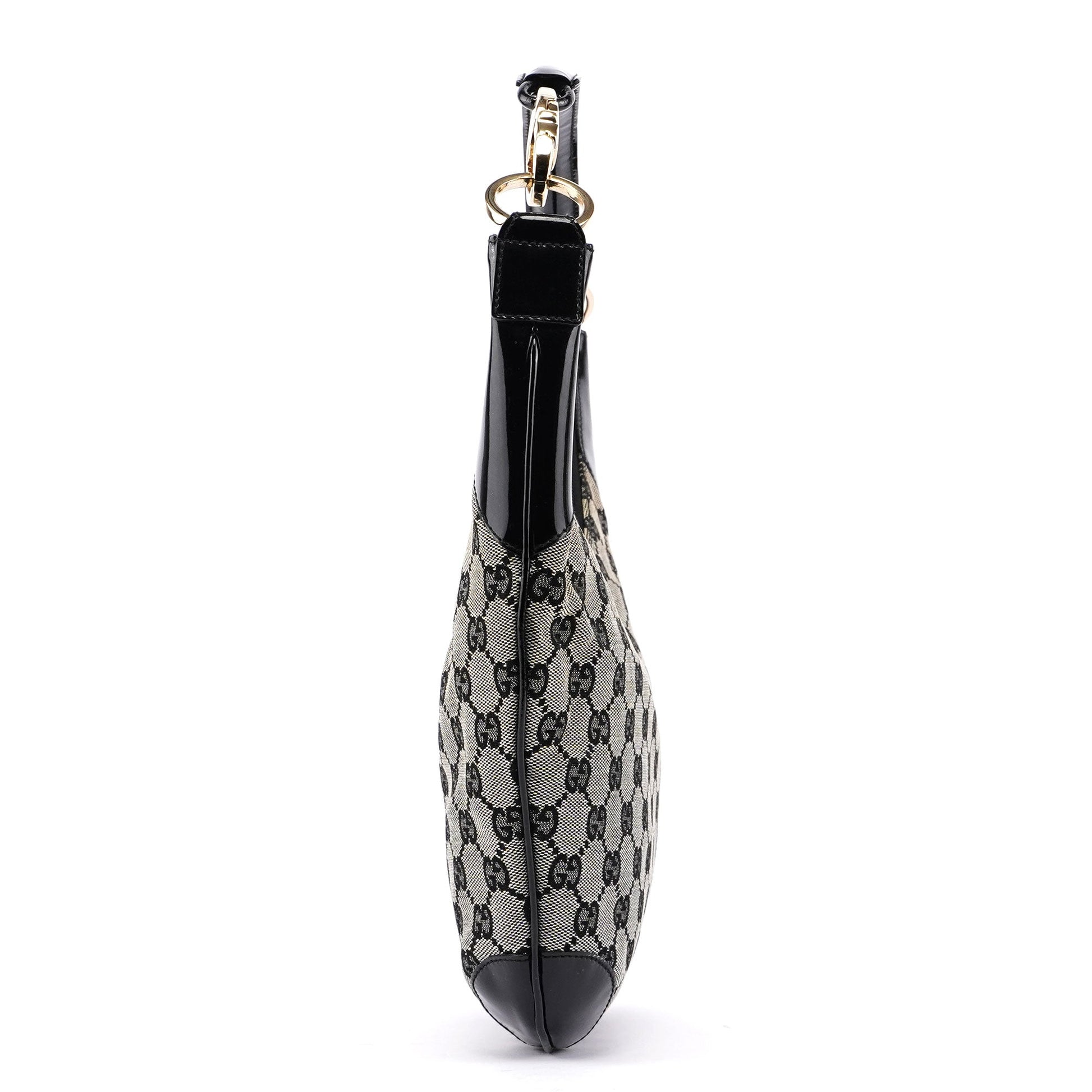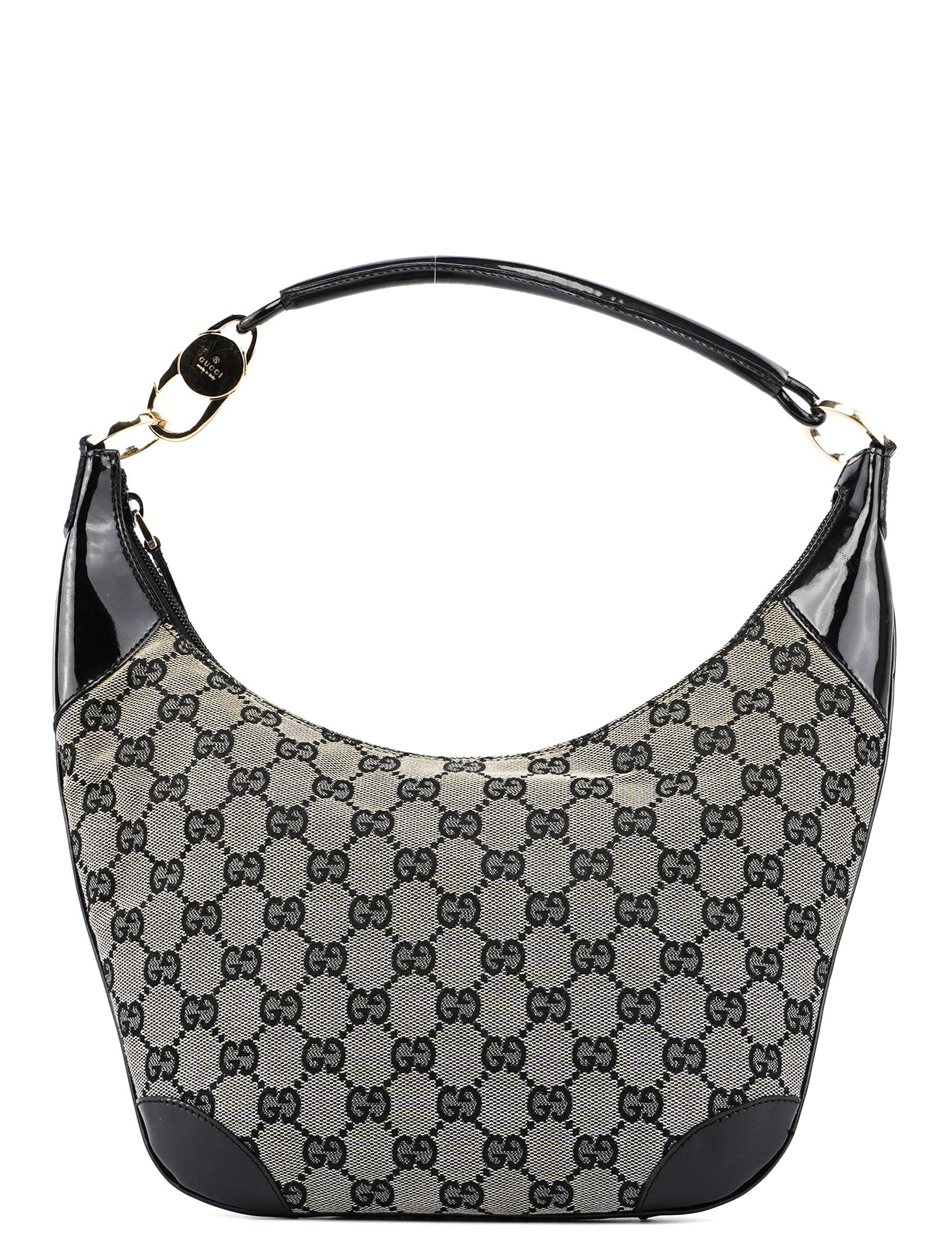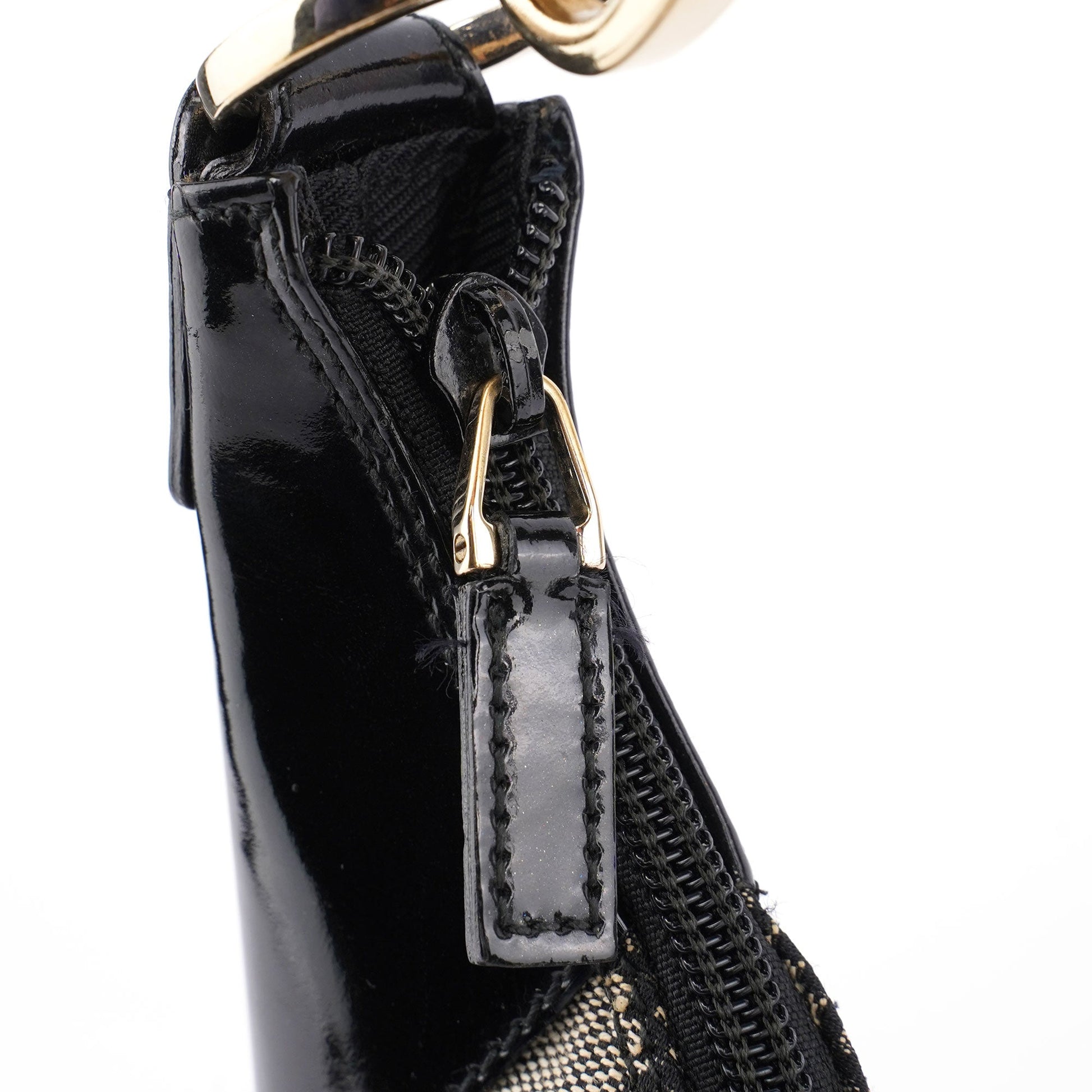 This Gucci GG shoulder bag, designed by Tom Ford in the late 1990s, combines grey GG monogram canvas with black patent leather trim and gold-tone Gucci-engraved hardware. It features a satin-lined interior with a zip pocket and zipper closure.