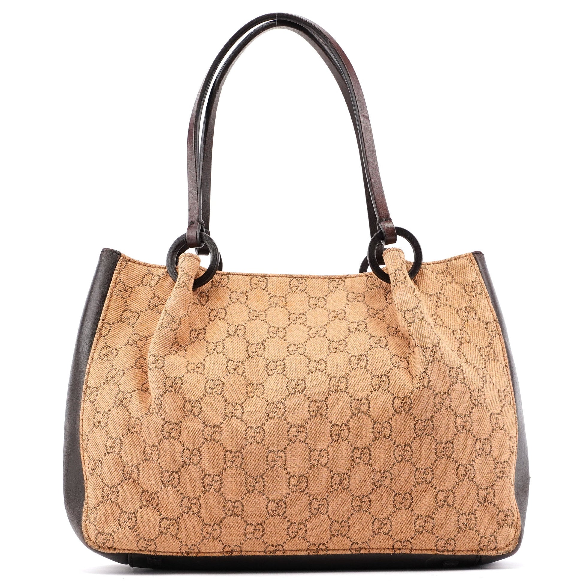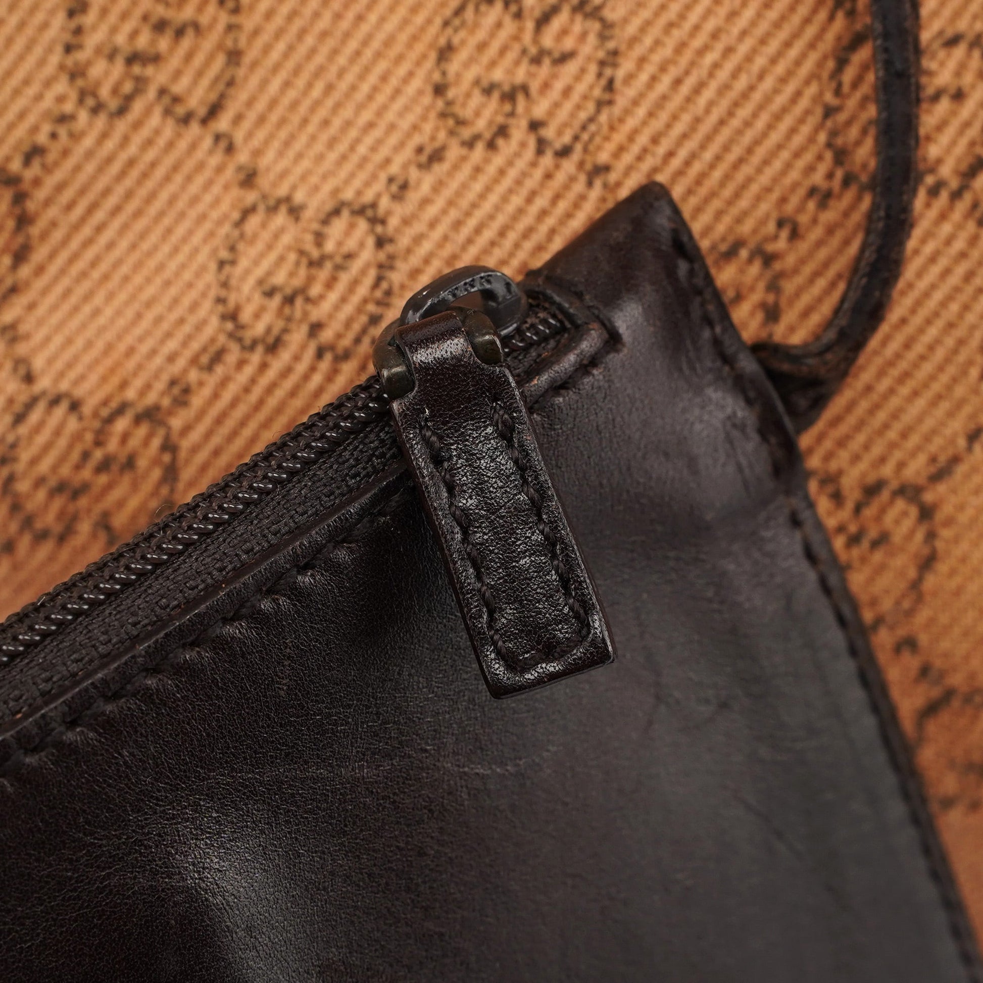 This Gucci GG Monogram bag by Tom Ford, circa late 1990s combines beige GG canvas with brown calfskin leather trim. Its secure magnetic closure and an attached pouch offers practicality, while the cotton-lined interior offer luxury. The subtle Gucci charm adds a touch of heritage.