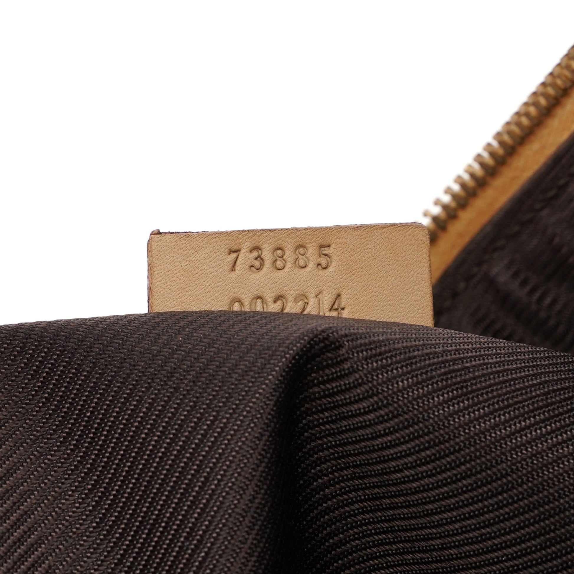 This Gucci GG hobo shoulder bag was designed by Tom Ford in the late 1990s. Handcrafted from beige GG monogram with gold-tone hardware and tonal calfskin leather trim, it features satin-lined interior which includes a zipper pocket for organization, with a Gucci logo plate at the bottom front adding a touch of luxury.
