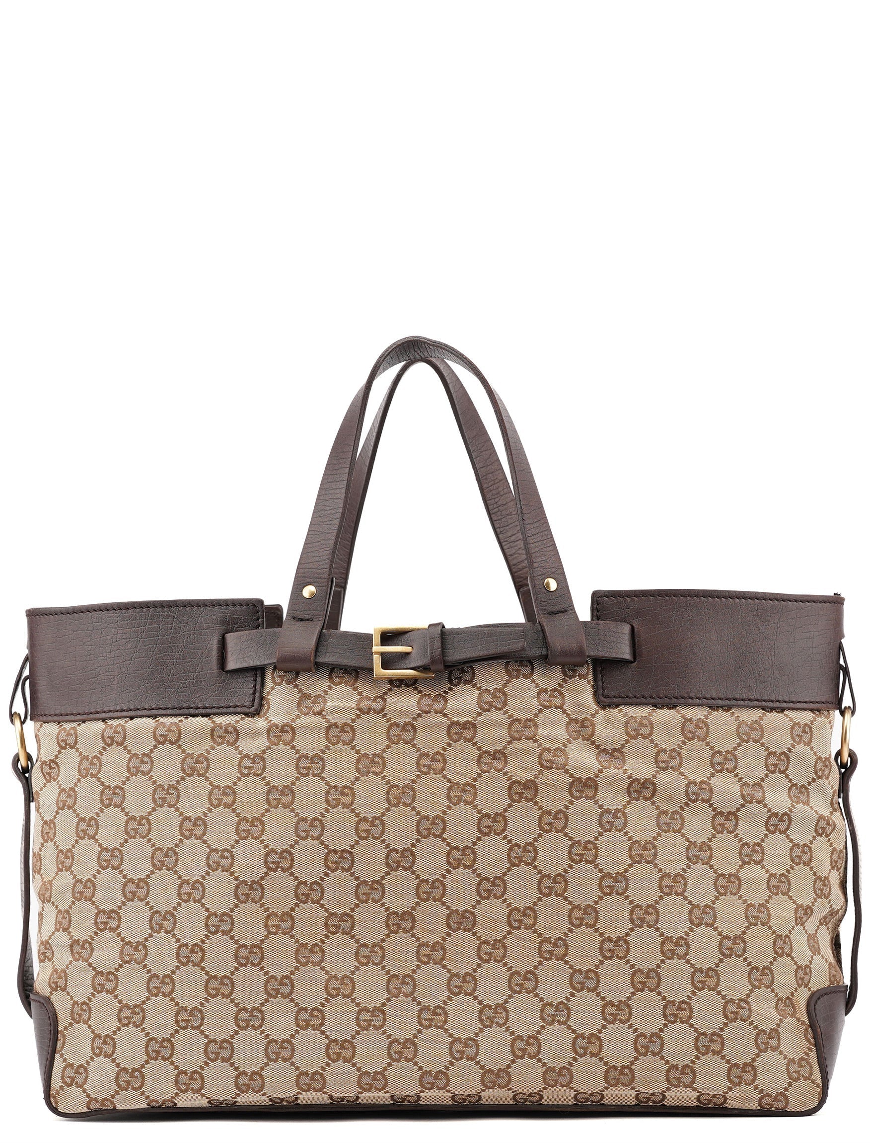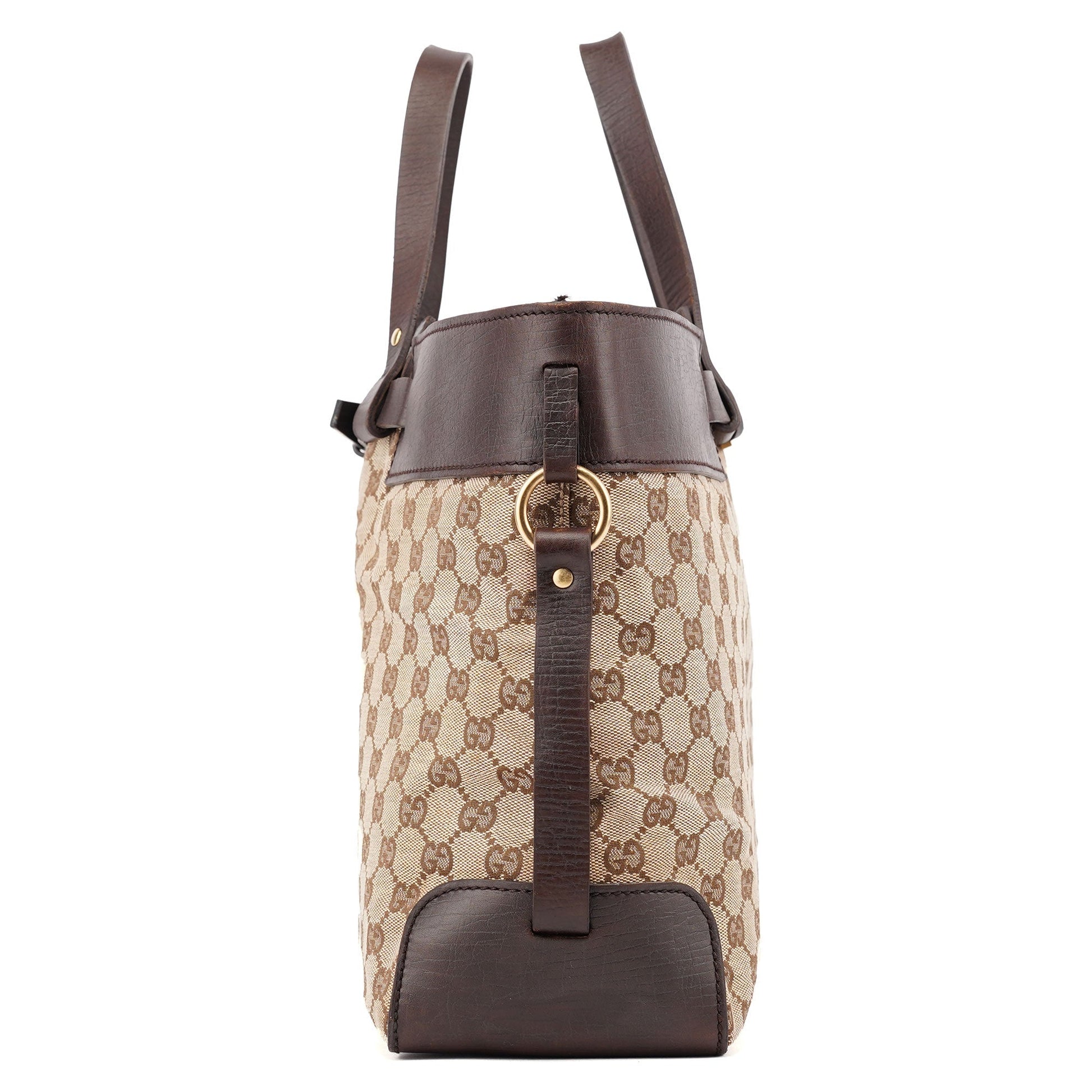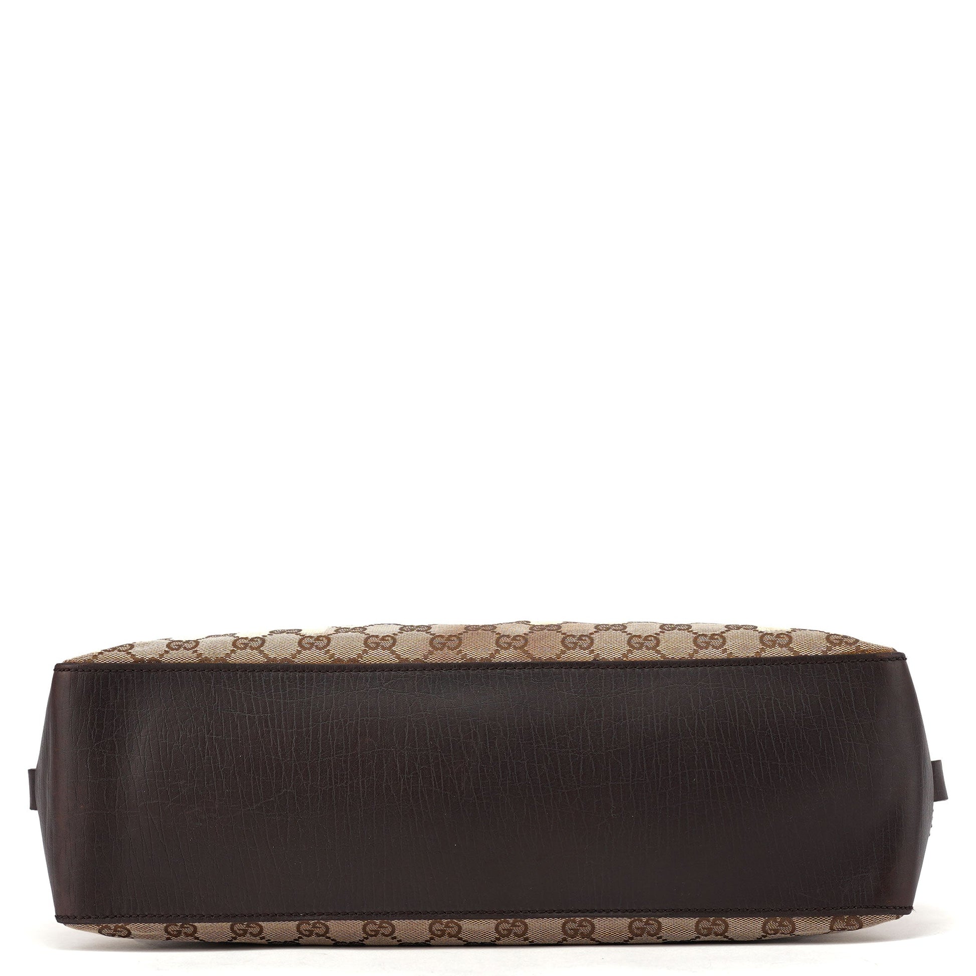 Designed by Tom Ford in the late 1990s, this large Gucci GG tote is crafted from beige monogram canvas with brown calfskin leather trim and gold-tone hardware. The cotton-lined interior includes a zipper pocket, balancing iconic style with everyday function.