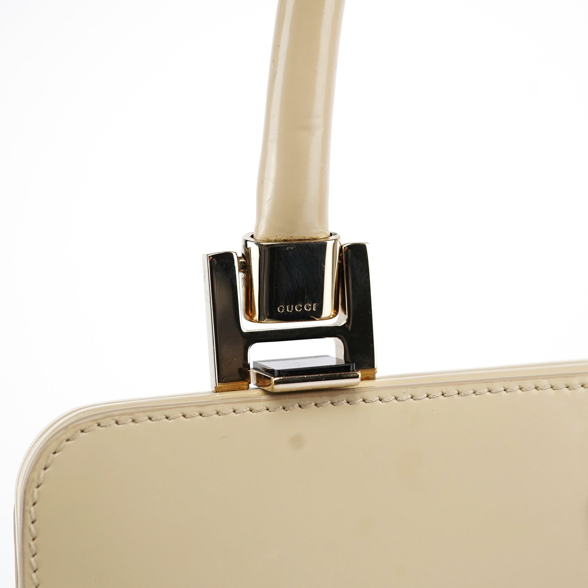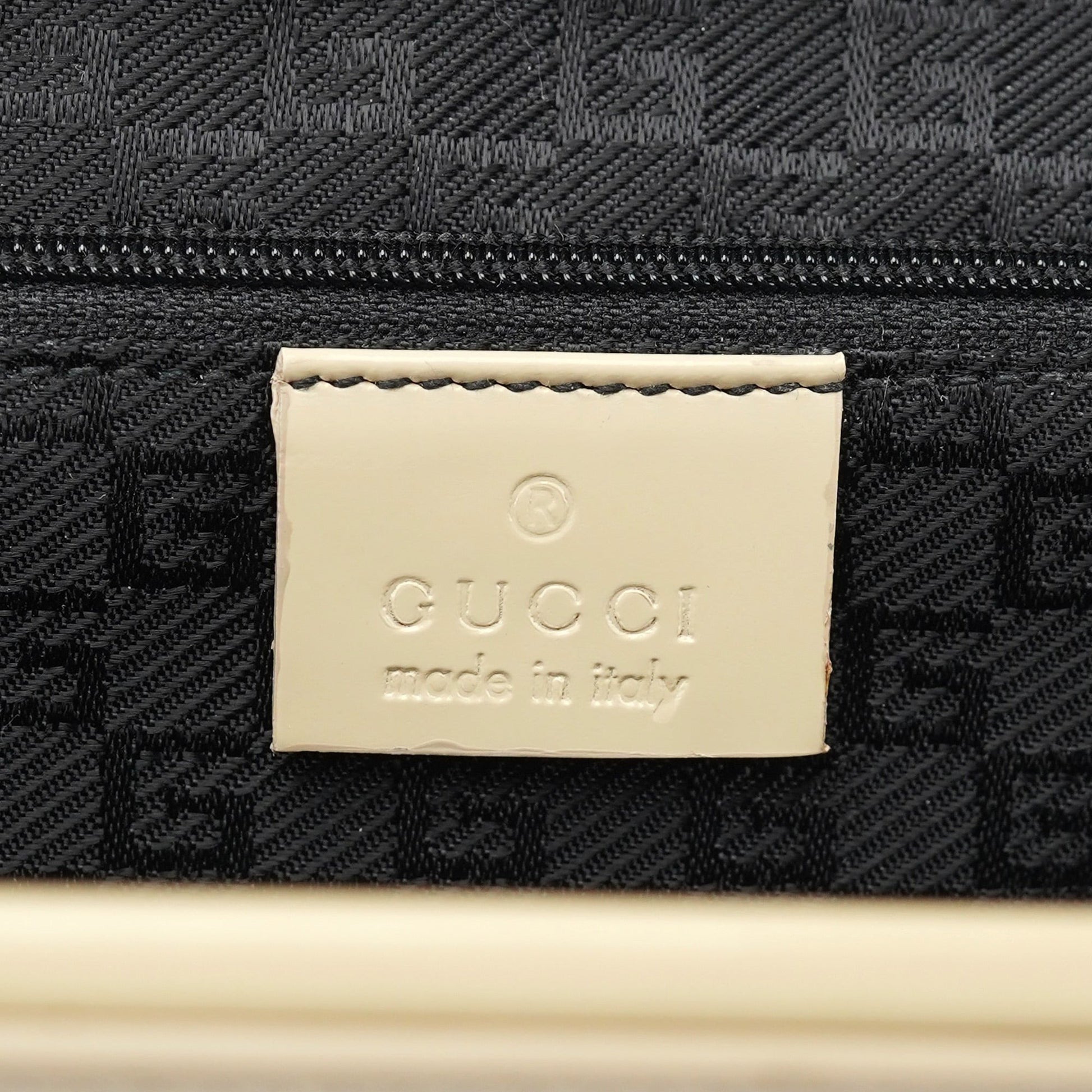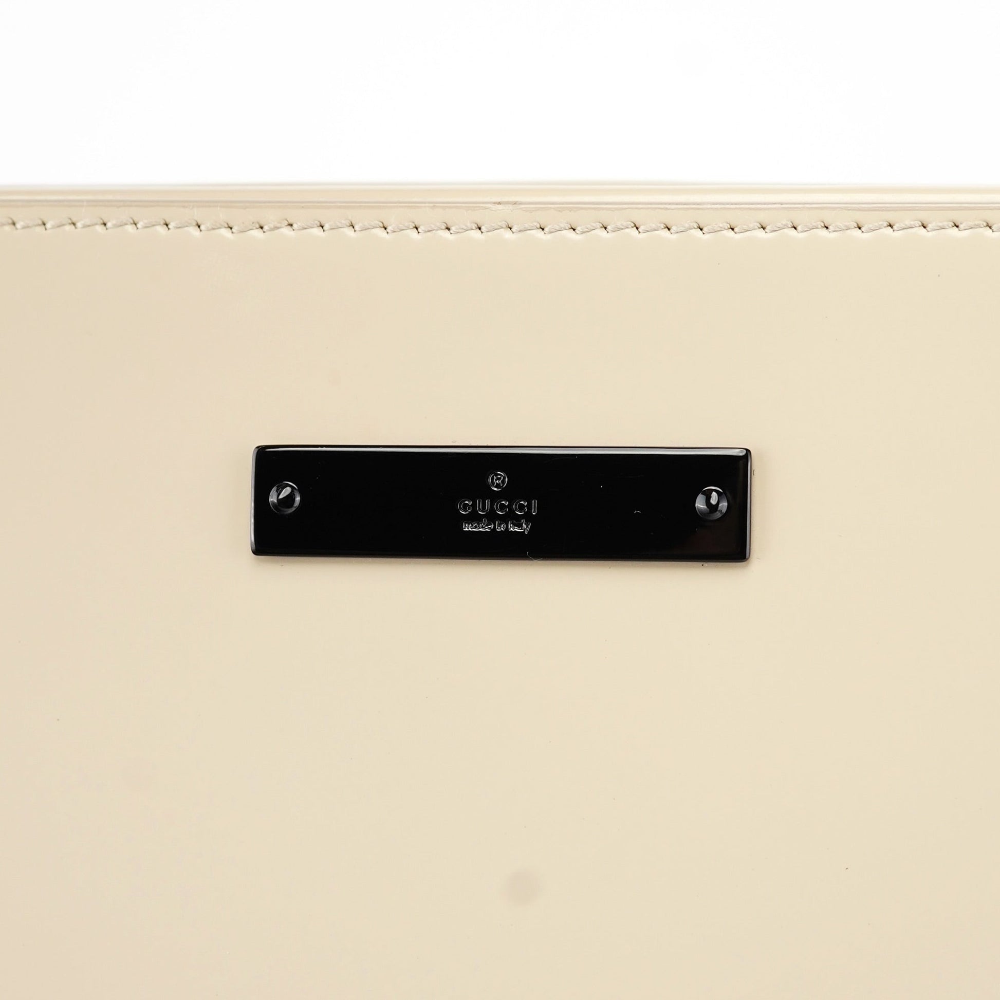 Designed by Tom Ford in the late 1990s, this Gucci shoulder bag is handcrafted from beige patent leather with gloss black and silver-tone hardware engraved with the Gucci logo. It features a clutch-style closure, satin-lined interior with a zipper pocket, and a Gucci logo plate at the front.