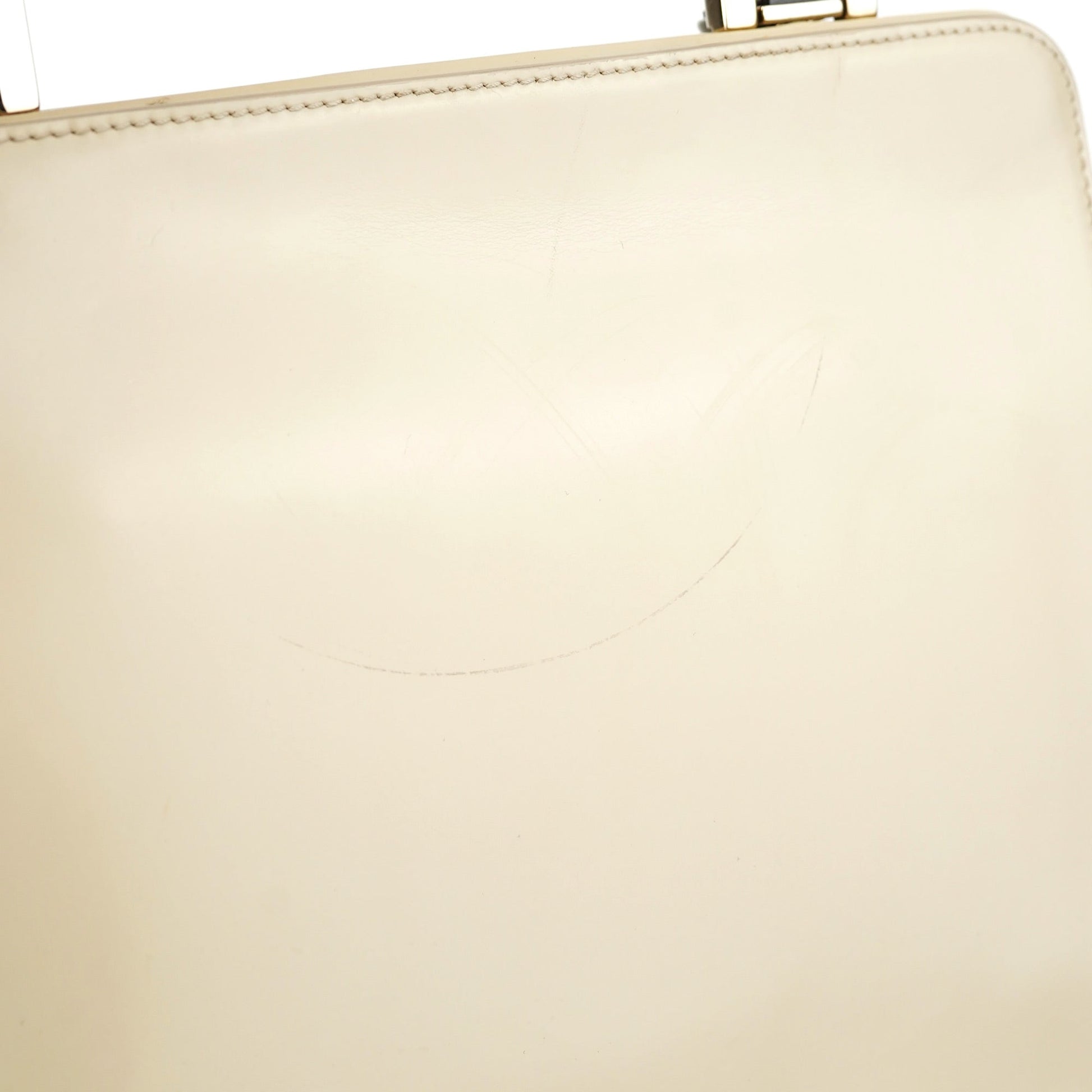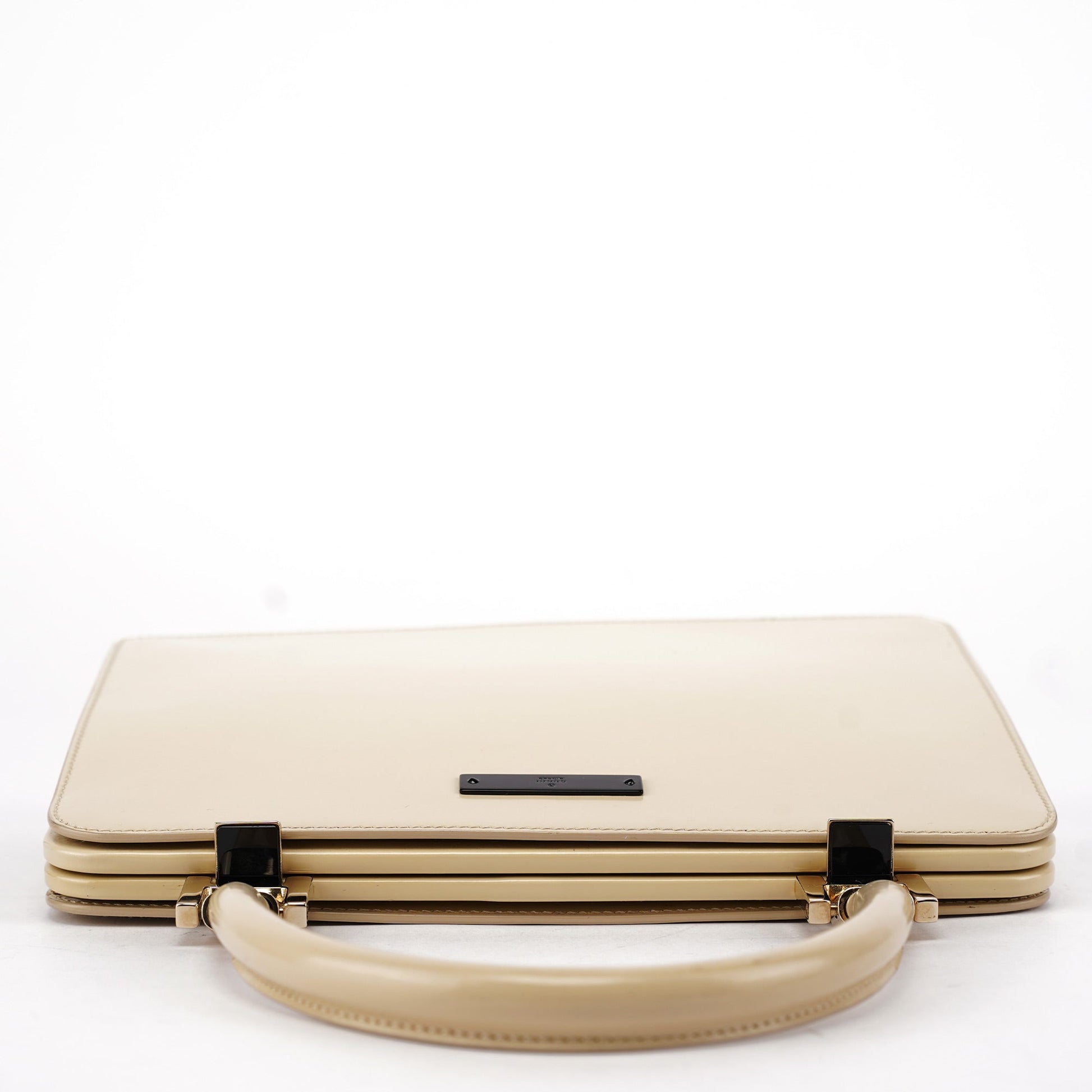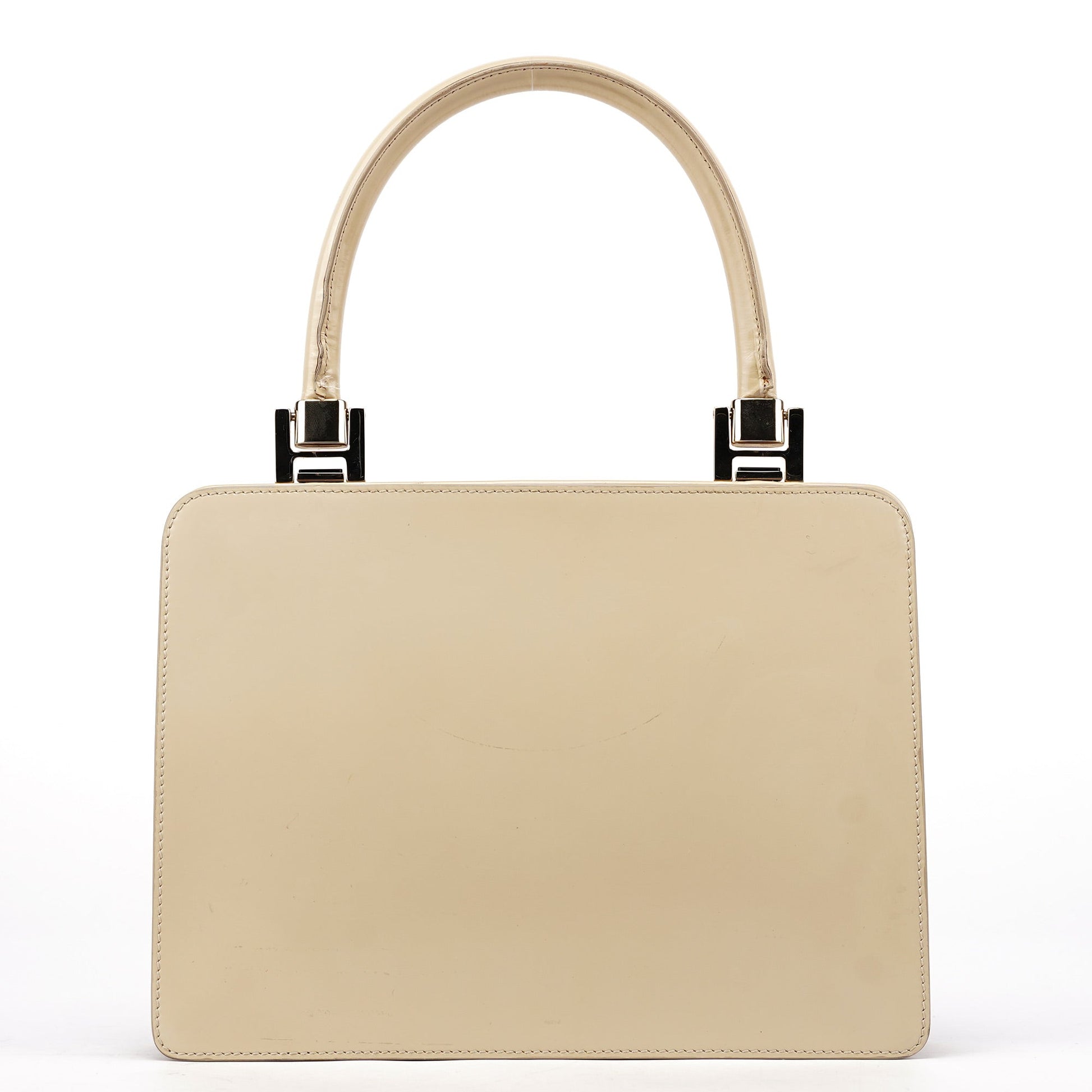 Designed by Tom Ford in the late 1990s, this Gucci shoulder bag is handcrafted from beige patent leather with gloss black and silver-tone hardware engraved with the Gucci logo. It features a clutch-style closure, satin-lined interior with a zipper pocket, and a Gucci logo plate at the front.
