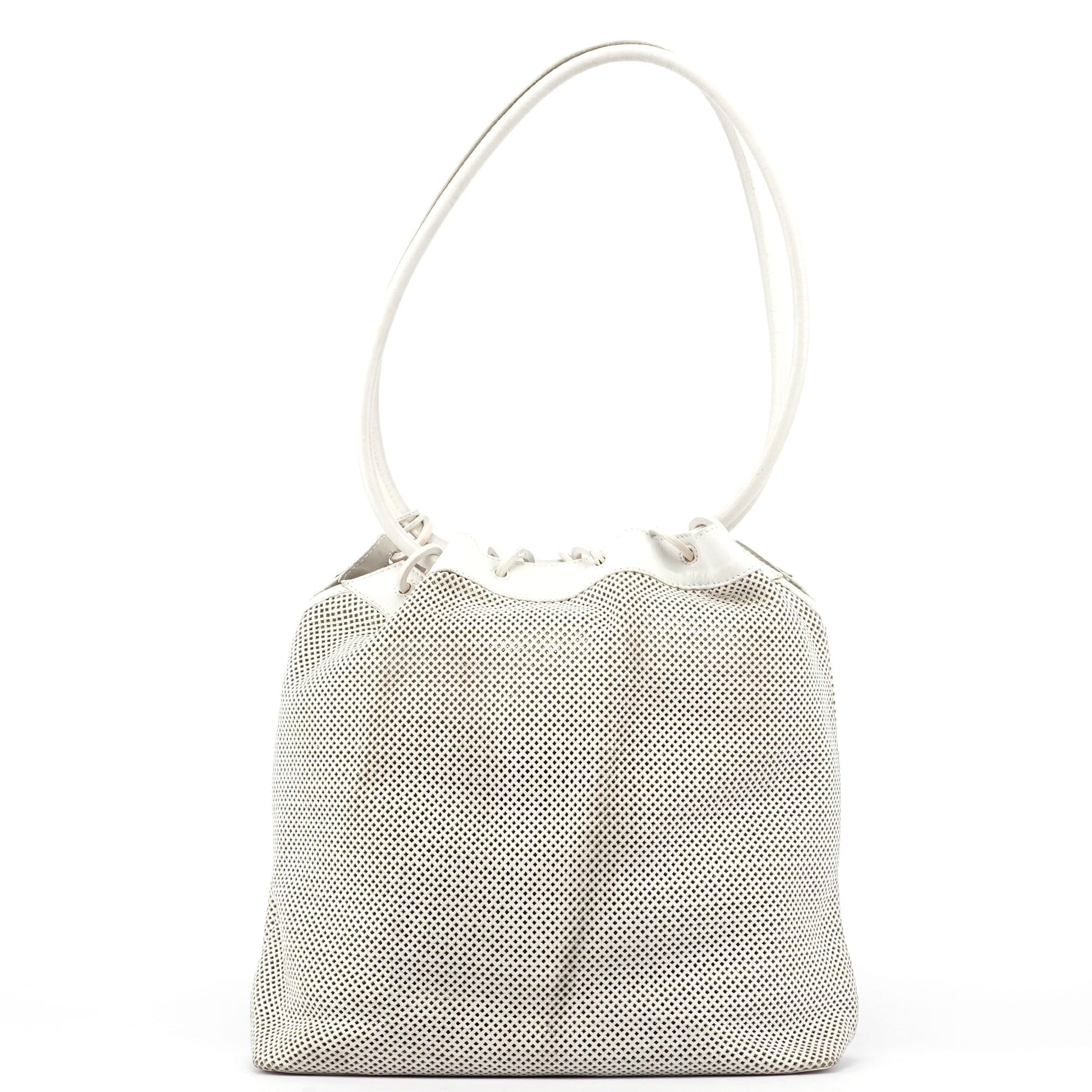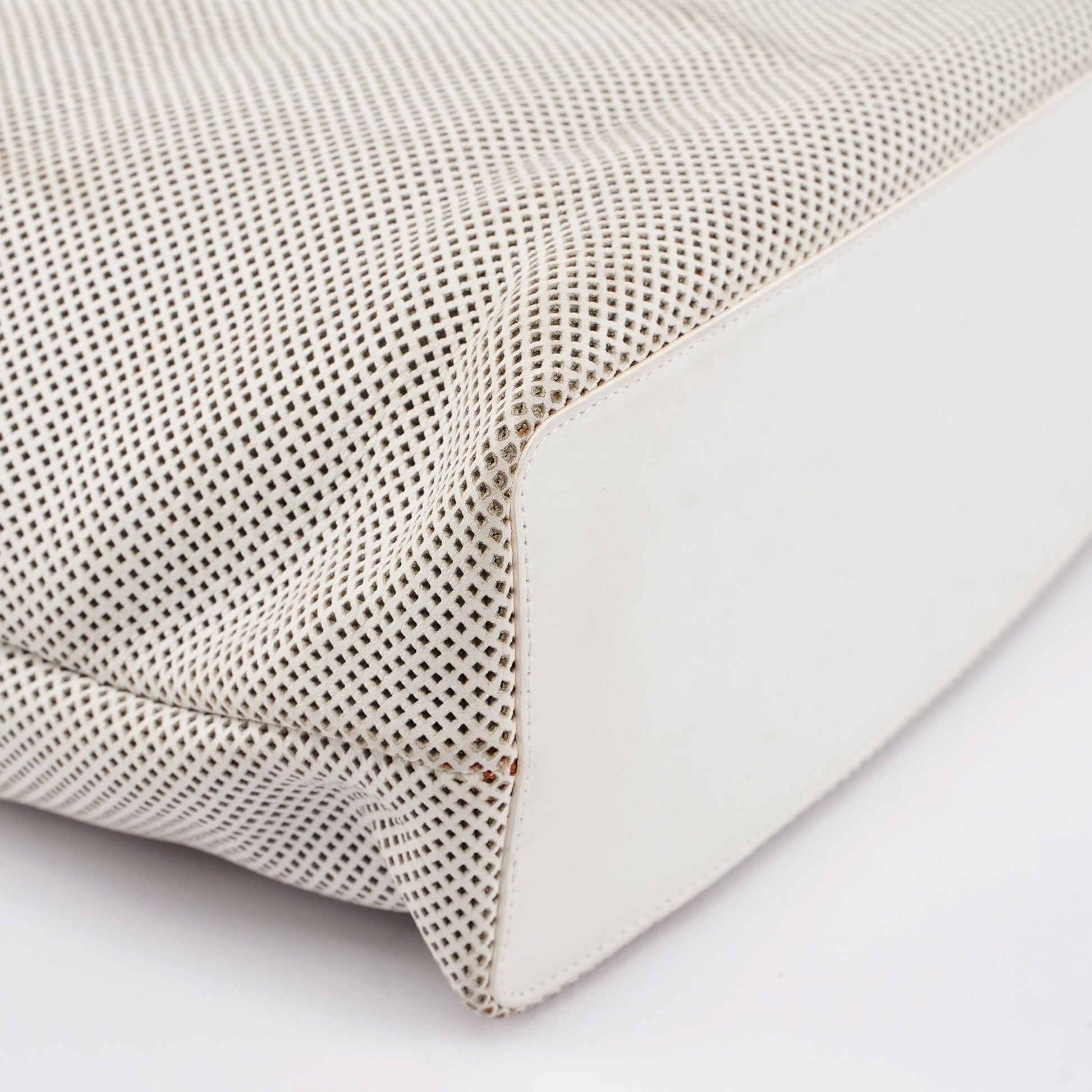 Designed by Tom Ford, this Gucci shoulder bag features white perforated leather, complemented by gold-tone hardware and a Gucci logo plate charm. The bag includes a removable suede GG monogram pouch which acts as its interior.