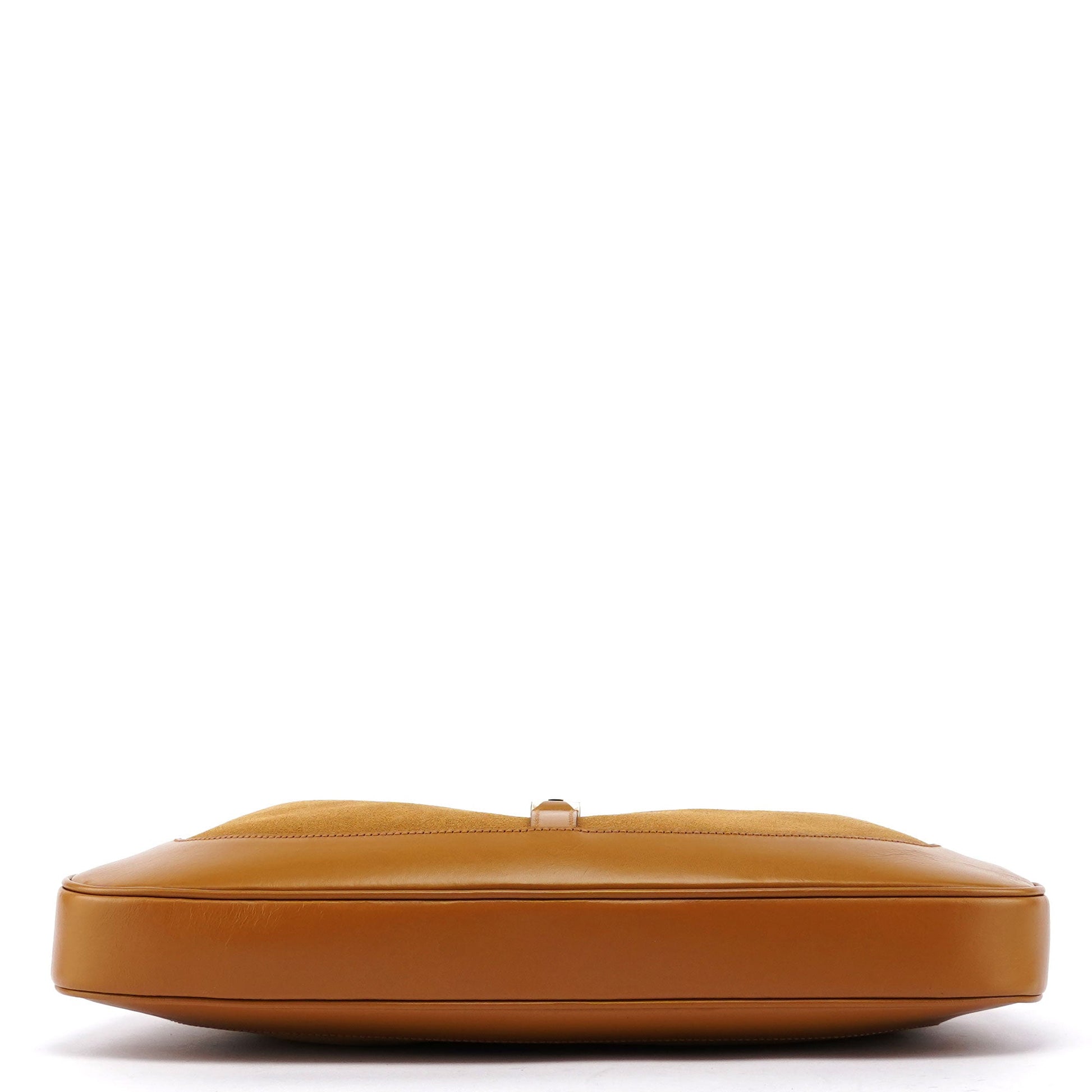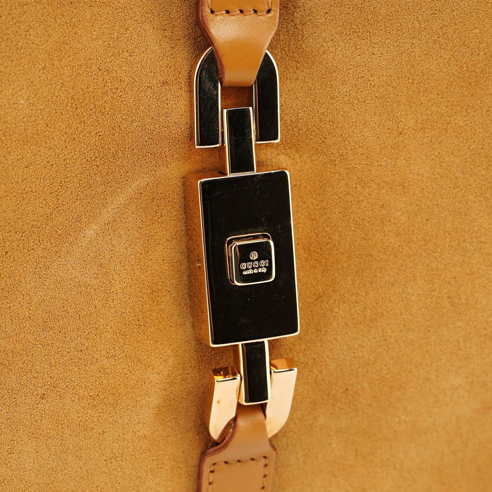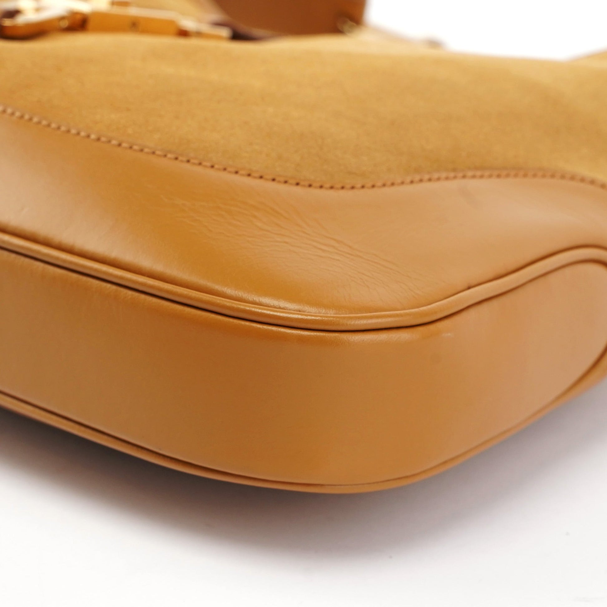 Designed by Tom Ford in the late 1990s, this Gucci Jackie Chain bag is handcrafted in beige suede with tonal calfskin leather trim, accented by gold-tone hardware. It features a gold-tone chain handle with Gucci logo engraving and the classic Jackie style closure. The interior, lined with satin includes an interior zipper pocket, marries functional design with Gucci's timeless aesthetic.