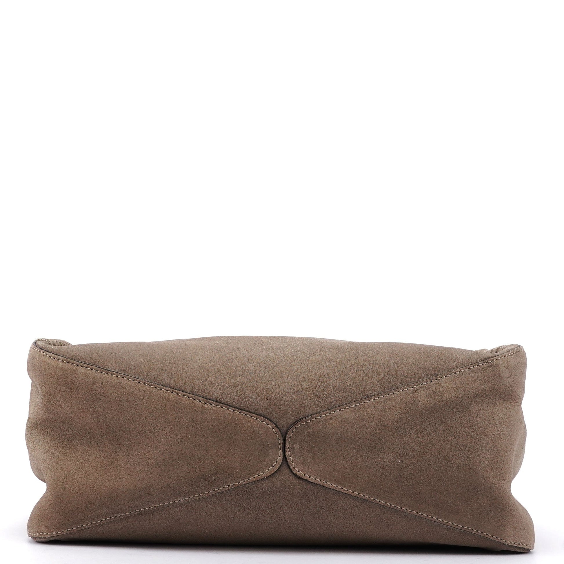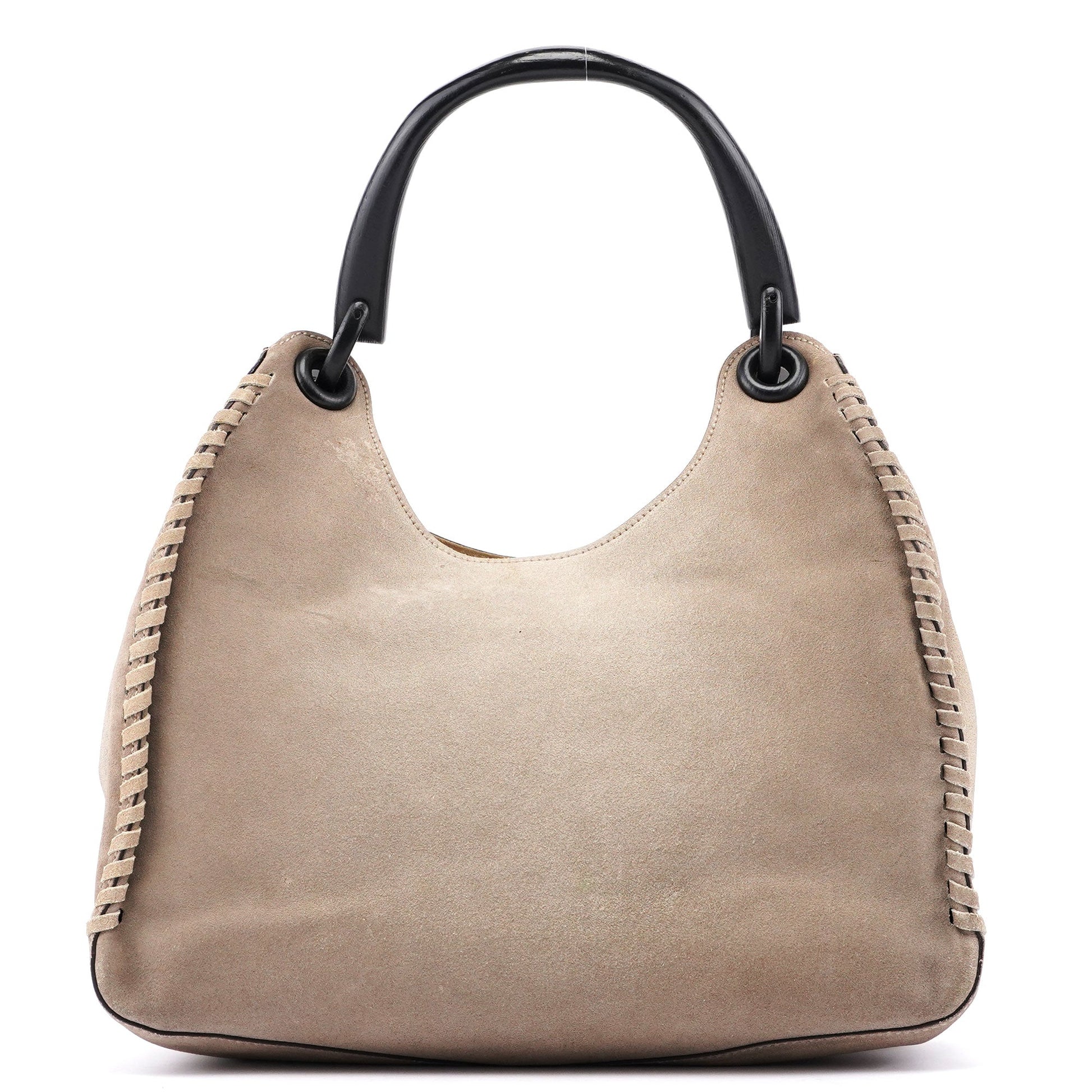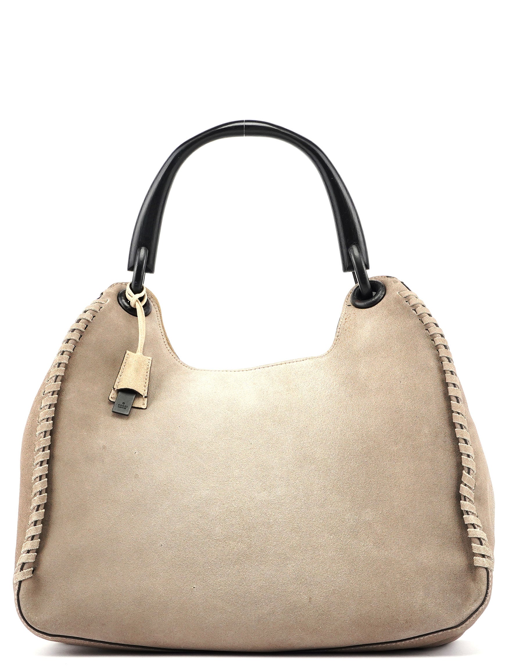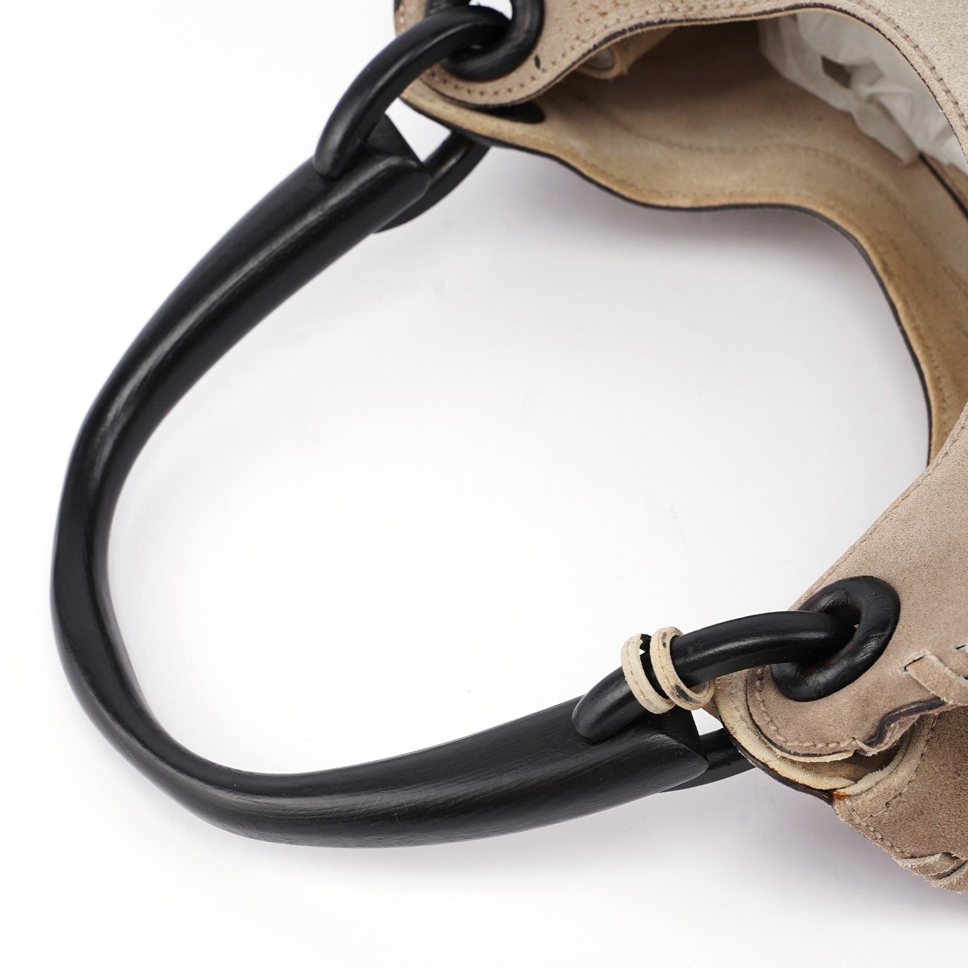 Designed by Tom Ford for the 2003 collection, this Gucci top handle bag is handcrafted in luxurious beige suede. It boasts a wooden handle and a chic logo bangle attached to the handle. The suede-lined interior includes a handy zipper pocket for organization.