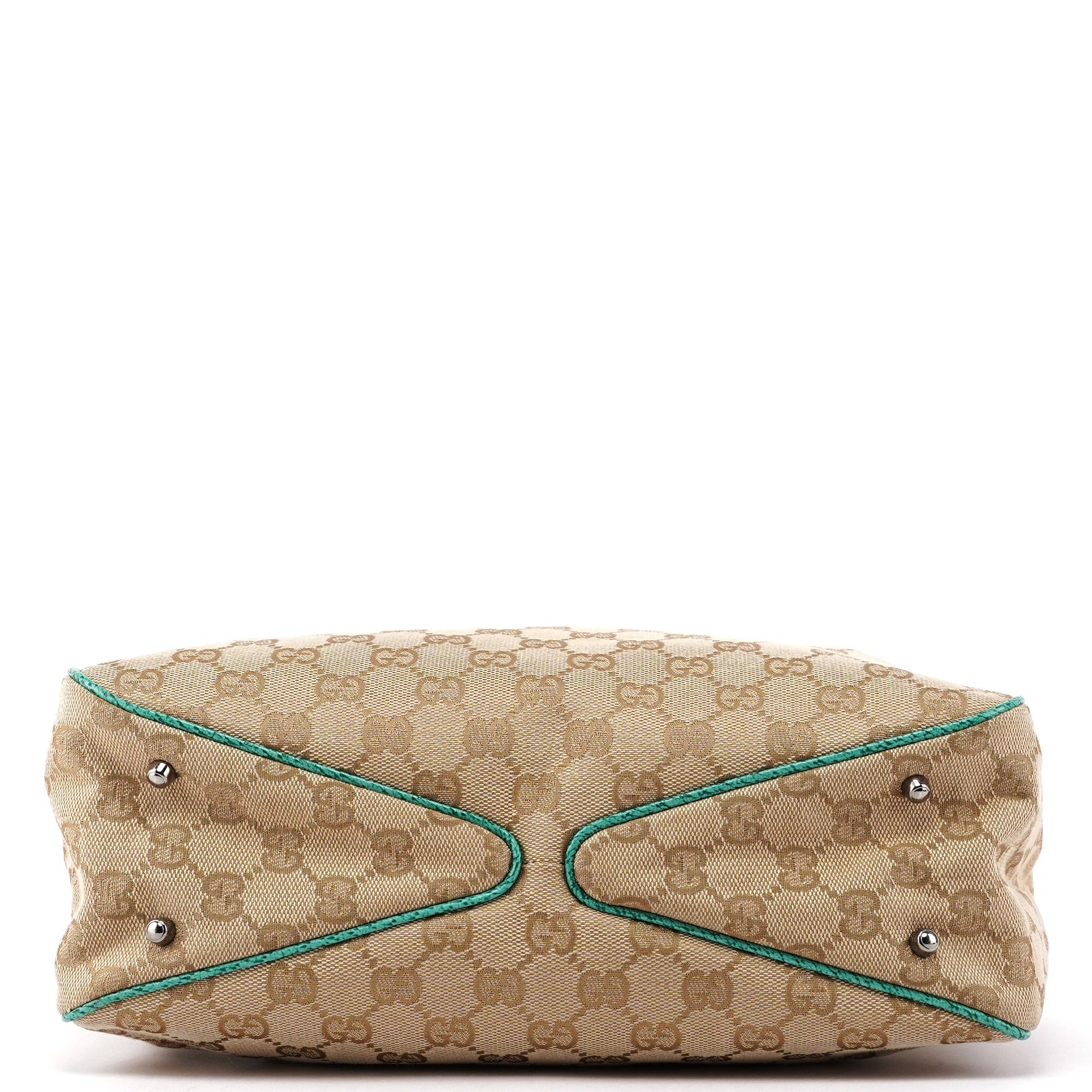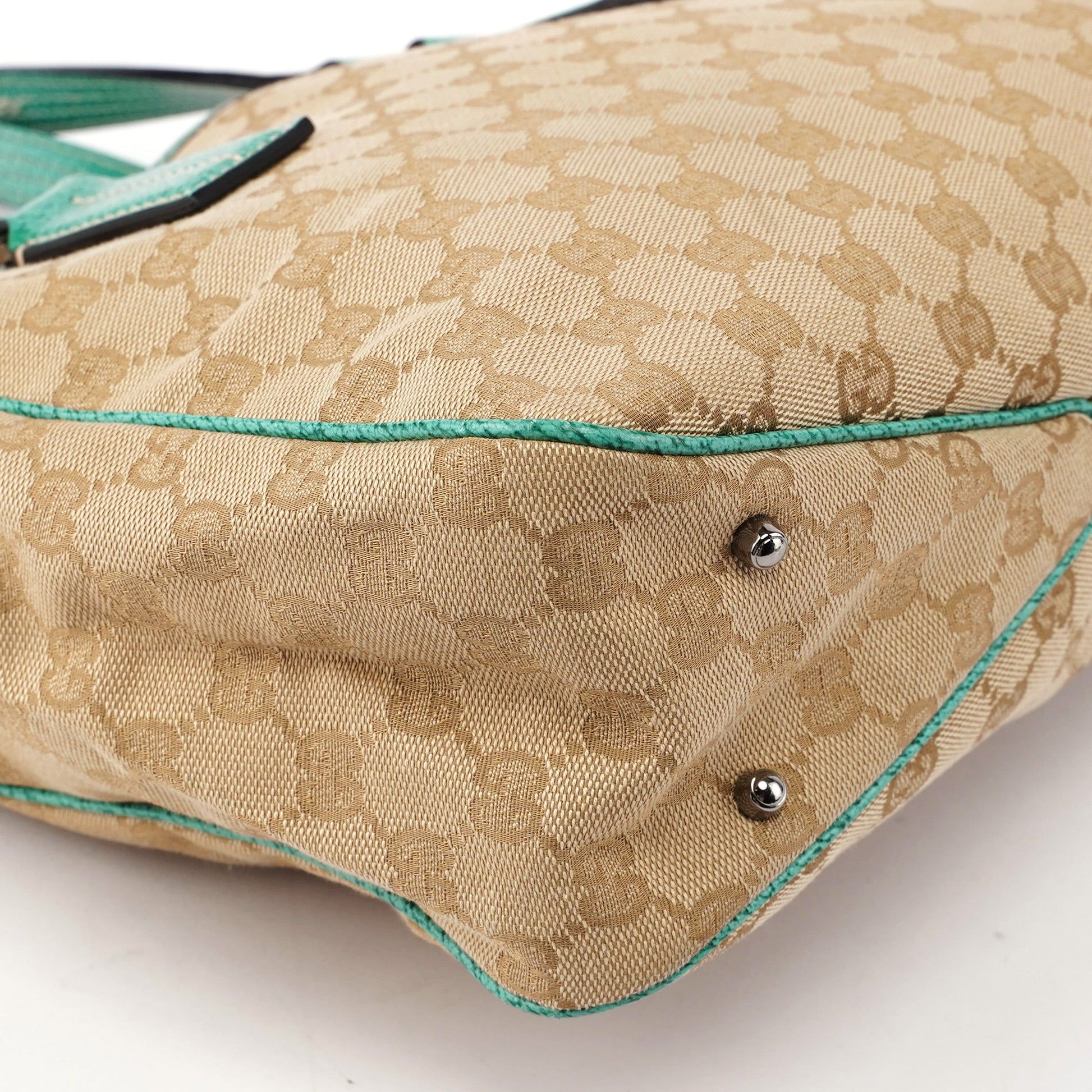 Designed by Tom Ford in the early 2000's, this Gucci GG tote bag features a beige canvas GG monogram with turquoise leather trim. The silver-tone hardware adds a touch of elegance. Inside, the cotton-lined interior includes a handy zipper pocket.