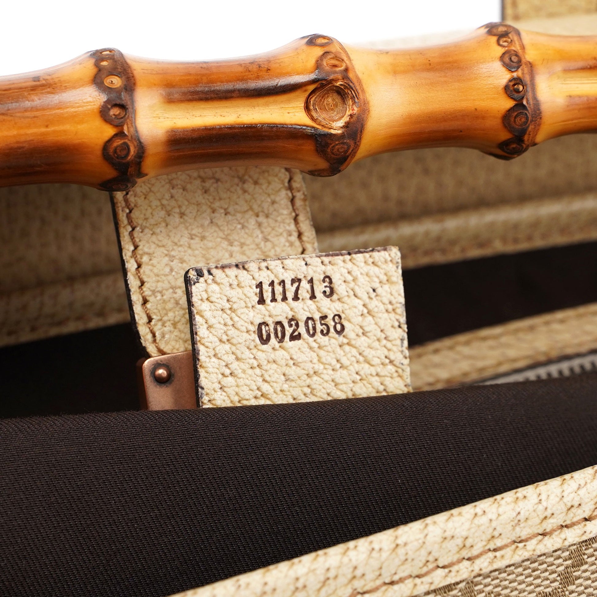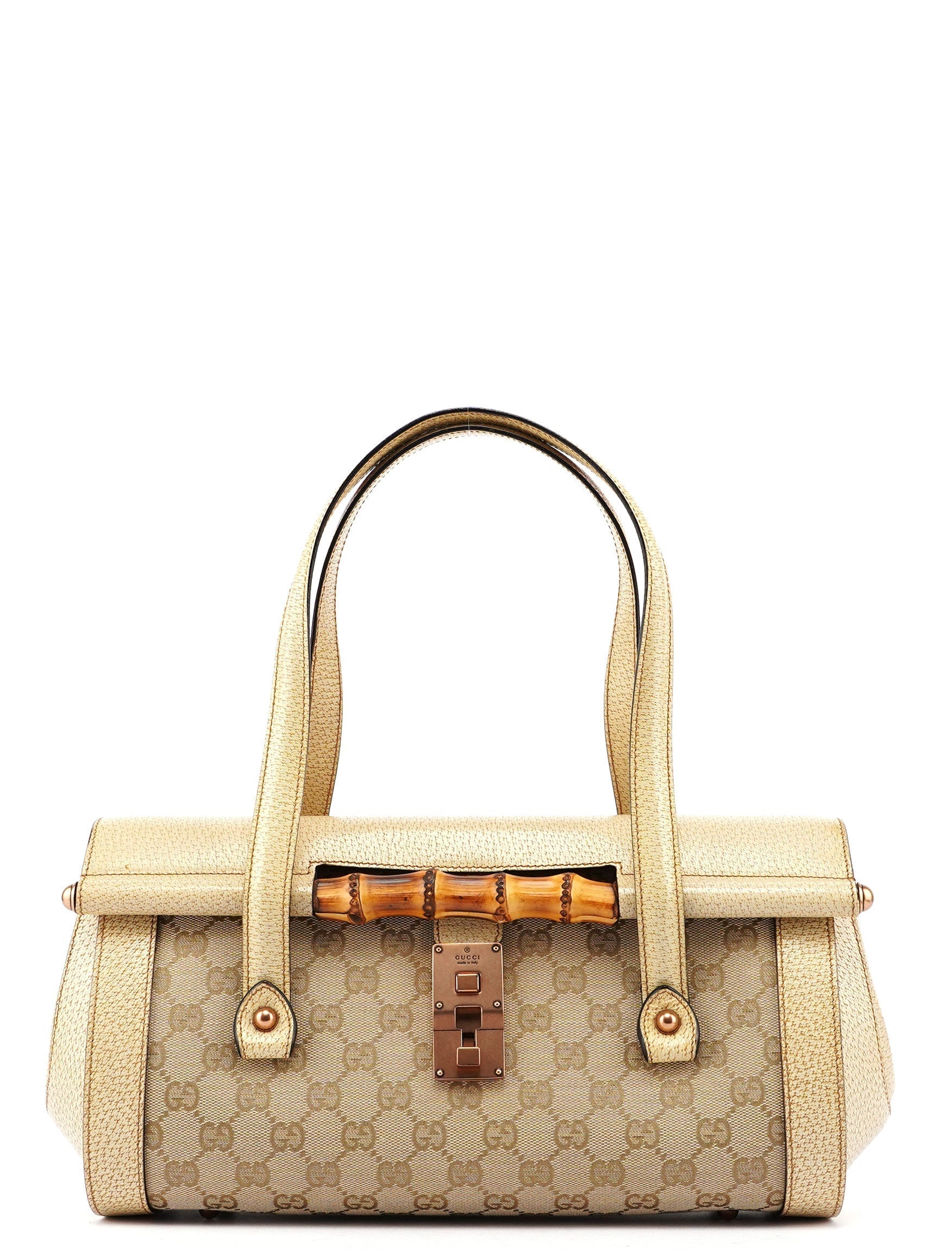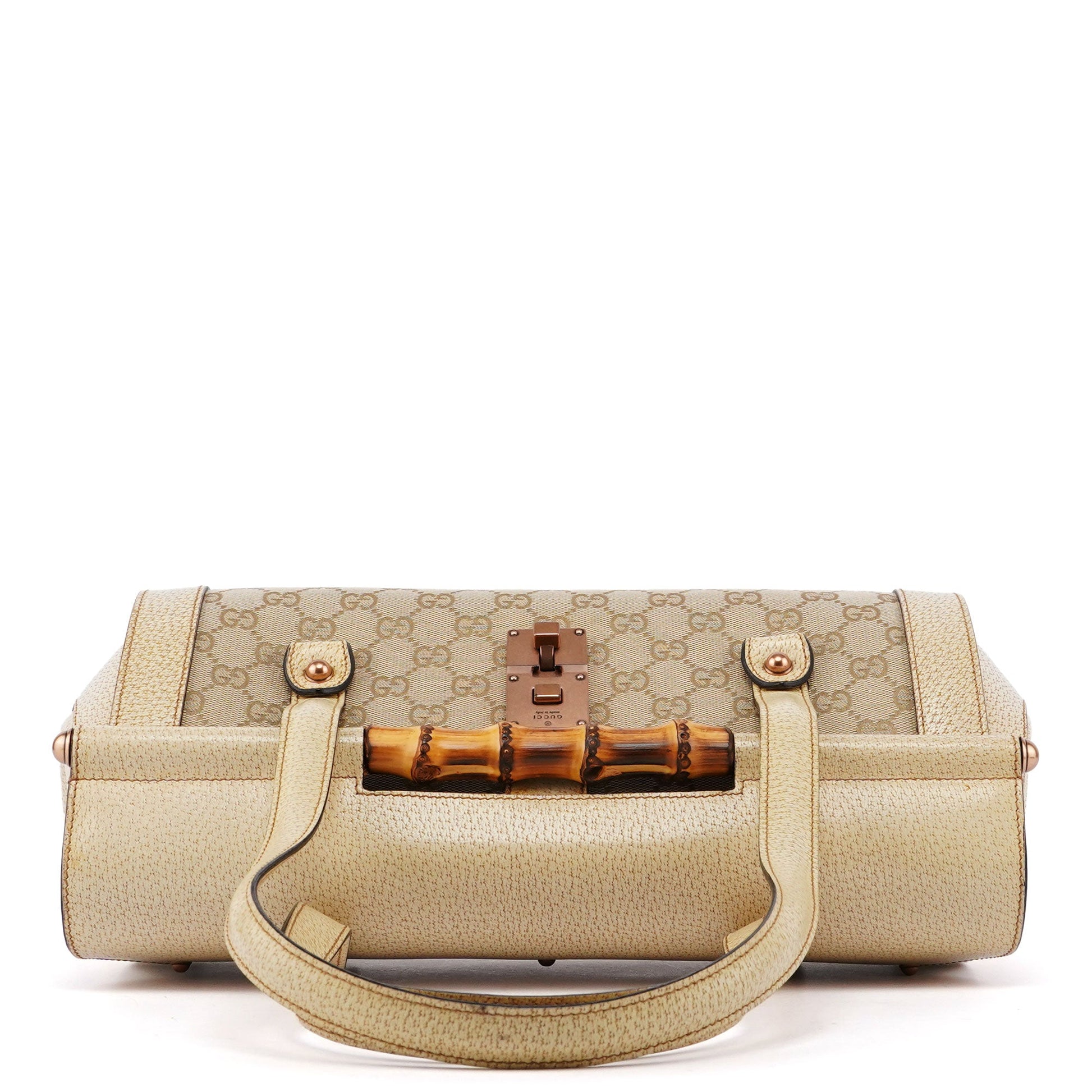 Introducing the Gucci GG Bamboo handbag, designed by Tom Ford in the late 1990s. Handcrafted from beige GG monogram canvas and complimented by off-white leather, it features copper-tone hardware and a distinctive bamboo detail. The cotton-lined interior includes a zipper pocket for organization, combining elegance with practicality.