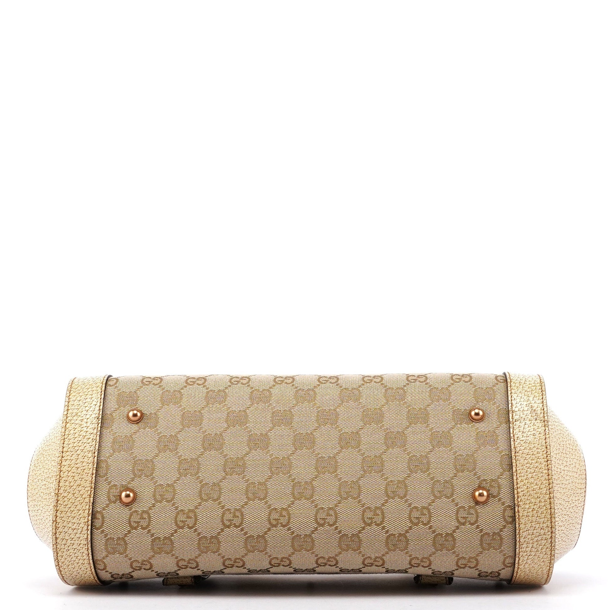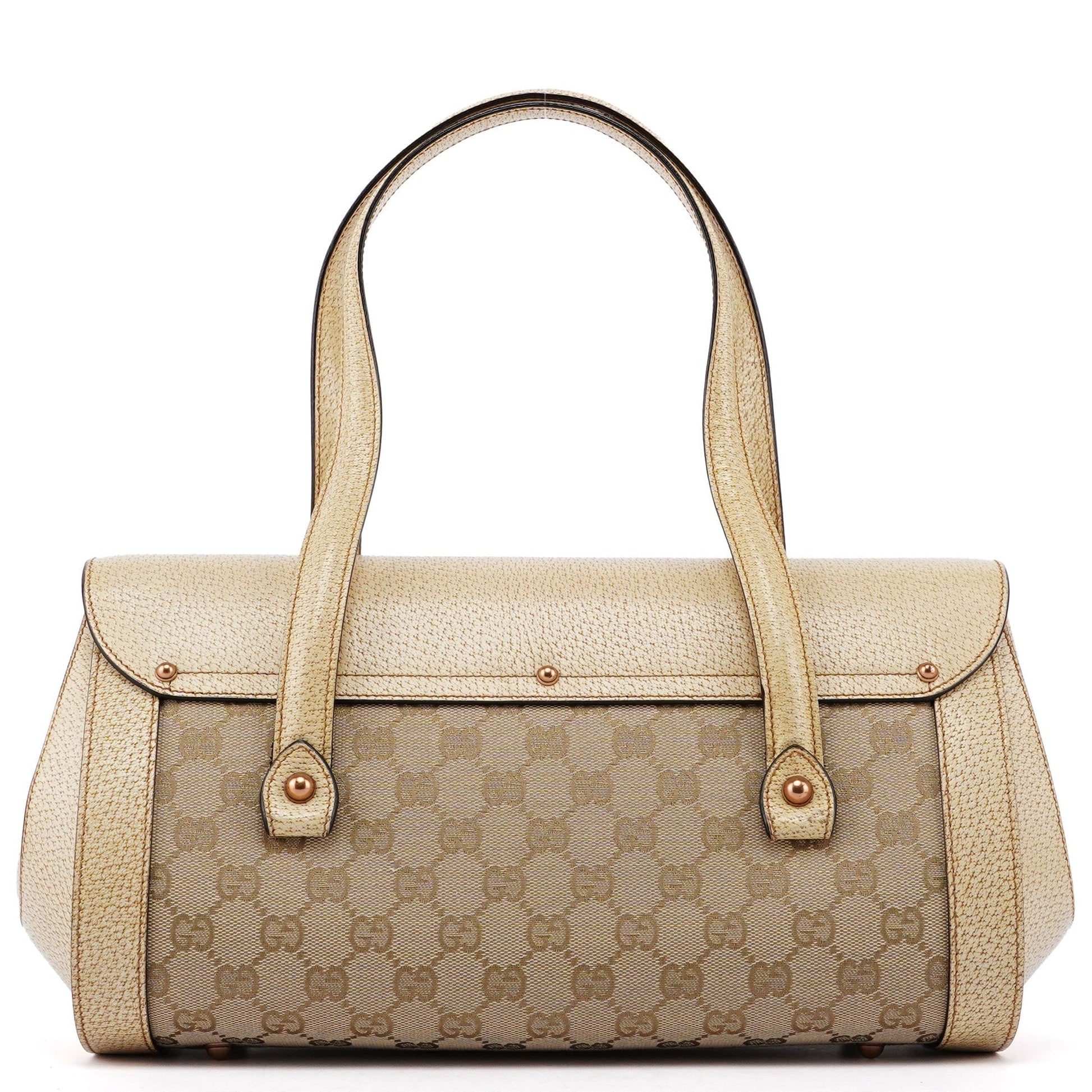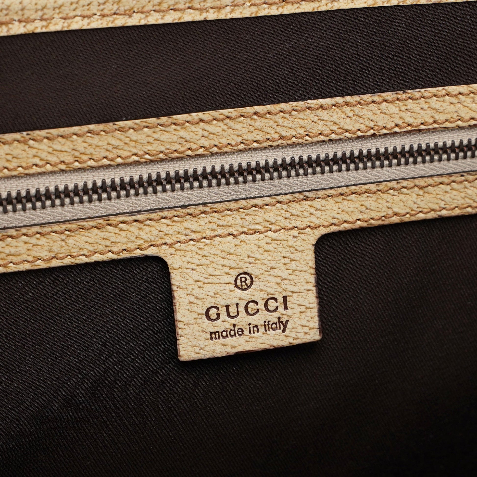 Introducing the Gucci GG Bamboo handbag, designed by Tom Ford in the late 1990s. Handcrafted from beige GG monogram canvas and complimented by off-white leather, it features copper-tone hardware and a distinctive bamboo detail. The cotton-lined interior includes a zipper pocket for organization, combining elegance with practicality.