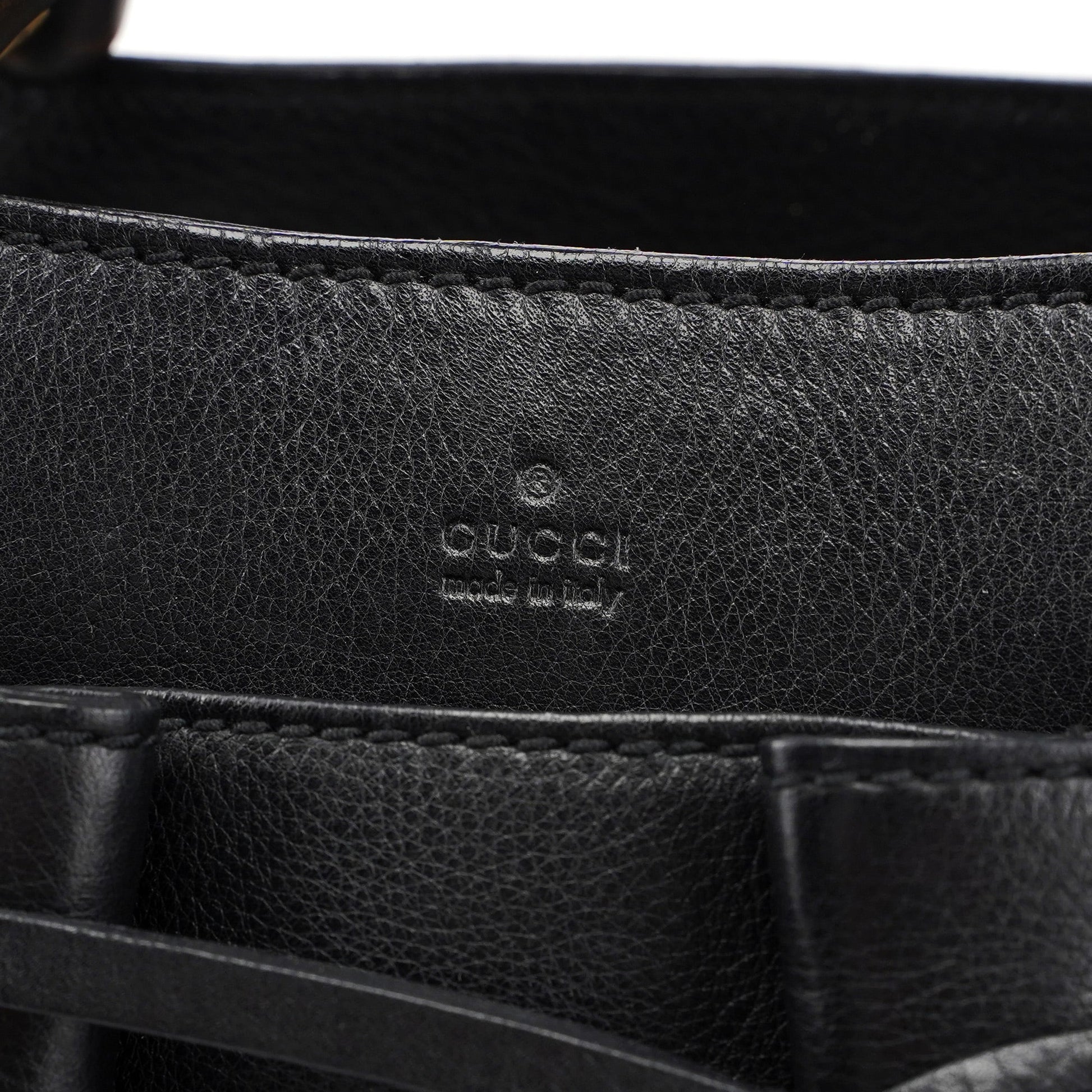 Designed by Tom Ford in 2002, the Gucci Bamboo bag boasts black leather and iconic bamboo handles. Gold-tone hardware complements the front pocket. Inside, cotton lining envelops three compartments, one secured by a zipper, alongside an interior zipper pocket.