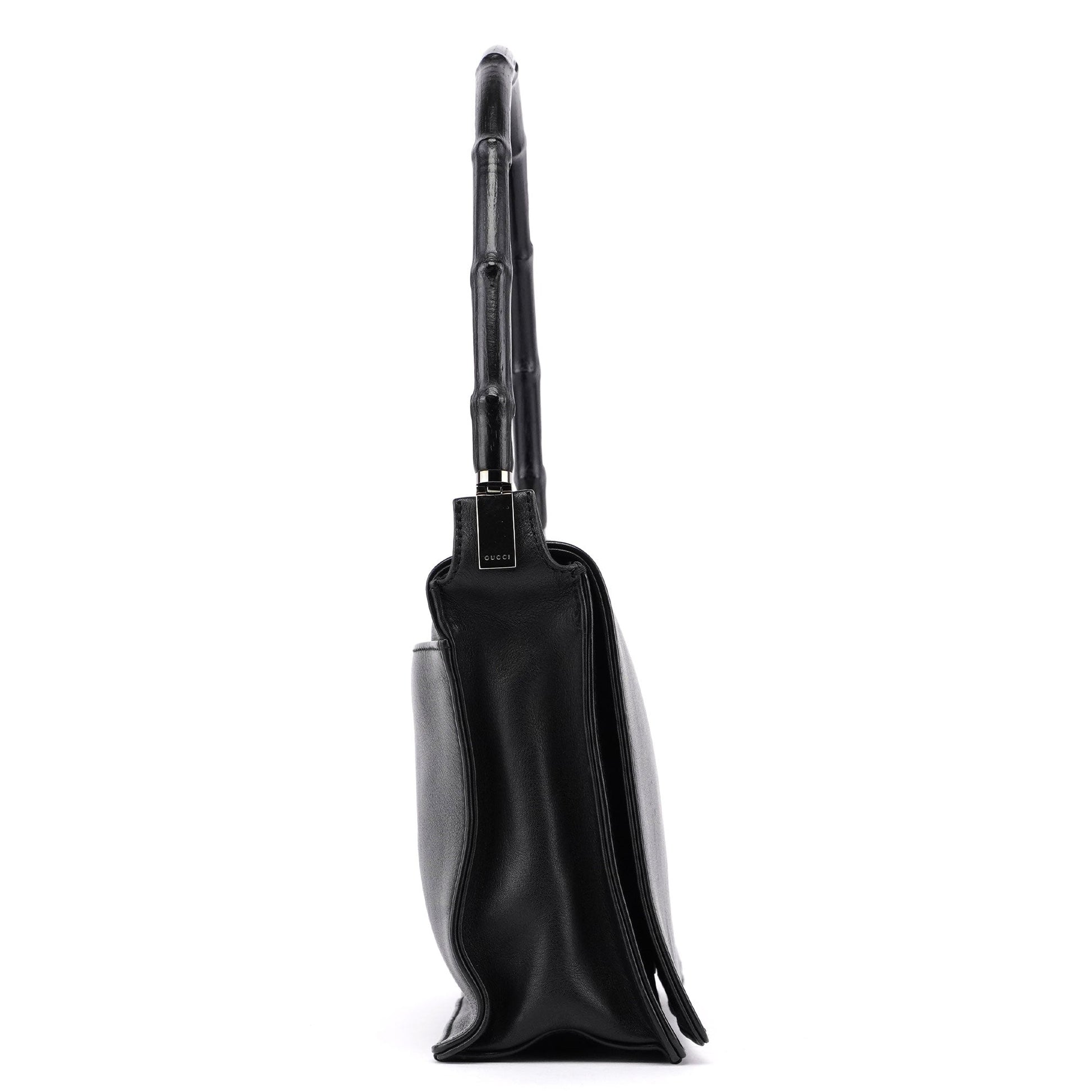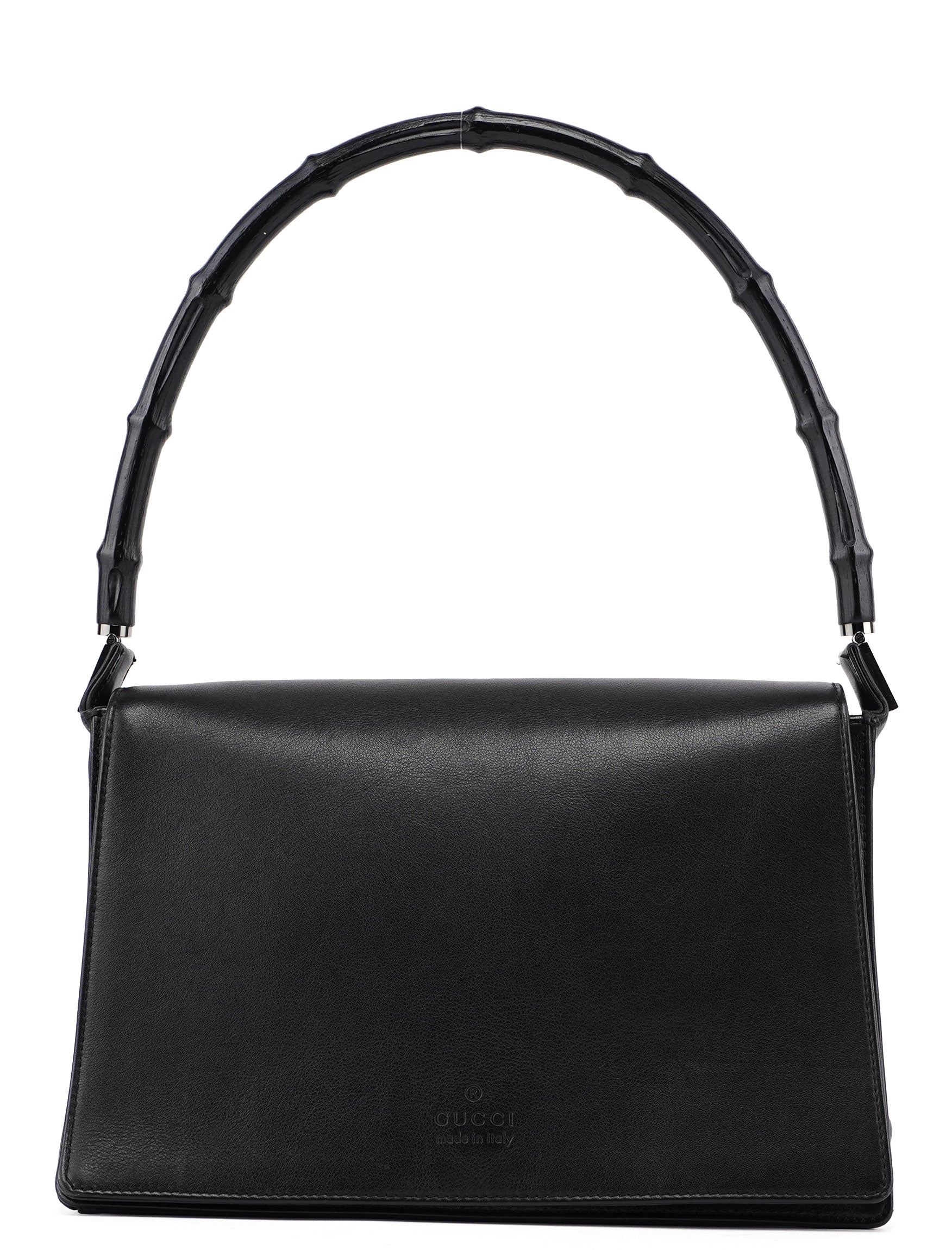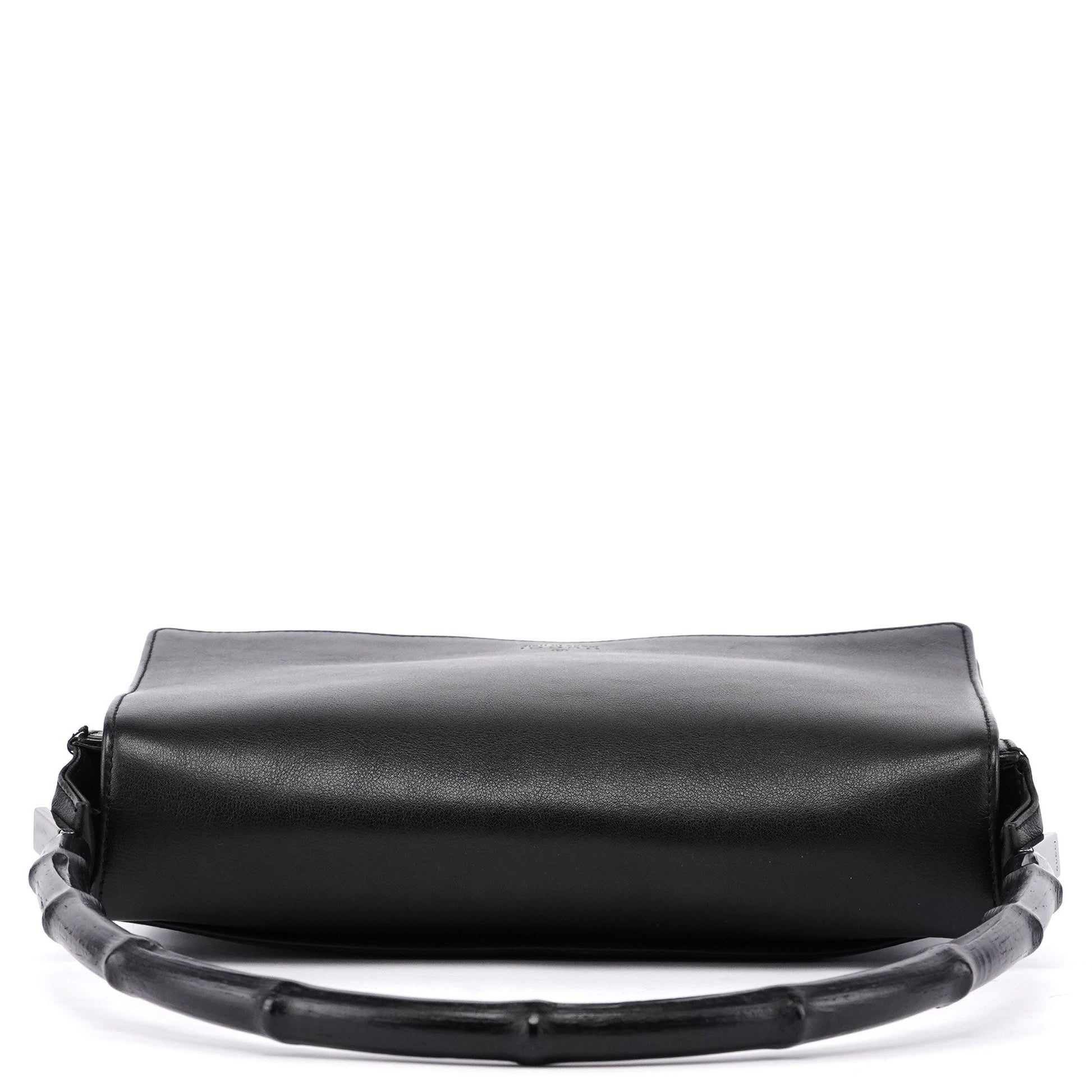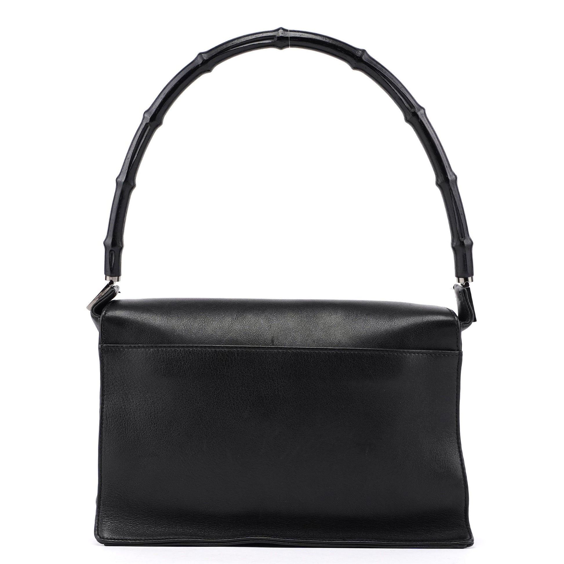 Designed by Tom Ford in the late 1990s, the Gucci Bamboo shoulder bag is handcrafted from black calfskin leather and features silver-tone hardware engraved with the Gucci logo and a bamboo handle. The magnetic flap closure opens to a satin-lined interior with a zipper pocket, showcasing timeless elegance.