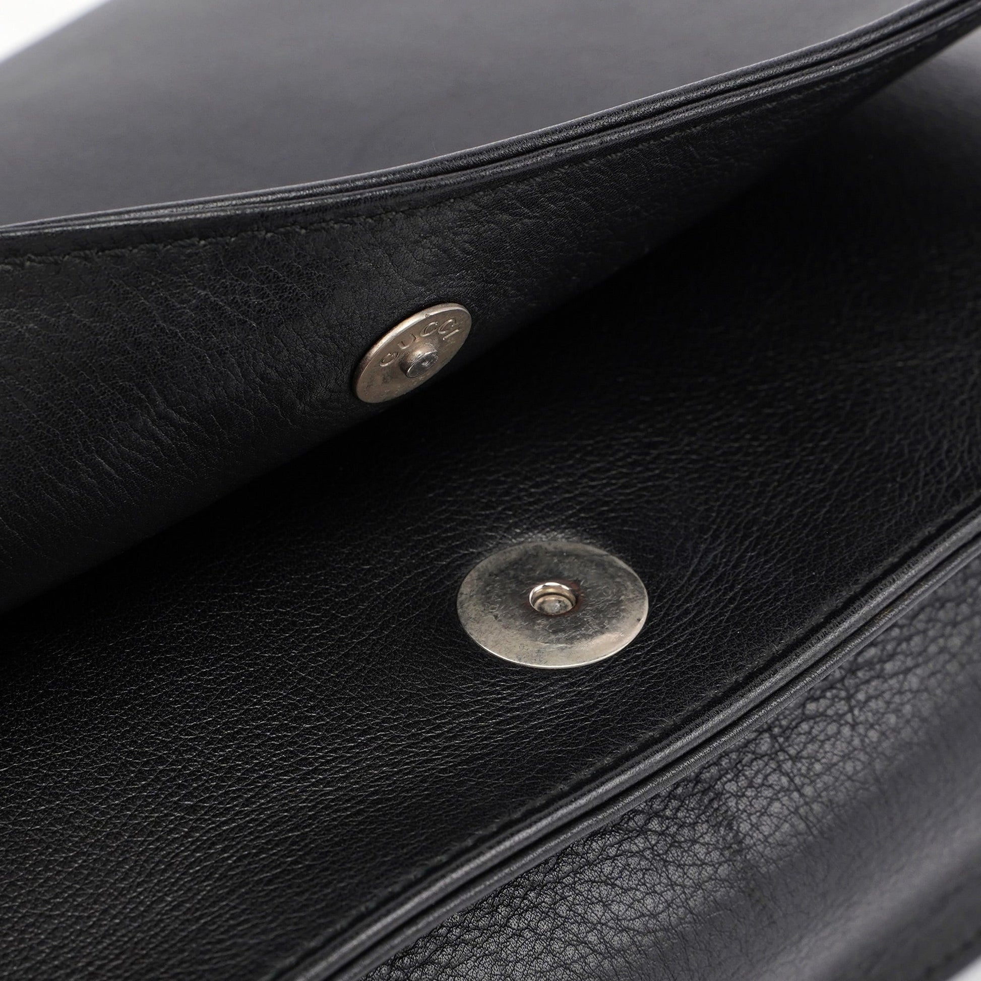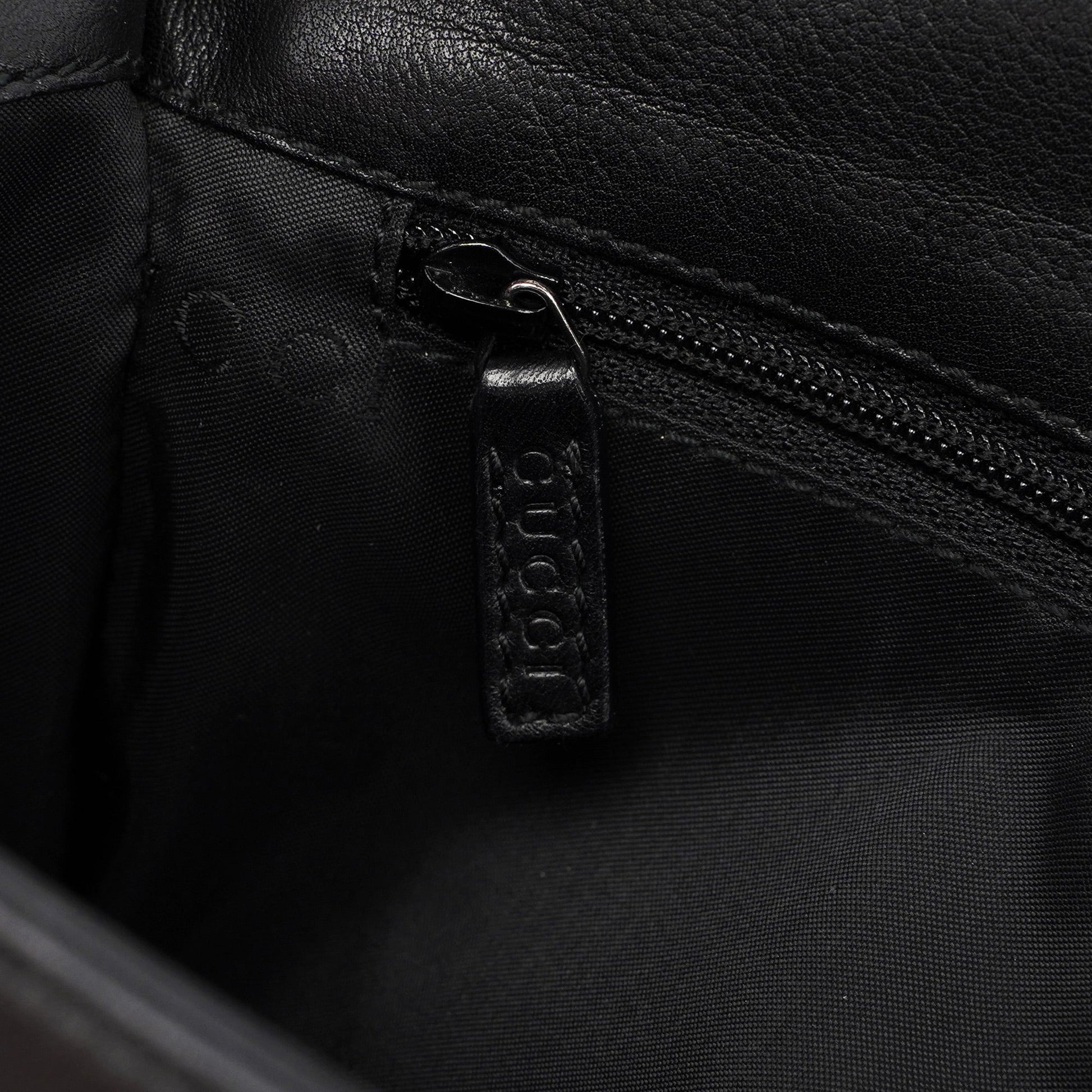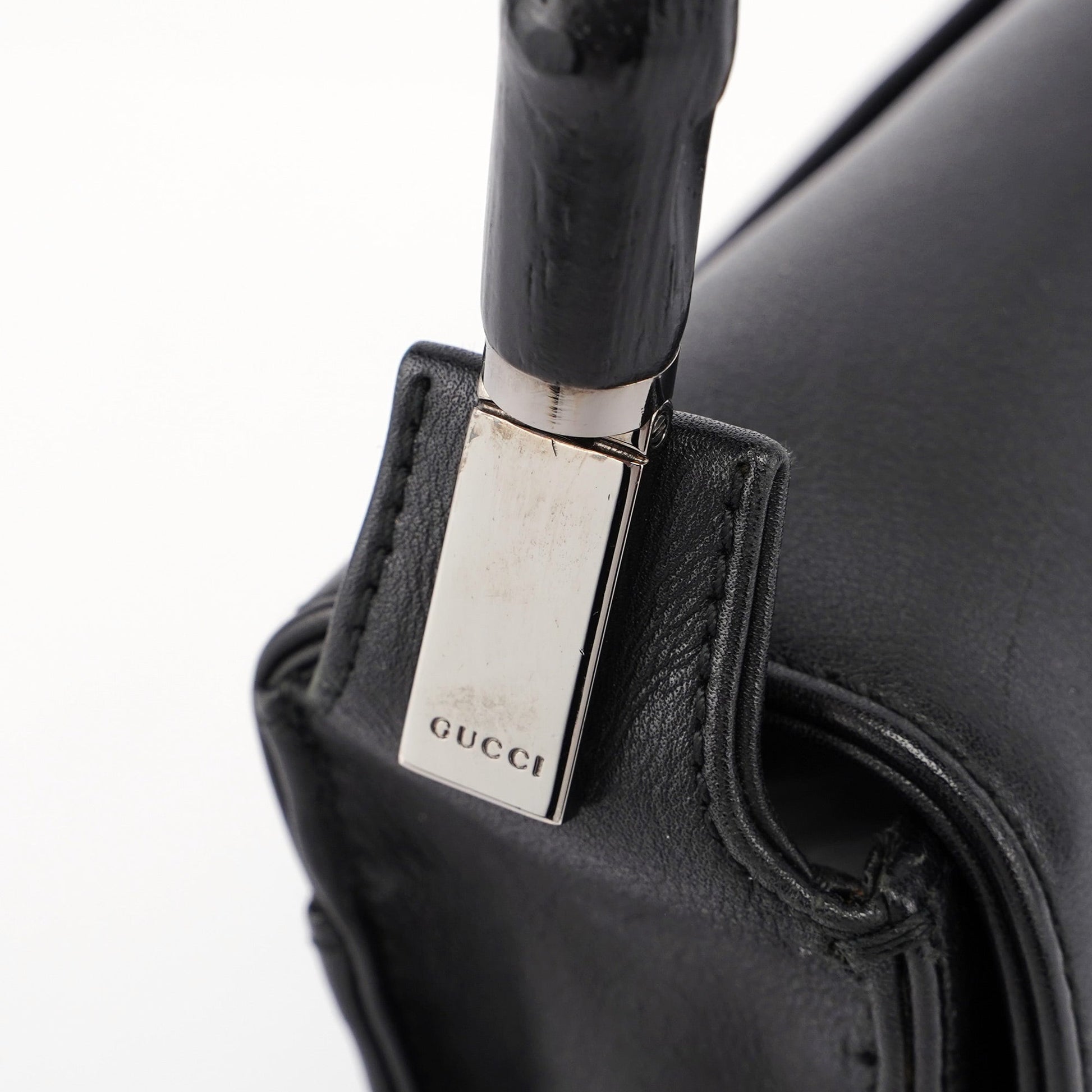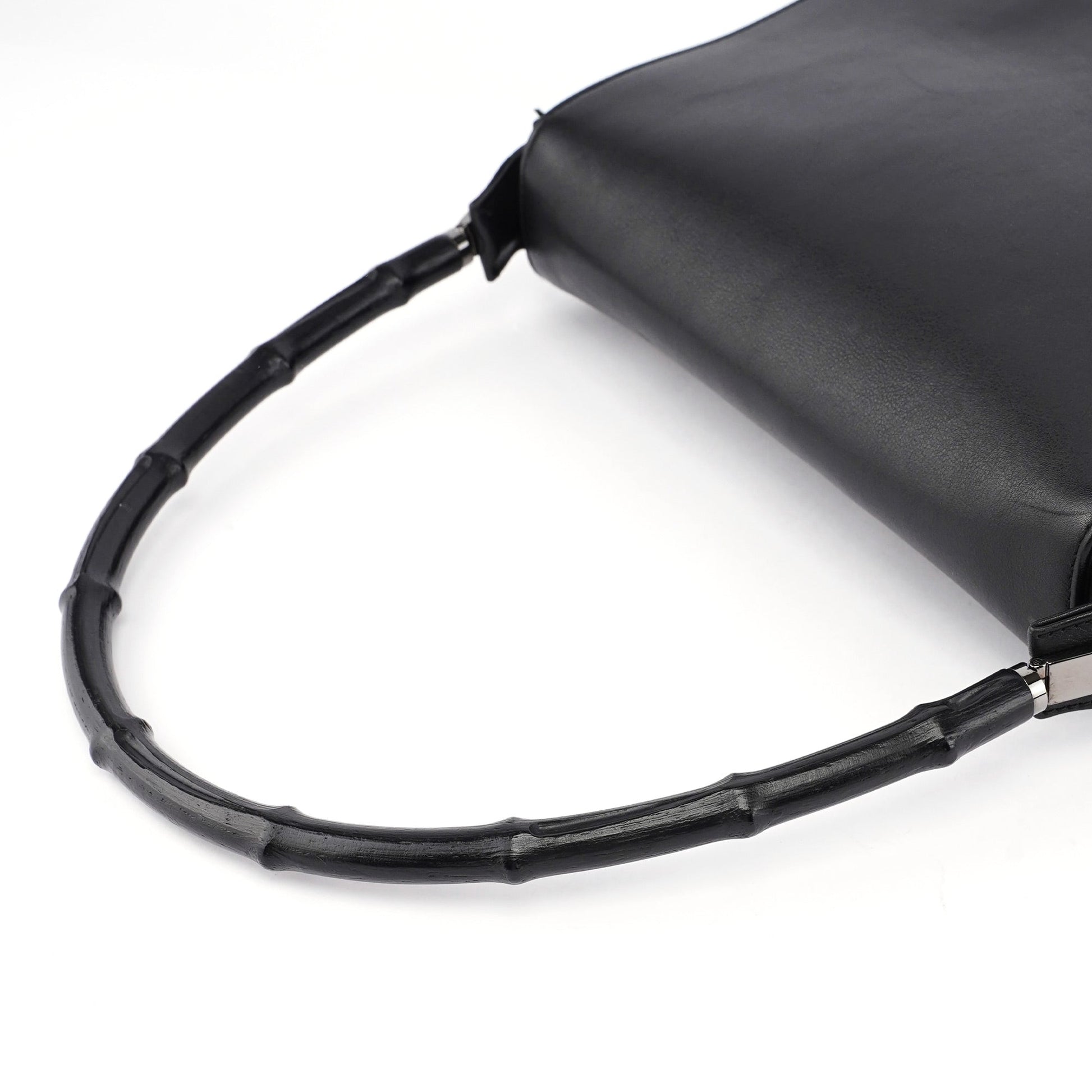 Designed by Tom Ford in the late 1990s, the Gucci Bamboo shoulder bag is handcrafted from black calfskin leather and features silver-tone hardware engraved with the Gucci logo and a bamboo handle. The magnetic flap closure opens to a satin-lined interior with a zipper pocket, showcasing timeless elegance.