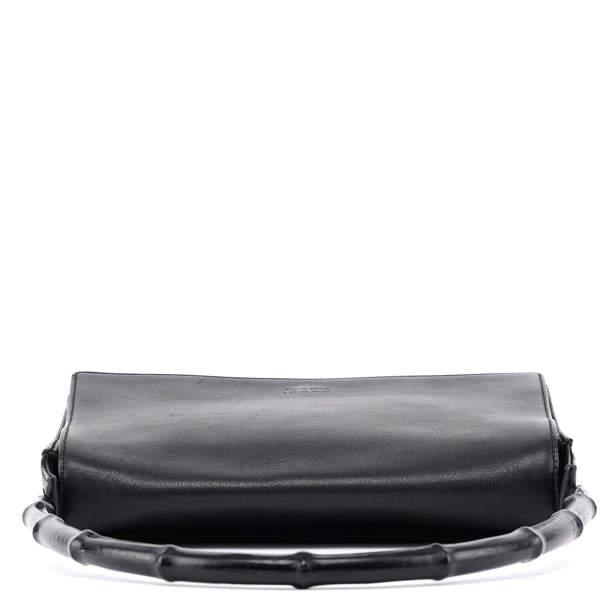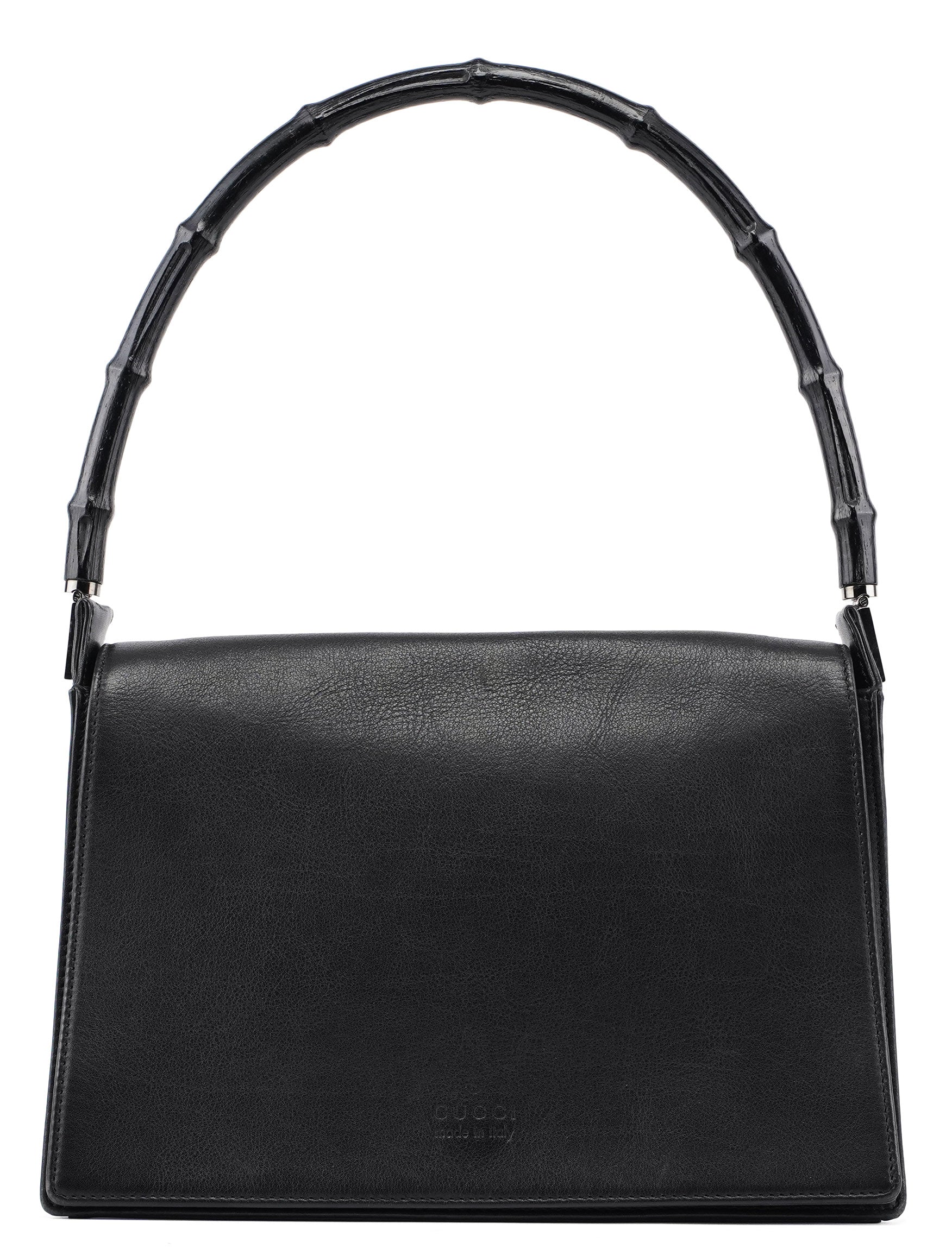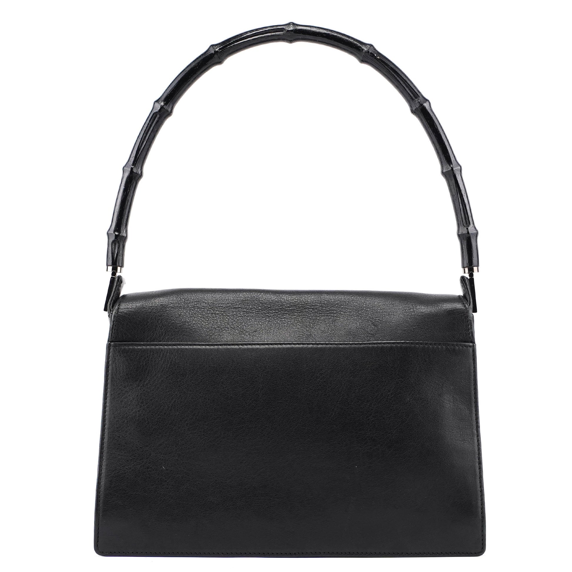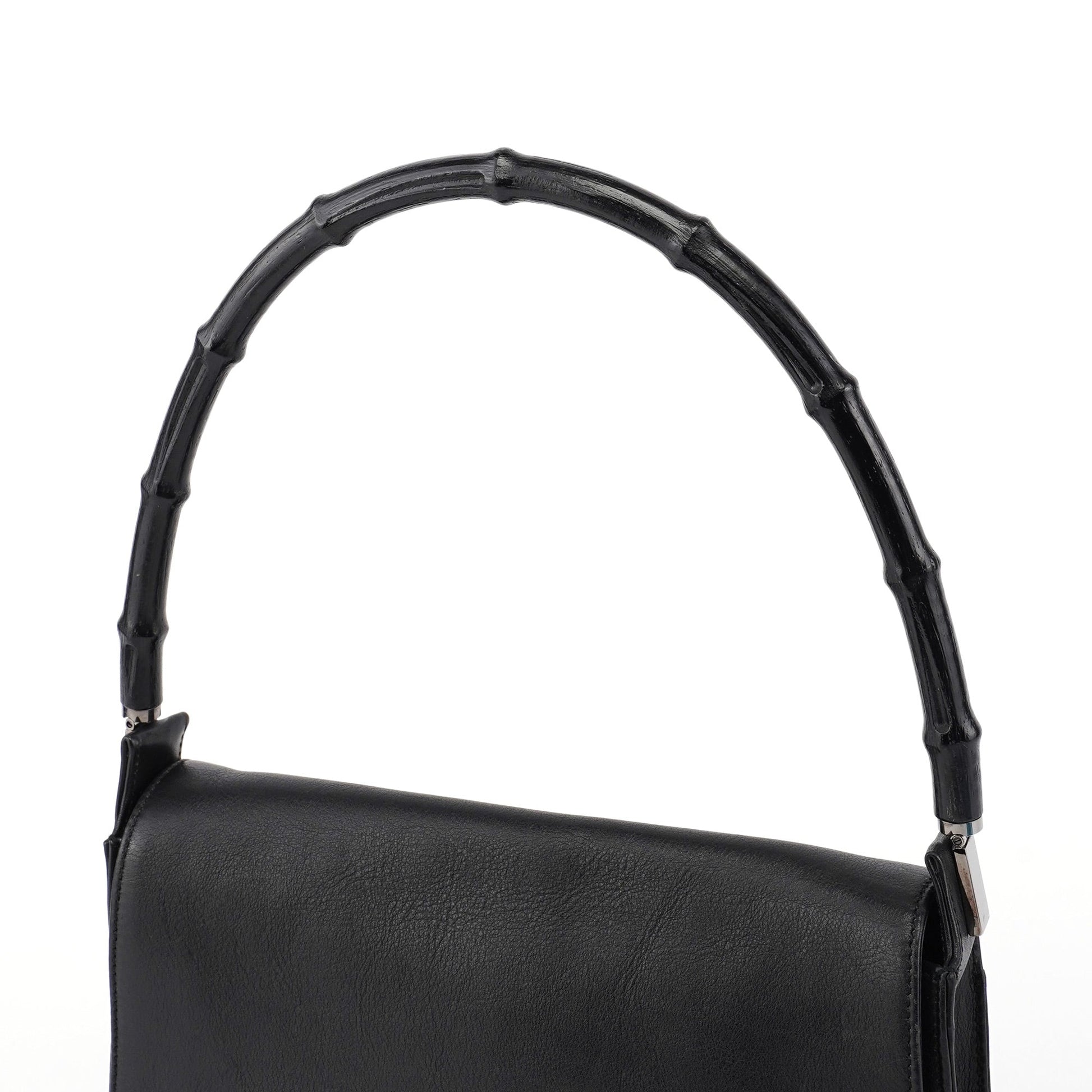 Designed by Tom Ford in the late 1990s, the Gucci Bamboo shoulder bag is handcrafted from black calfskin leather and features silver-tone hardware engraved with the Gucci logo and a bamboo handle. The magnetic flap closure opens to a satin-lined interior with a zipper pocket, showcasing timeless elegance.