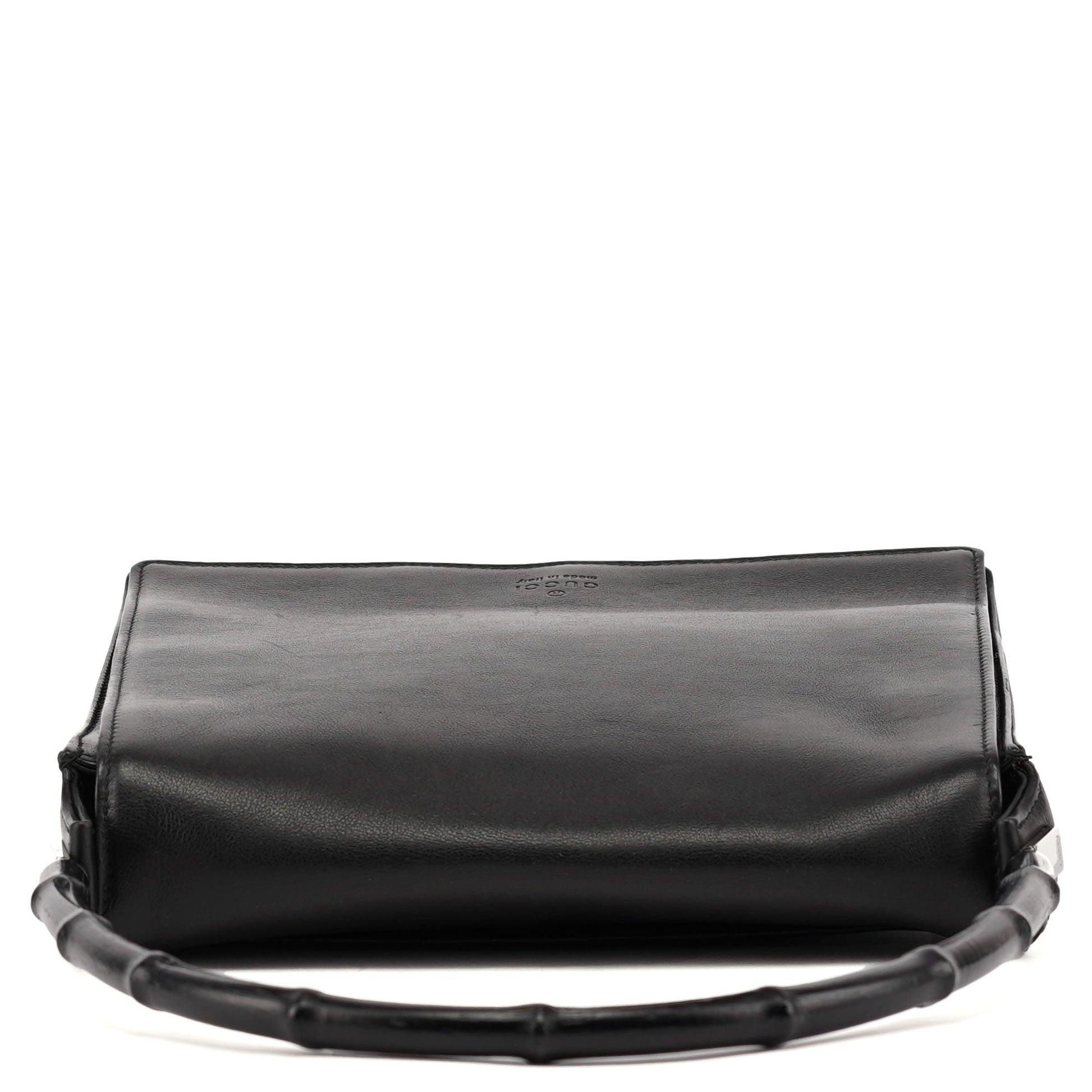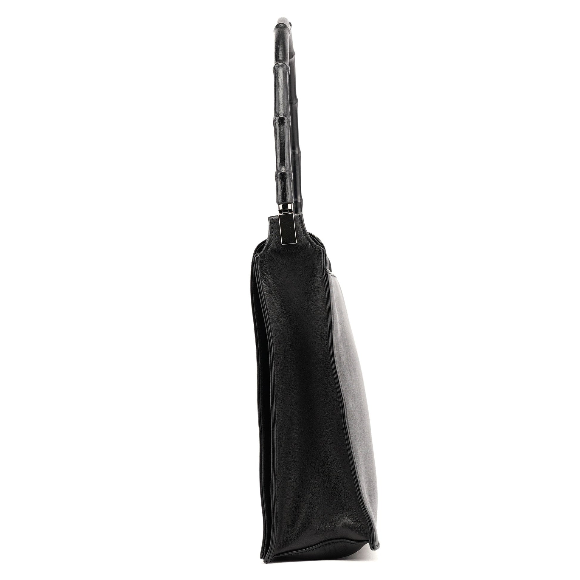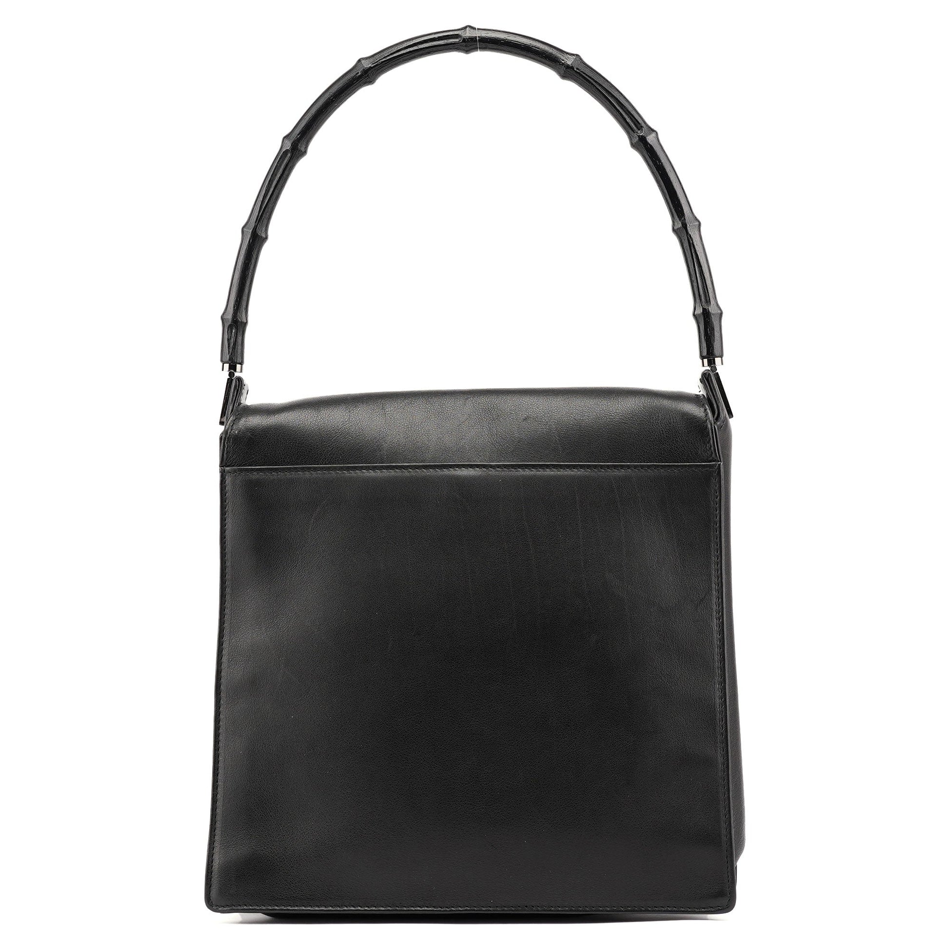 Designed by Tom Ford in the late 1990s, this Gucci Bamboo shoulder bag is crafted from black calfskin leather. Featuring a signature bamboo handle, silver-tone hardware with Gucci logo engraving, and a magnetic flap closure, it embodies timeless elegance. The satin-lined interior includes a zipper pocket, while the embossed Gucci logo on the front adds a refined finishing touch.