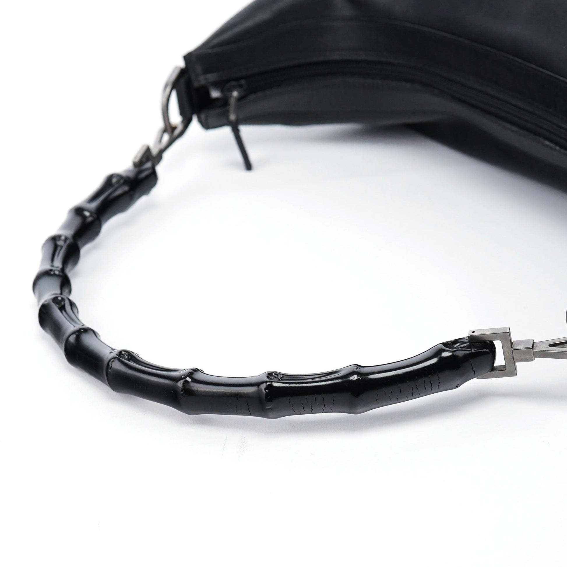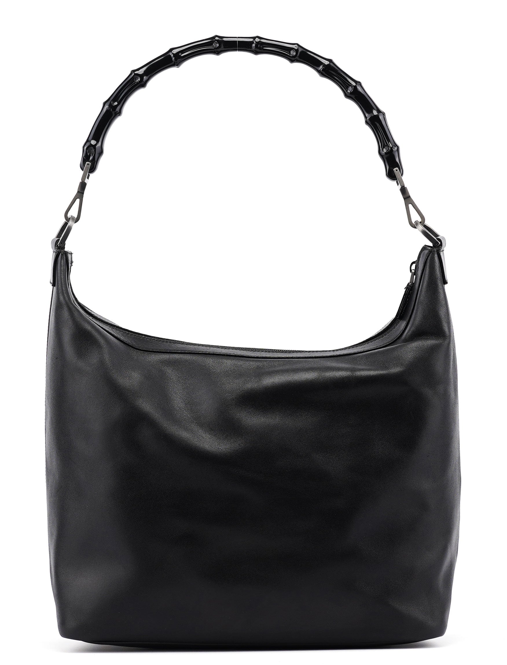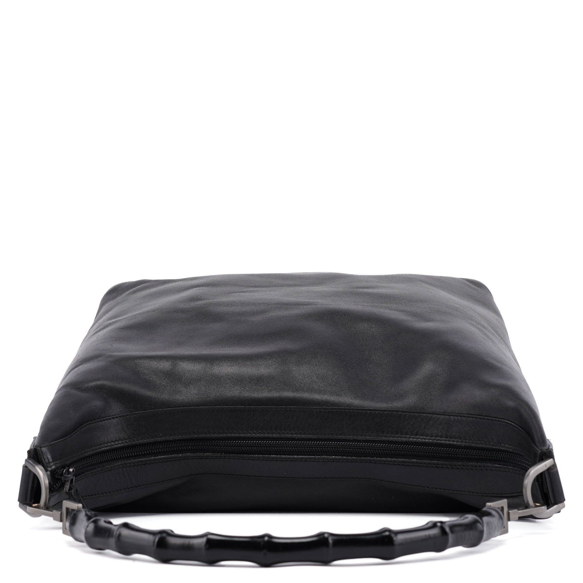 A timeless classic from Tom Ford’s late 1990s designs, this Gucci Bamboo shoulder bag showcases the brand’s signature black bamboo handle. Handcrafted in black calfskin leather with brushed silver-tone hardware, it features a secure zipper closure that opens to a satin-lined compartment with an interior zipper pocket. An elegant piece that combines sophistication with practical luxury.