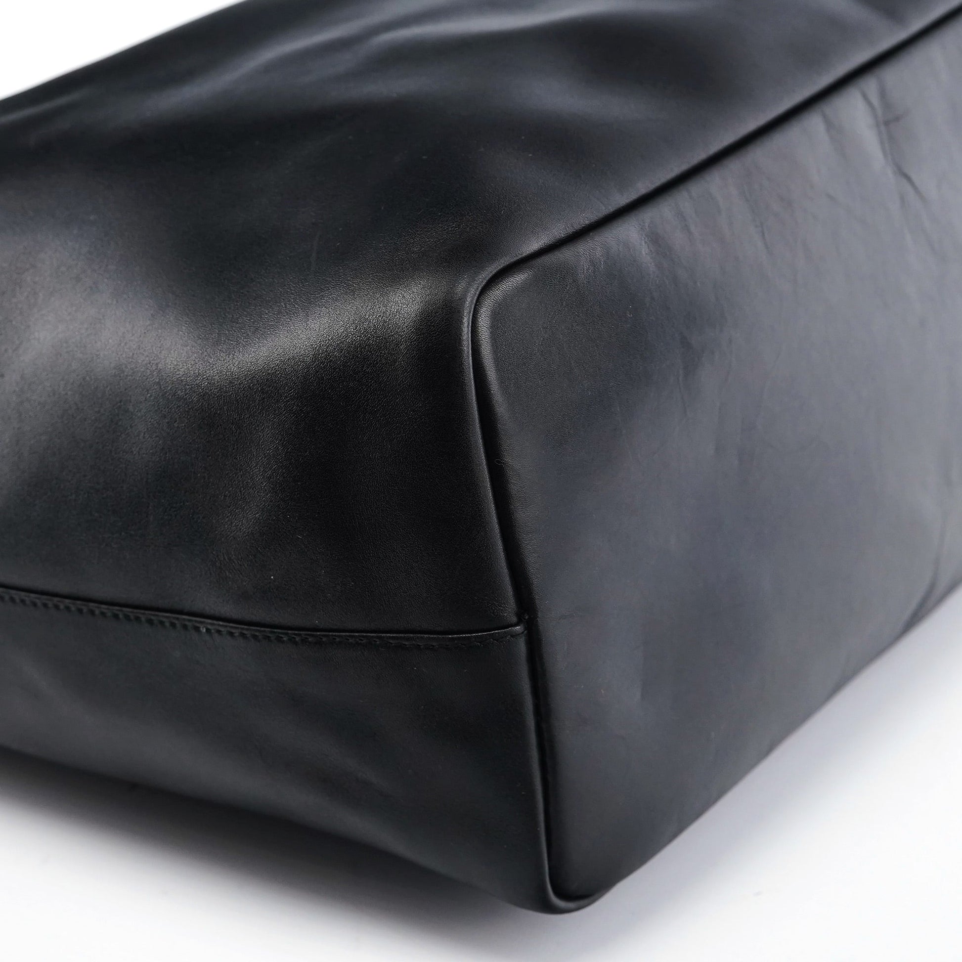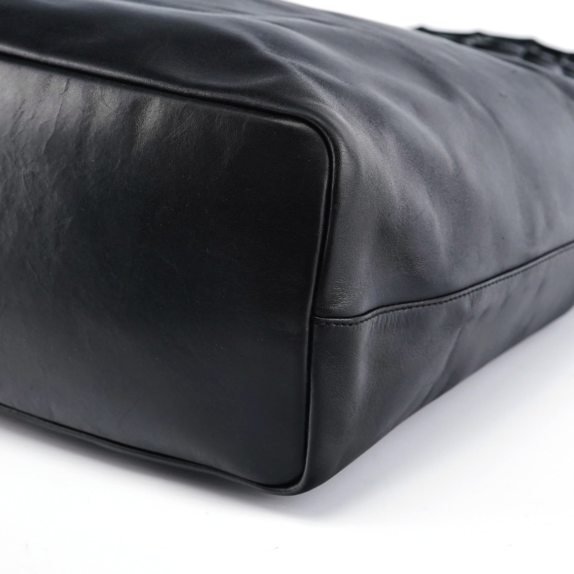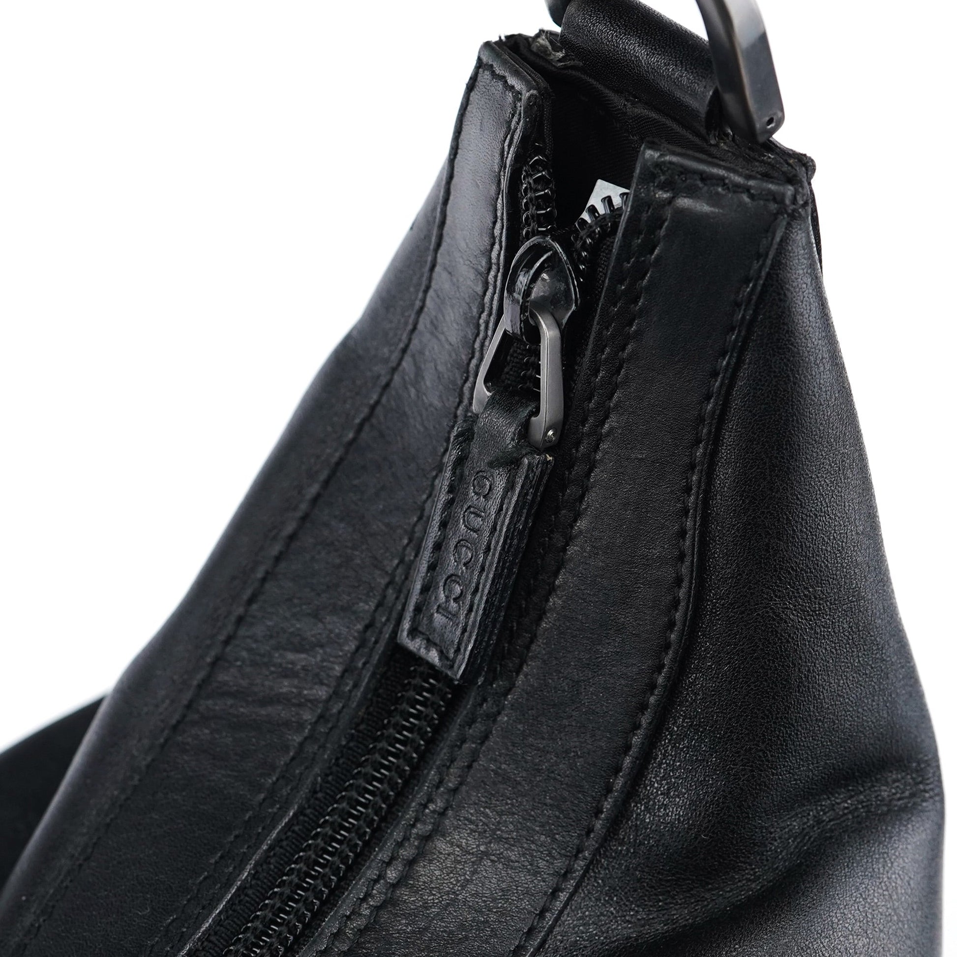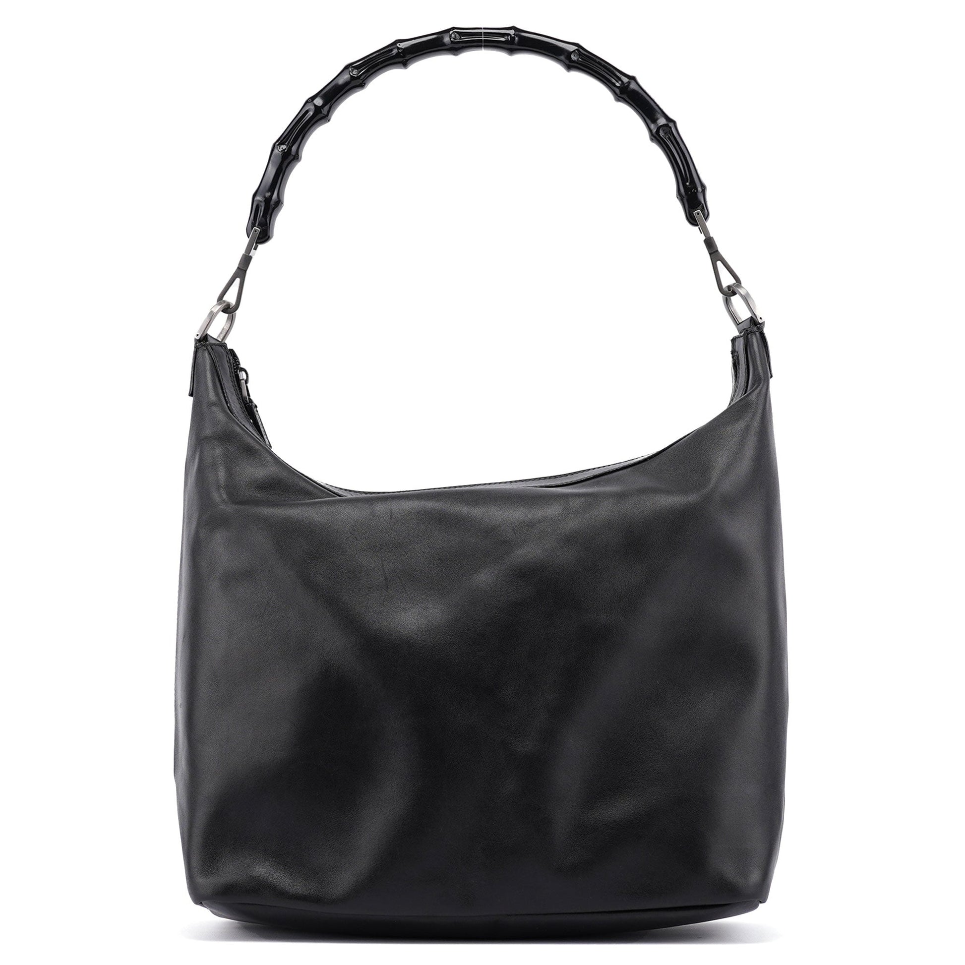 A timeless classic from Tom Ford’s late 1990s designs, this Gucci Bamboo shoulder bag showcases the brand’s signature black bamboo handle. Handcrafted in black calfskin leather with brushed silver-tone hardware, it features a secure zipper closure that opens to a satin-lined compartment with an interior zipper pocket. An elegant piece that combines sophistication with practical luxury.