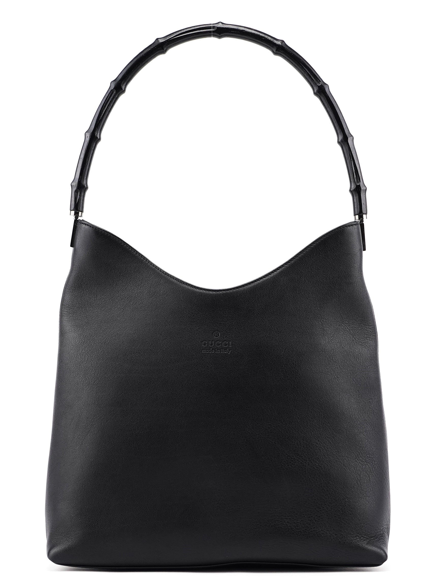 This Gucci Vitello Bamboo shoulder bag, designed by Tom Ford in the late 1990s, is handcrafted from black calfskin leather and features a bamboo handle with Gucci logo engraving and silver-tone hardware. The bag's spacious satin-lined compartment includes an interior zipper pocket.