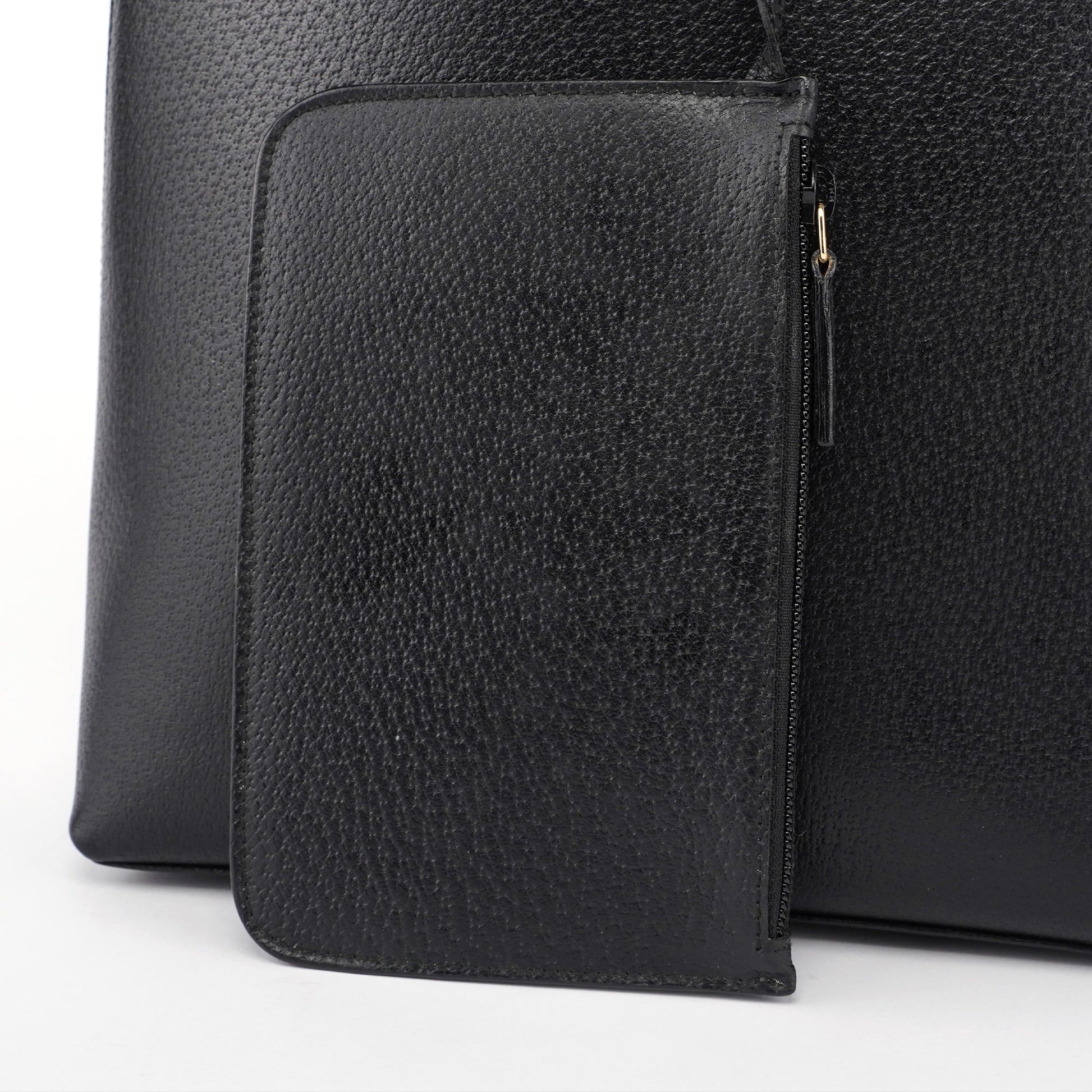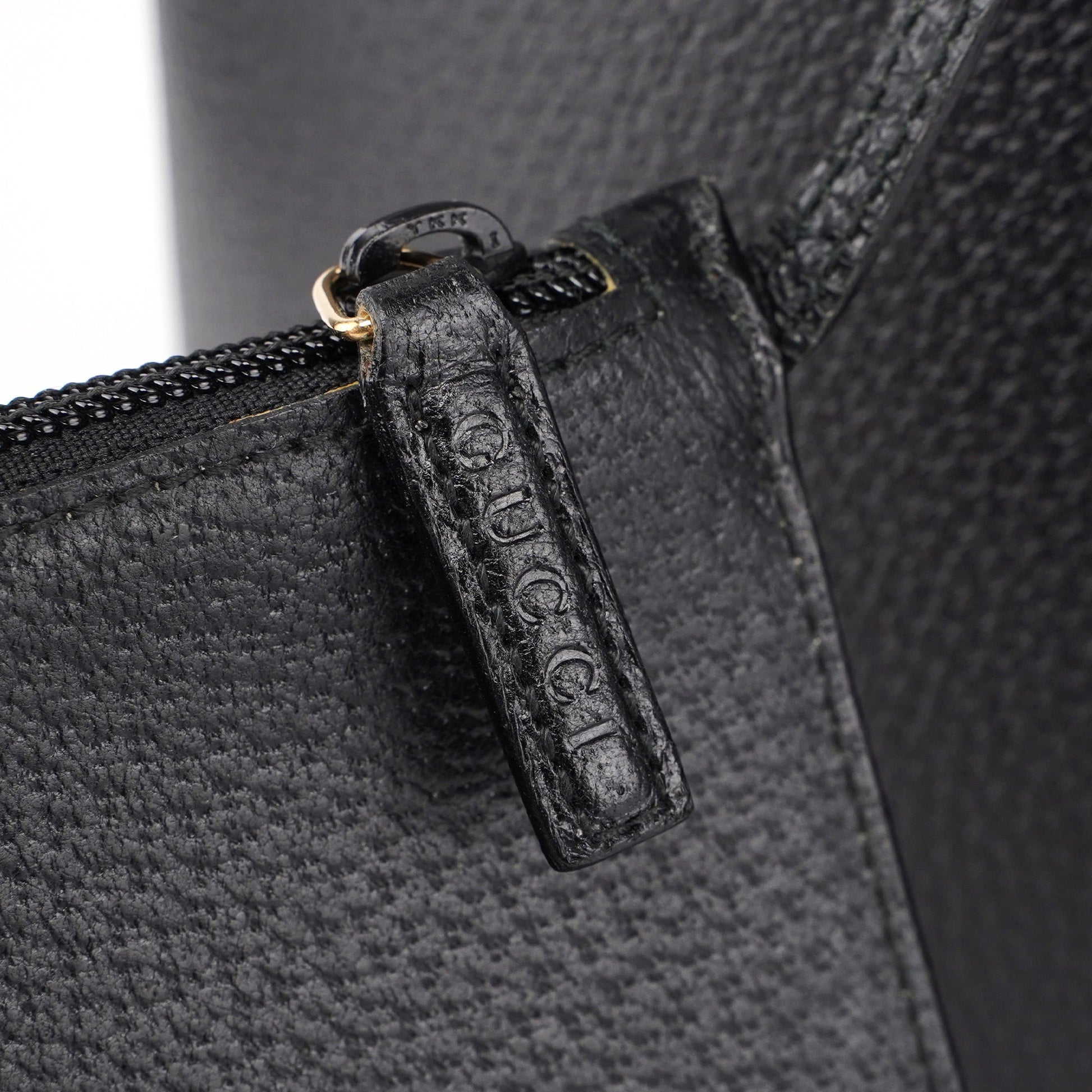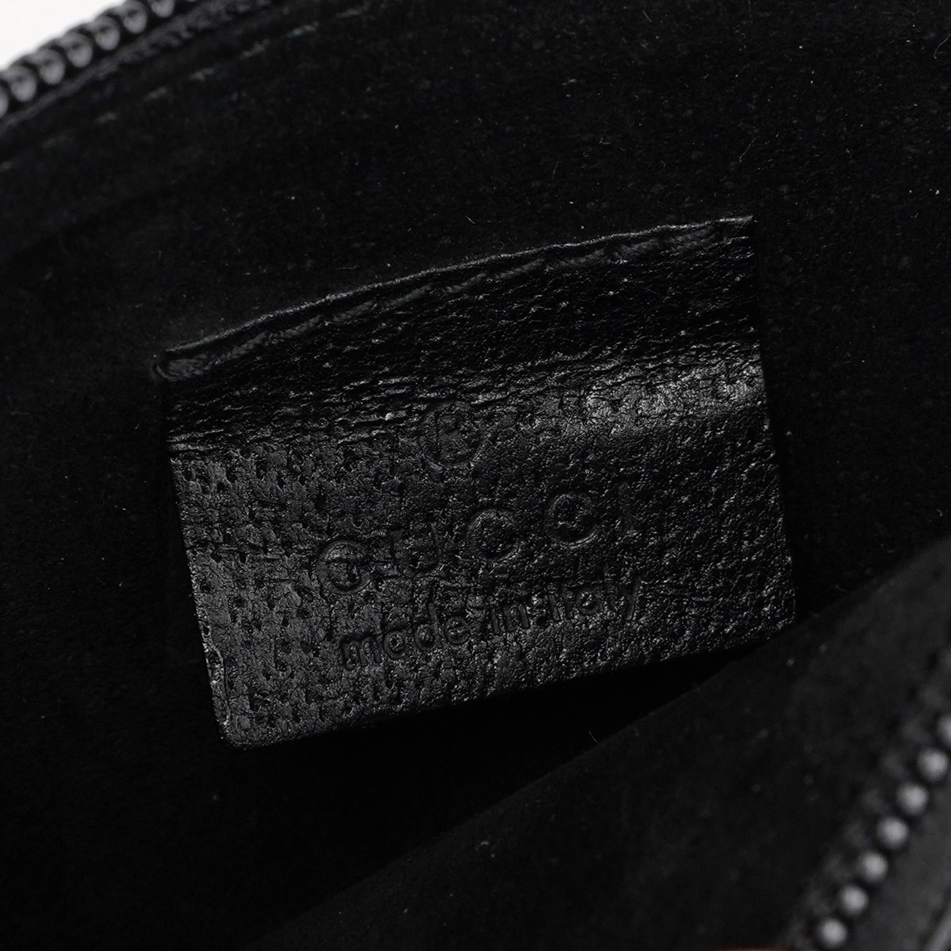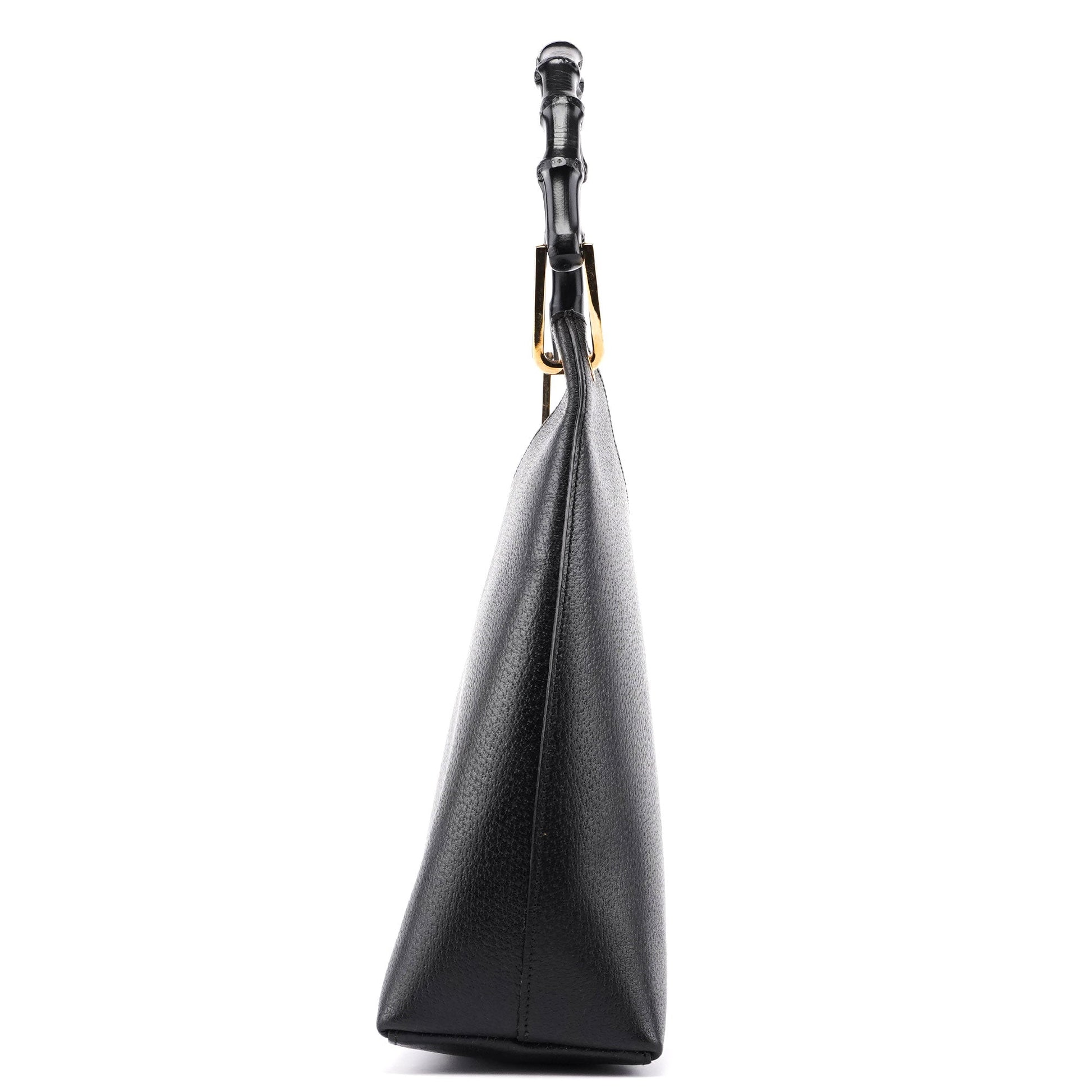 This Gucci black leather bamboo hobo bag, designed by Tom Ford in the late 1990s, features gold-tone hardware adorned with the Gucci logo engraving. The classic gloss black bamboo handle adds an iconic touch, while the design includes an attached pouch for practicality. The interior is elegantly lined with suede, embodying luxury and timeless style.