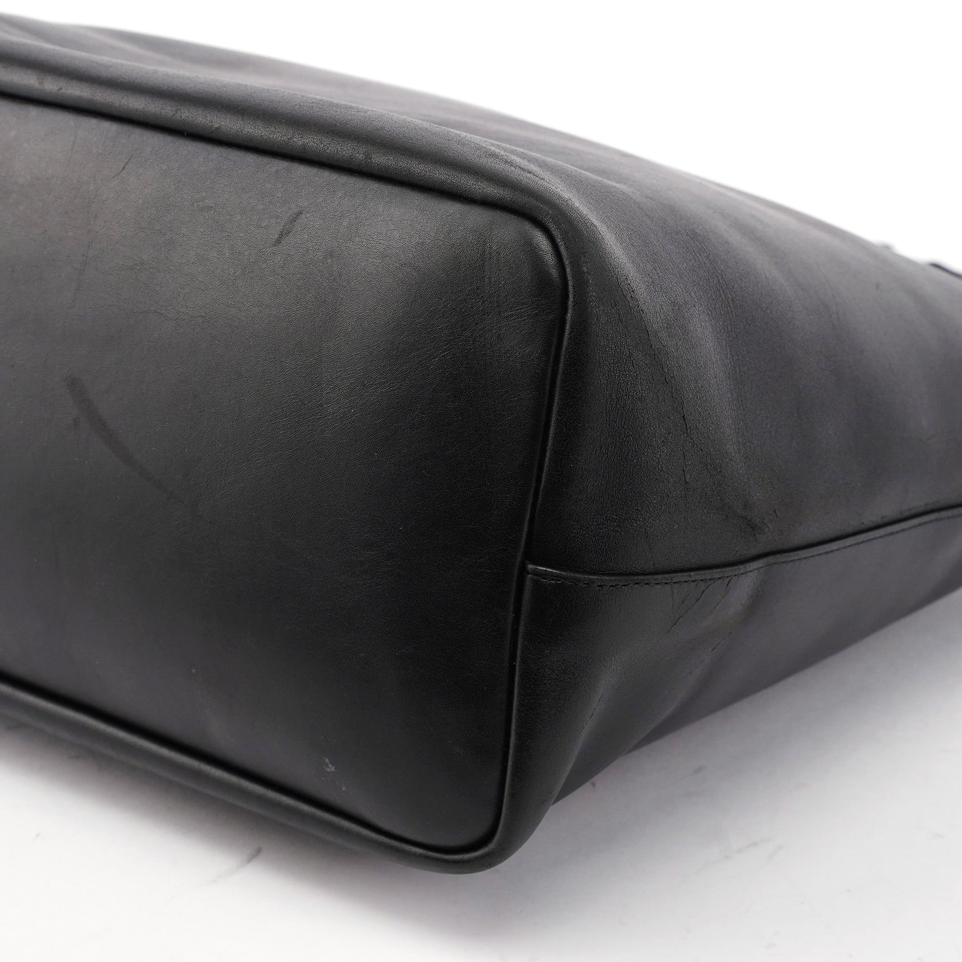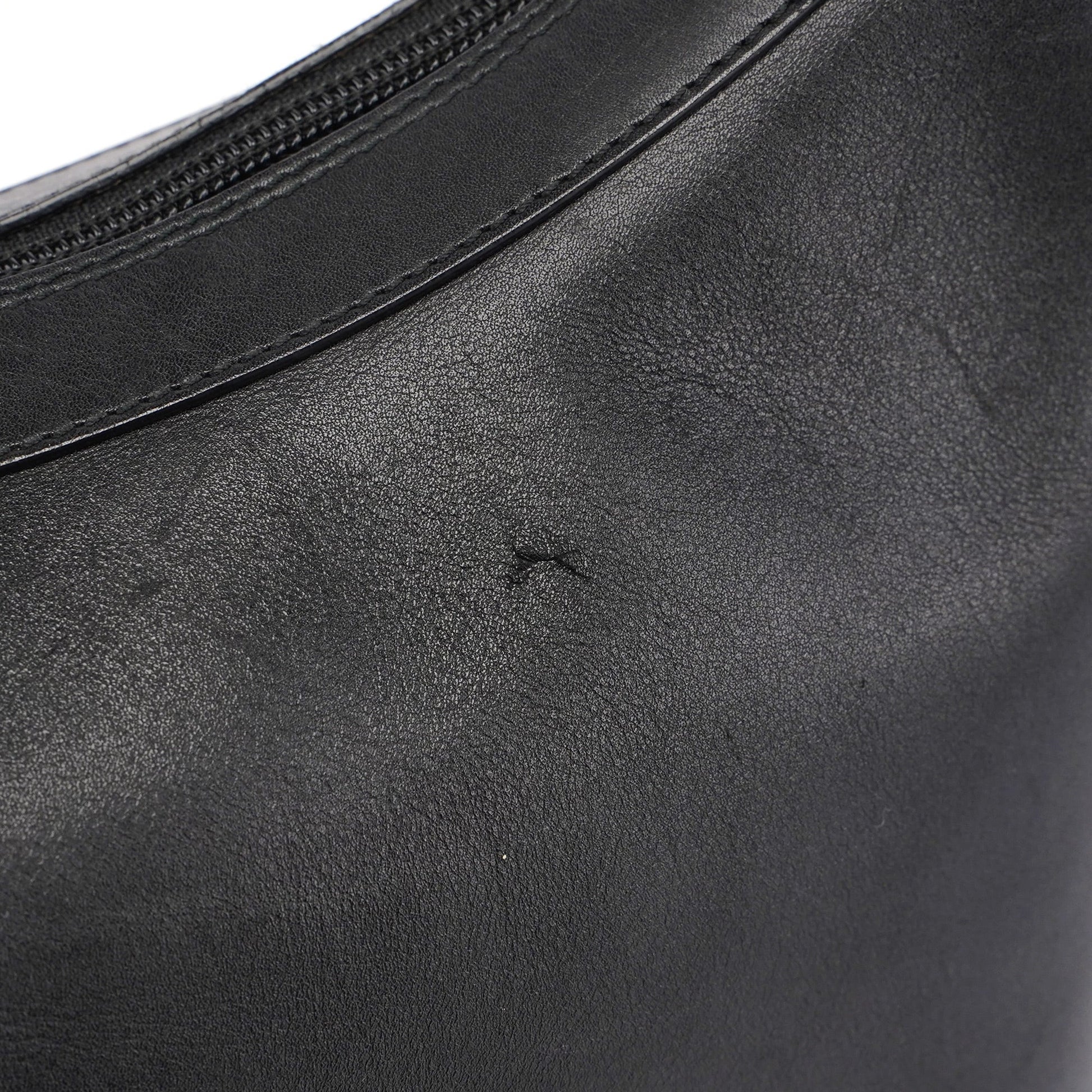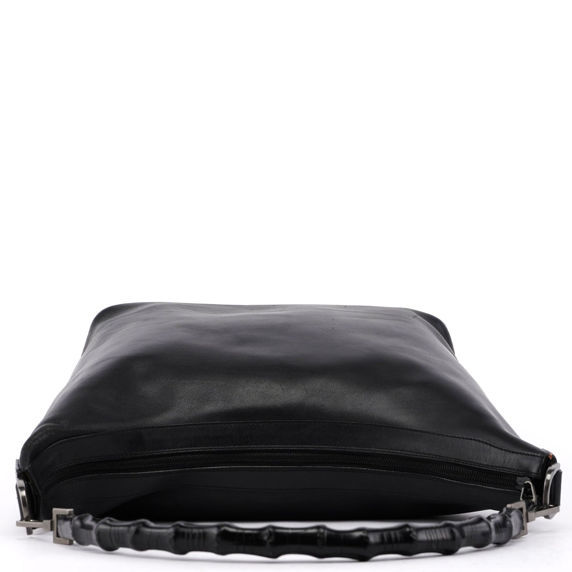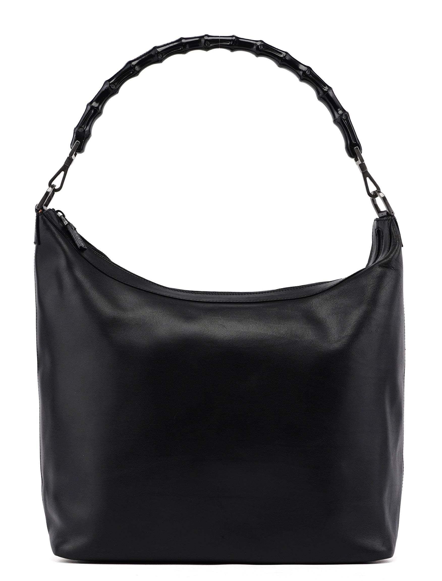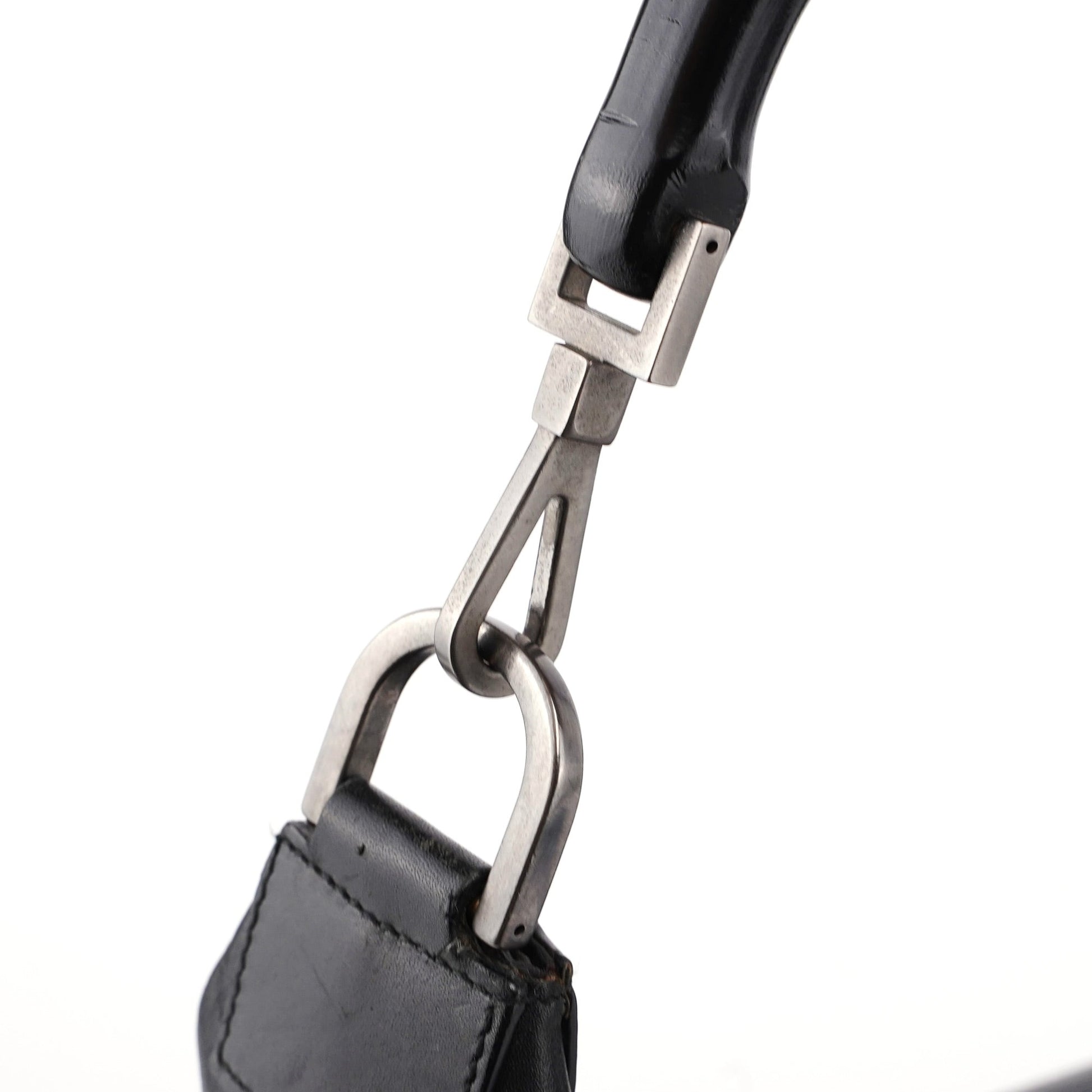 This Gucci Vitello Bamboo shoulder bag is a timeless classic designed in the late 1990s by Tom Ford. It features a black bamboo handle with Gucci logo engraving, handcrafted in black calfskin leather and silver-tone hardware. The bag's zipper-closed compartment is lined with satin and includes an interior zipper pocket.