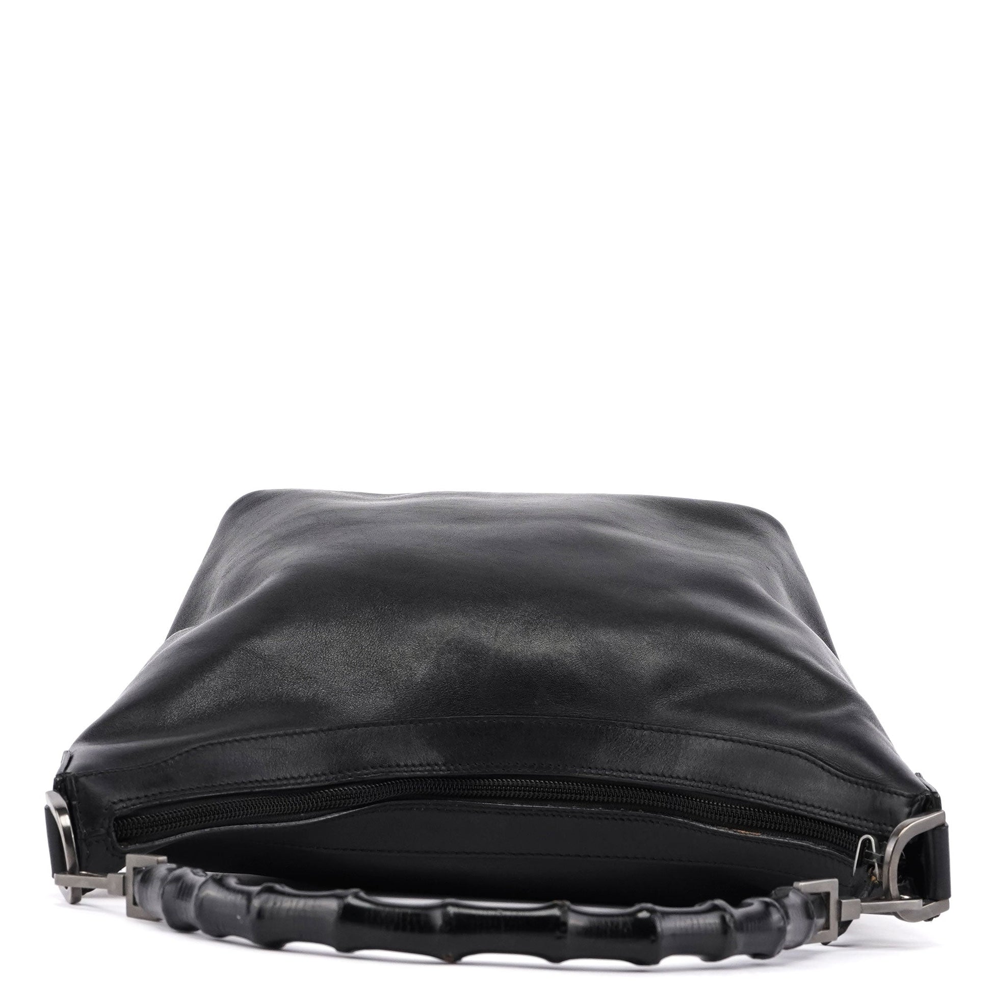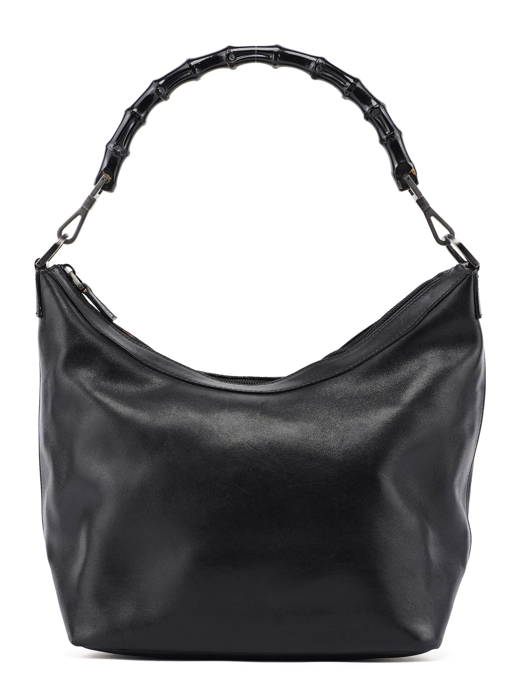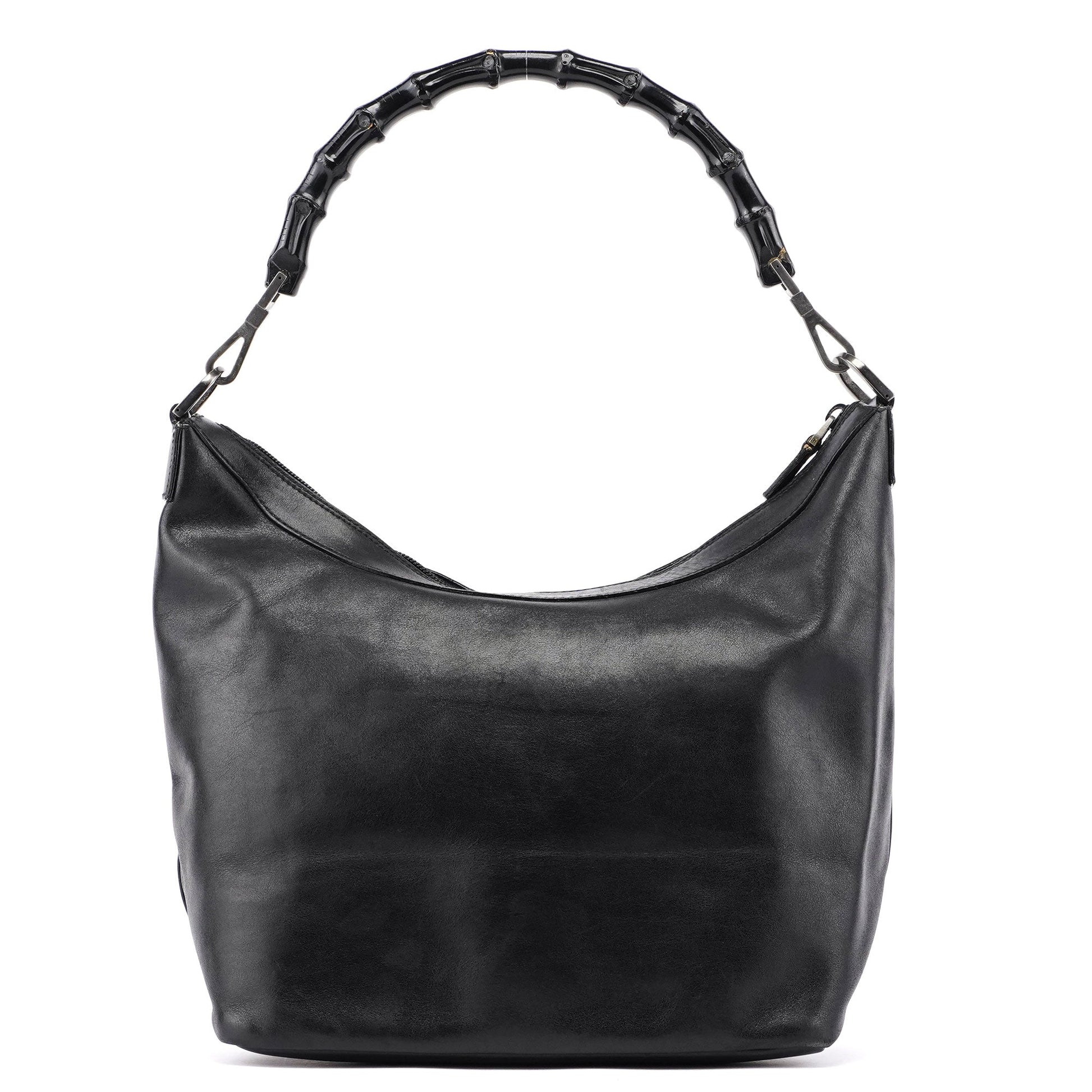 This Gucci Vitello Bamboo shoulder bag is a timeless classic designed in the late 1990s by Tom Ford. It features a black bamboo handle with Gucci logo engraving, handcrafted in black calfskin leather and silver-tone hardware. The bag's zipper-closed compartment is lined with satin and includes an interior zipper pocket.