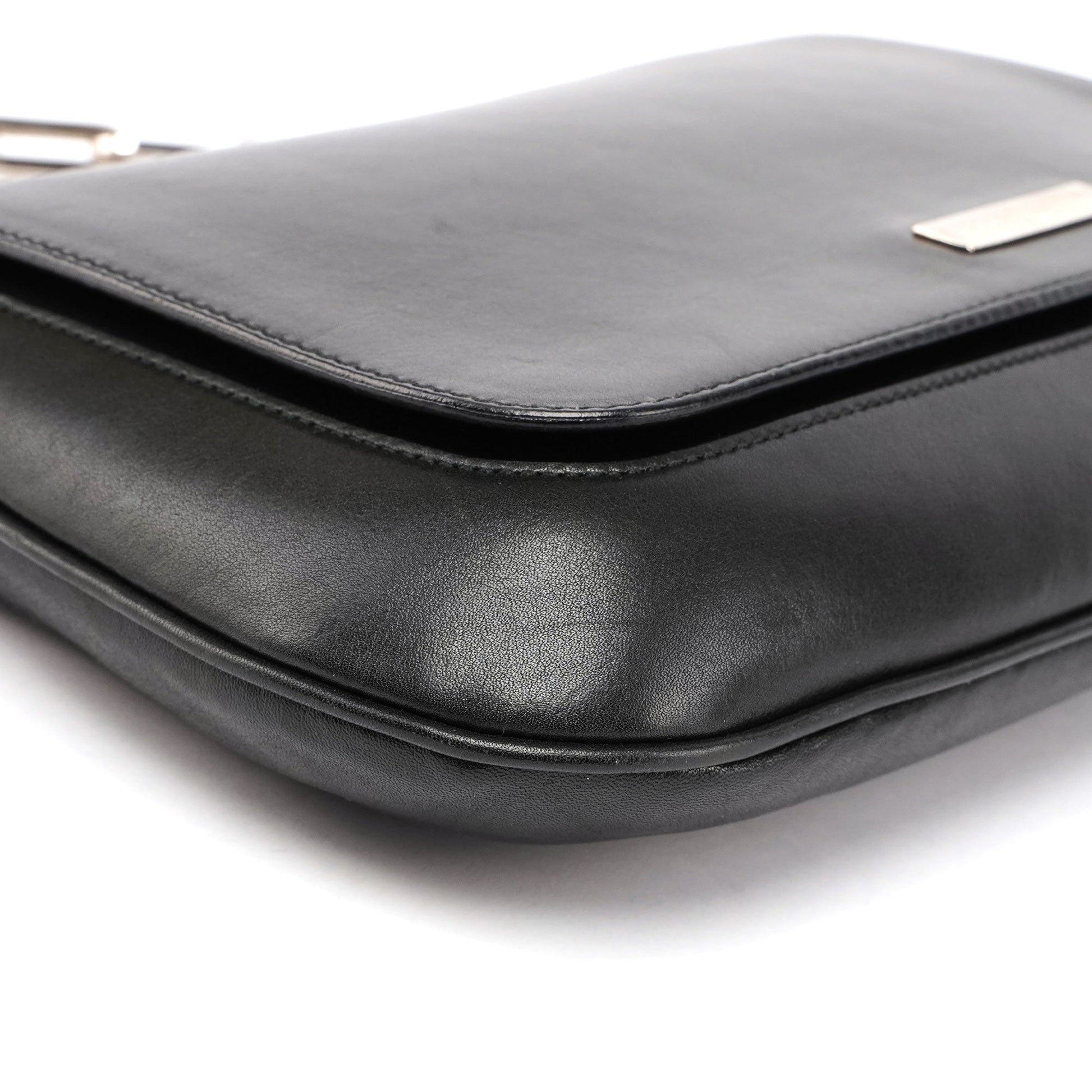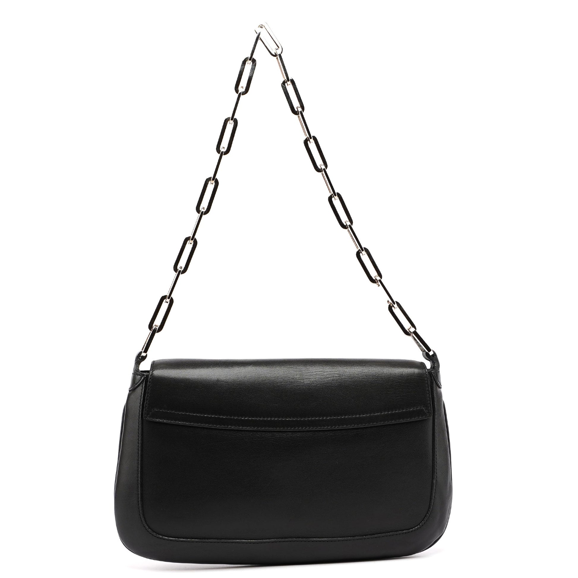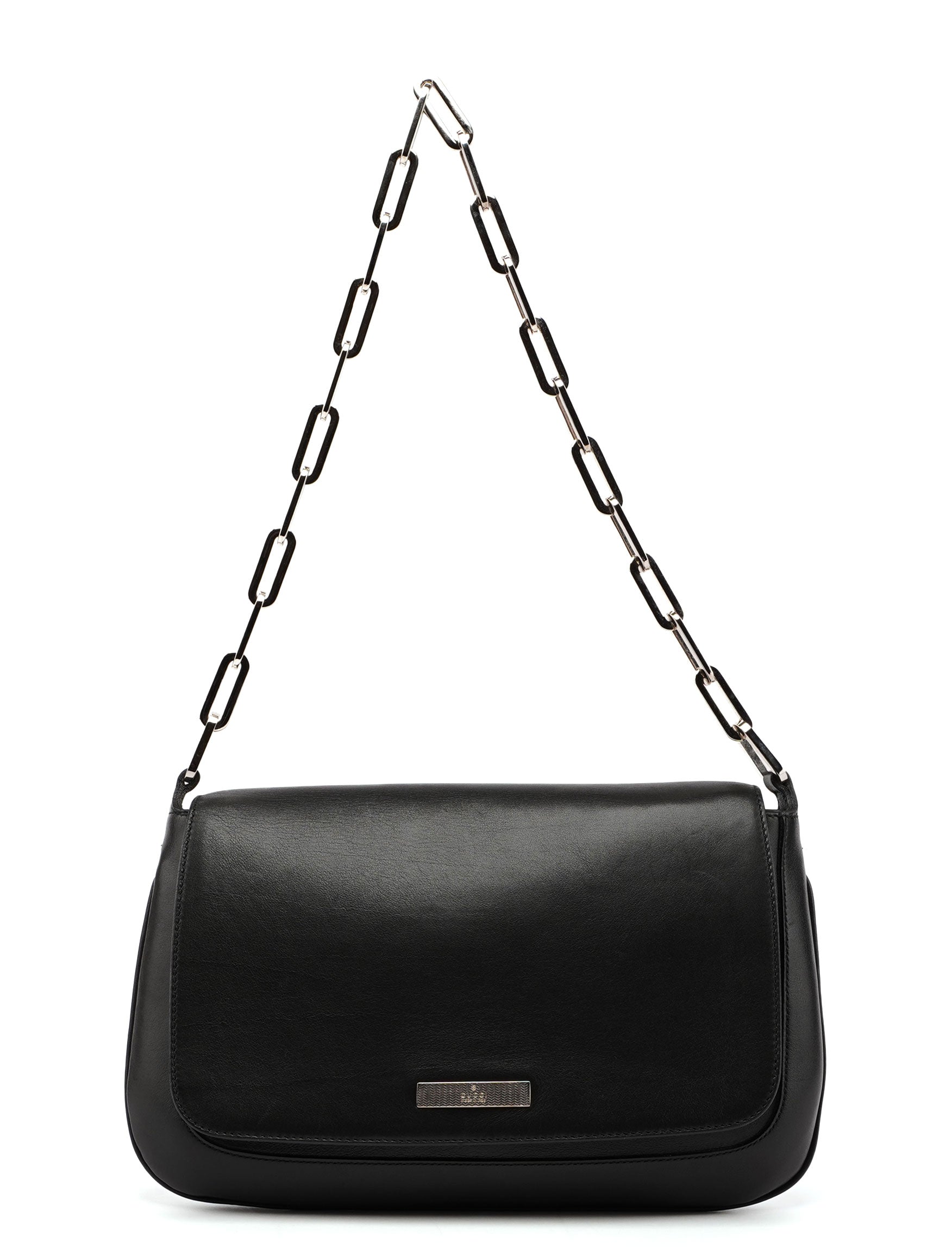 This late 1990s Gucci bag, a Tom Ford design, features handcrafted black calfskin and a silver-tone stainless steel chain handle with Gucci logo engraving. A magnetic flap closure secures the contents, while the satin-lined interior includes an interior zipper pocket. A silver Gucci logo plaque on the front adds a refined finishing touch.