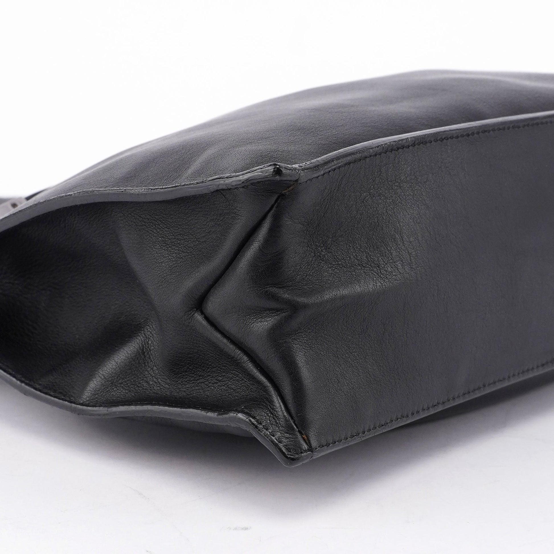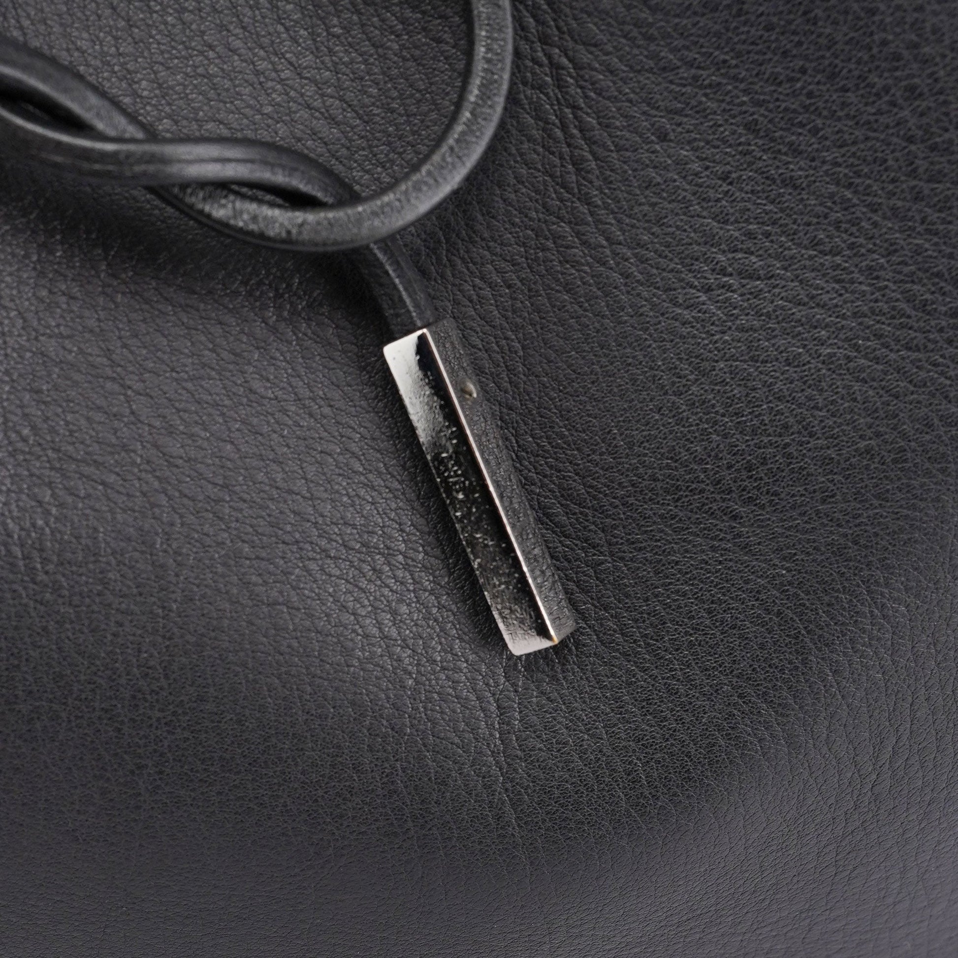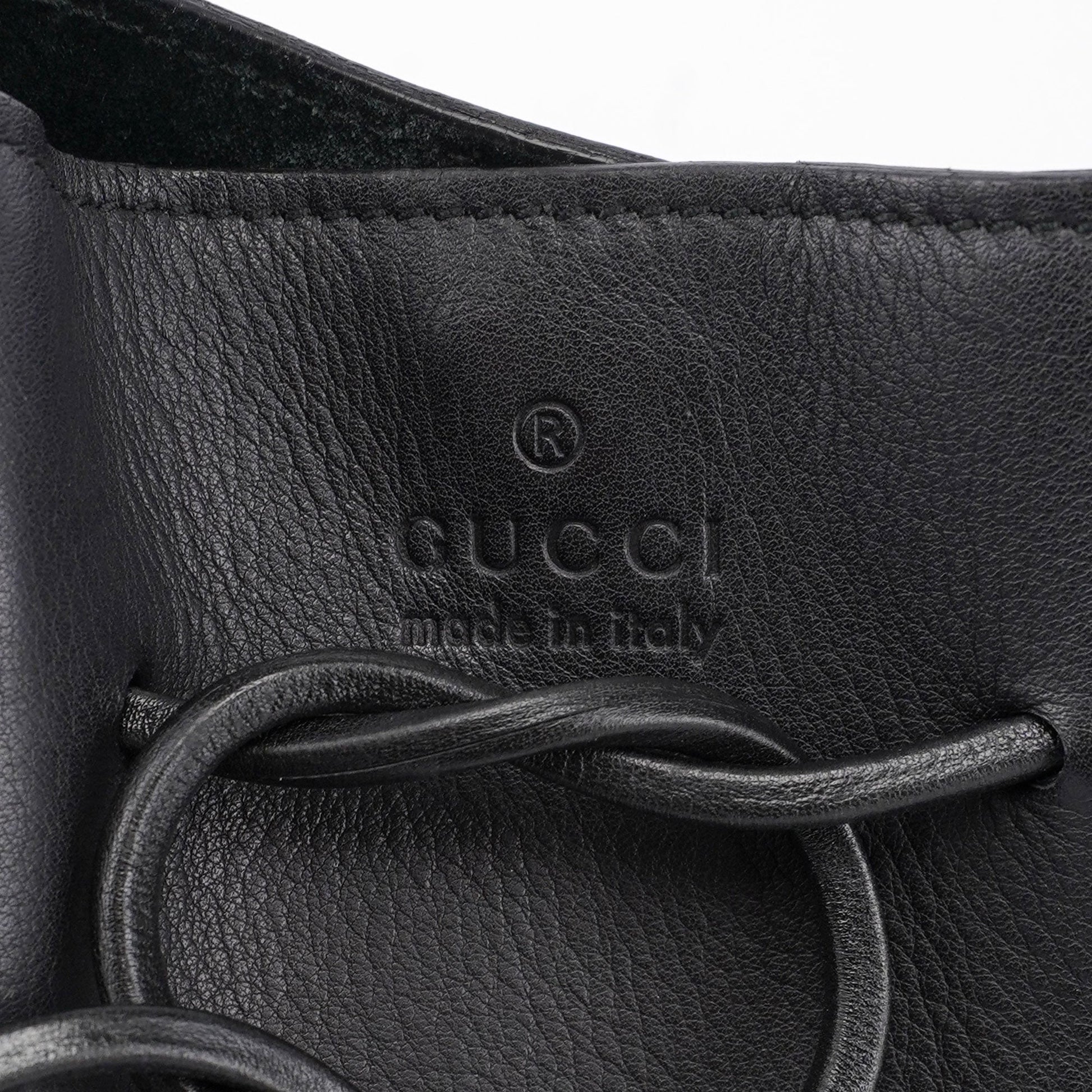 Introducing the Gucci Vitello bag, designed by Tom Ford in the late 1990s. Handcrafted from black calfskin leather with silver-tone hardware, it features a drawstring closure for easy access. The suede-lined interior includes a zipper pocket, combining luxury with practicality. The Gucci logo is subtly embossed on the front.