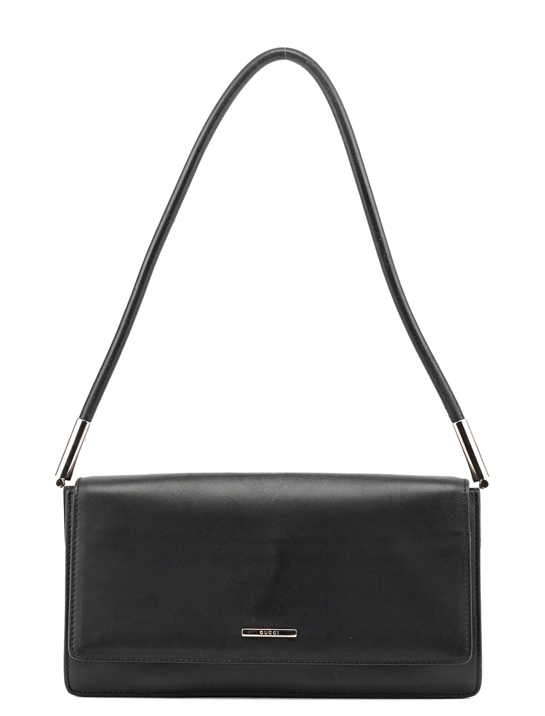 Designed by Tom Ford in the late 1990s, this Gucci hobo bag is crafted from black calfskin leather with silver-tone hardware. It features a back pocket, magnetic closure, and a satin-lined interior with a pocket, blending classic style with functionality.