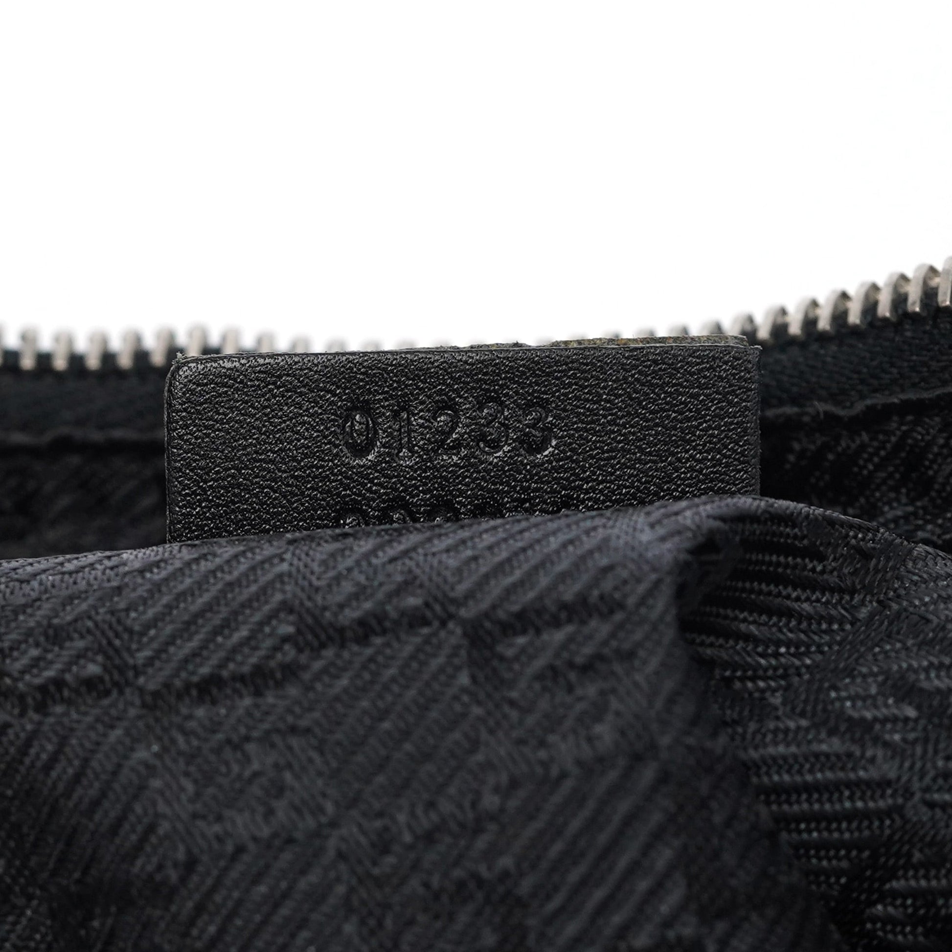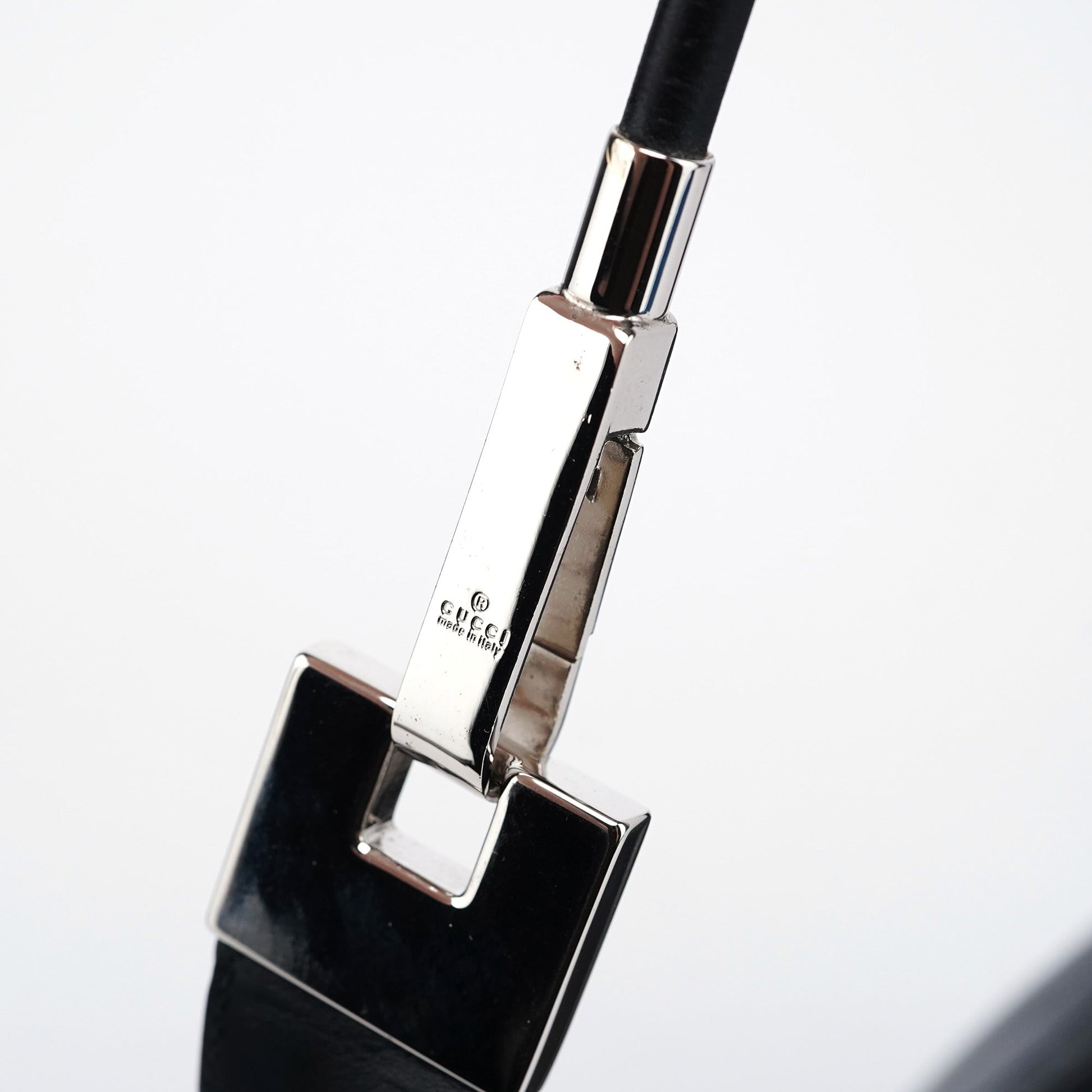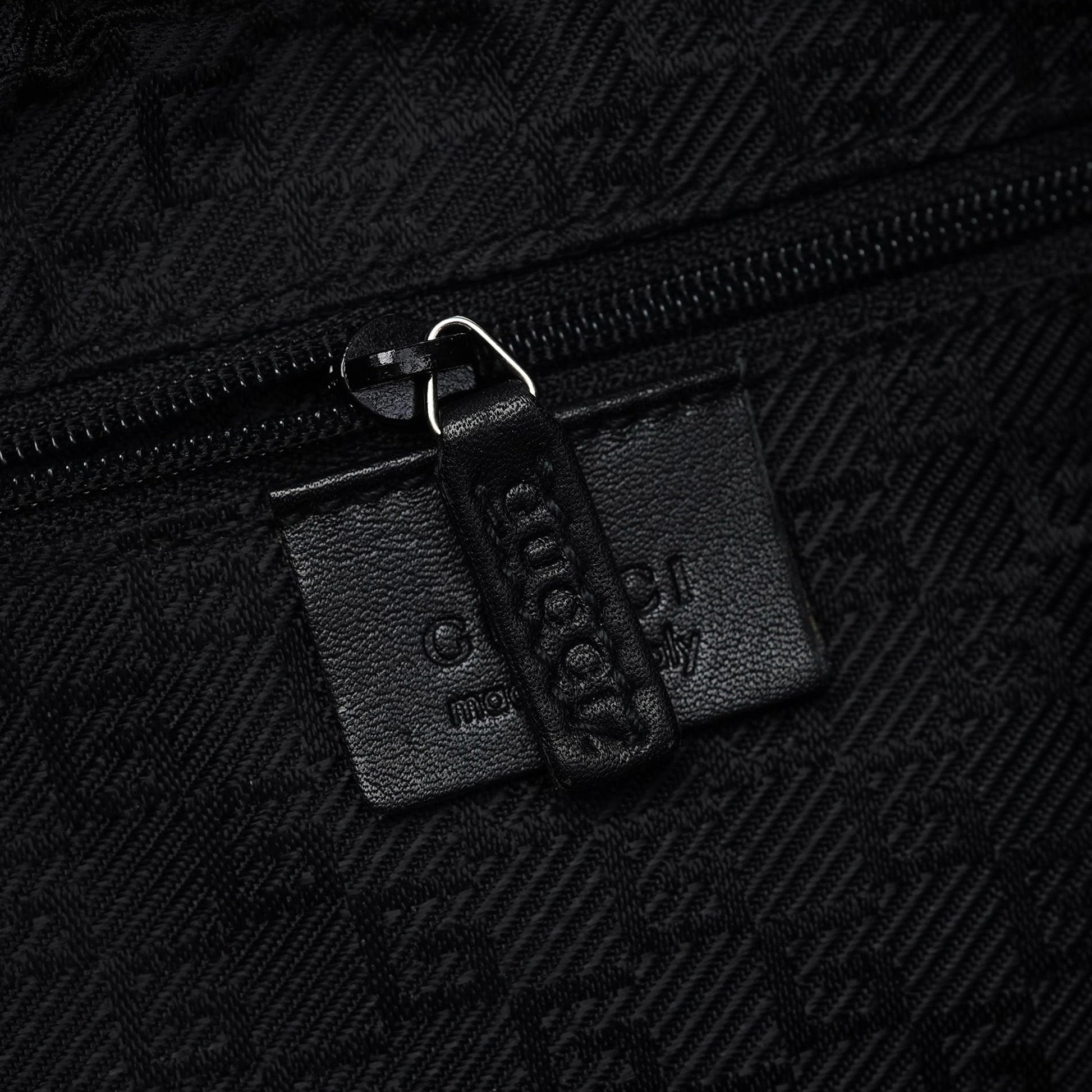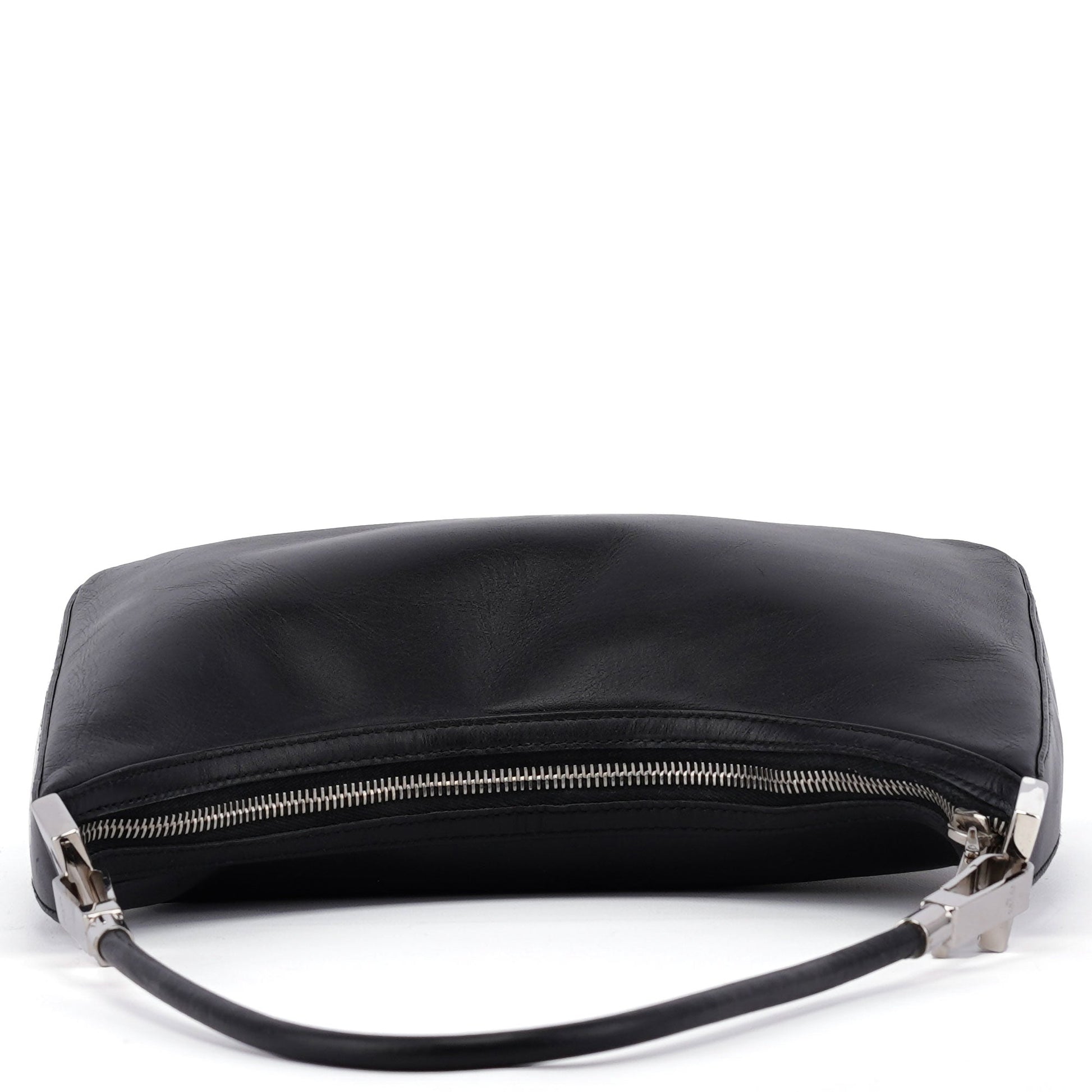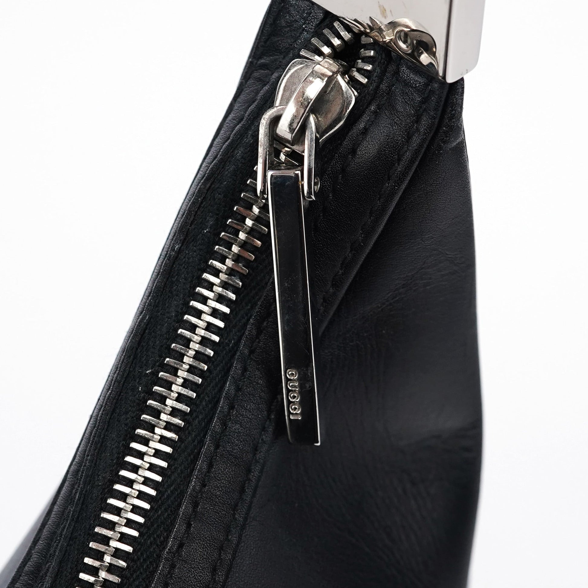 Introducing the Gucci Vitello bag, designed by Tom Ford and handcrafted from black leather. It features a zipper closure and silver-tone hardware, exuding sophistication. The satin-lined interior includes a zipper pocket for organization.