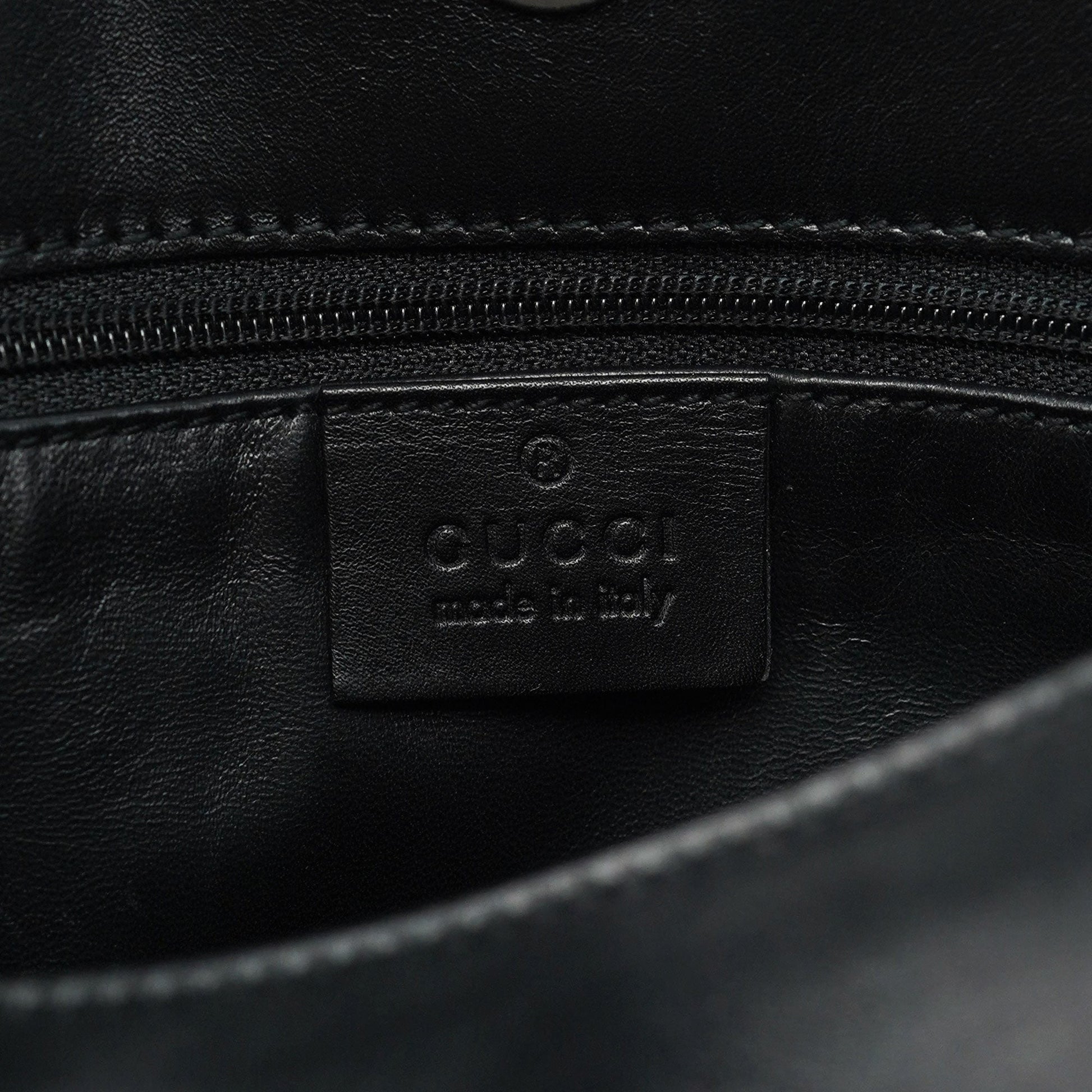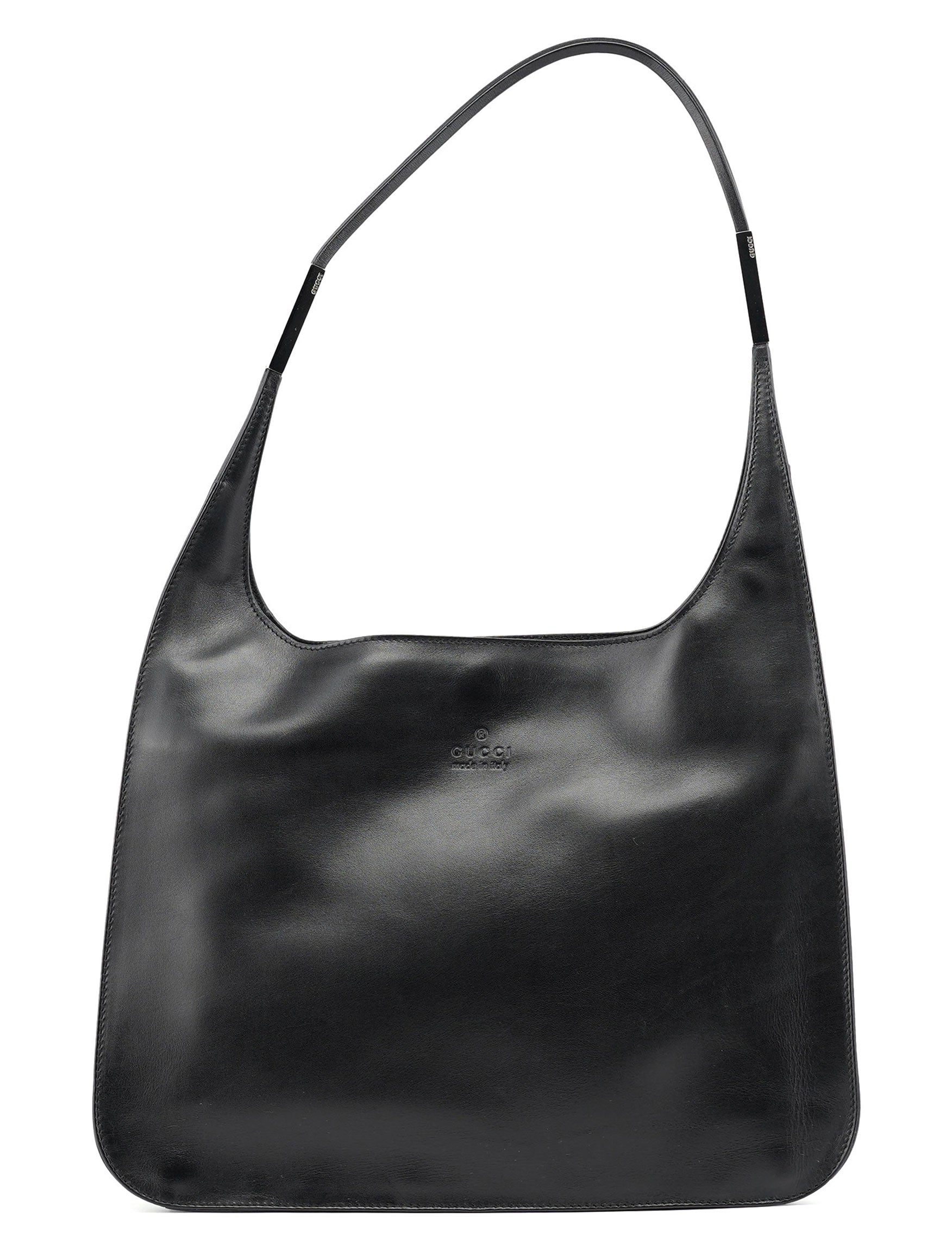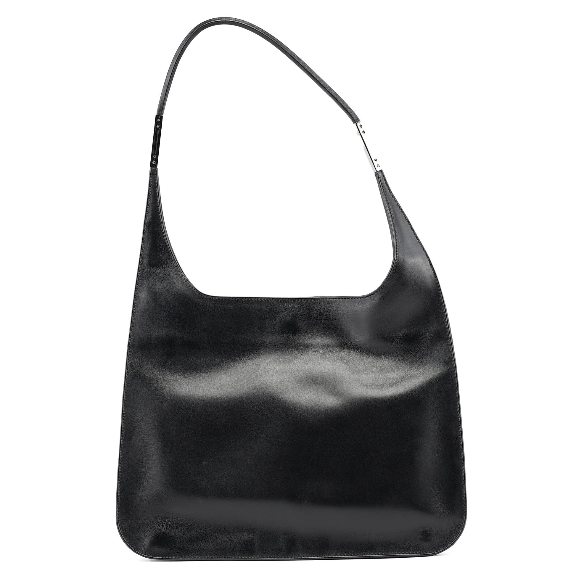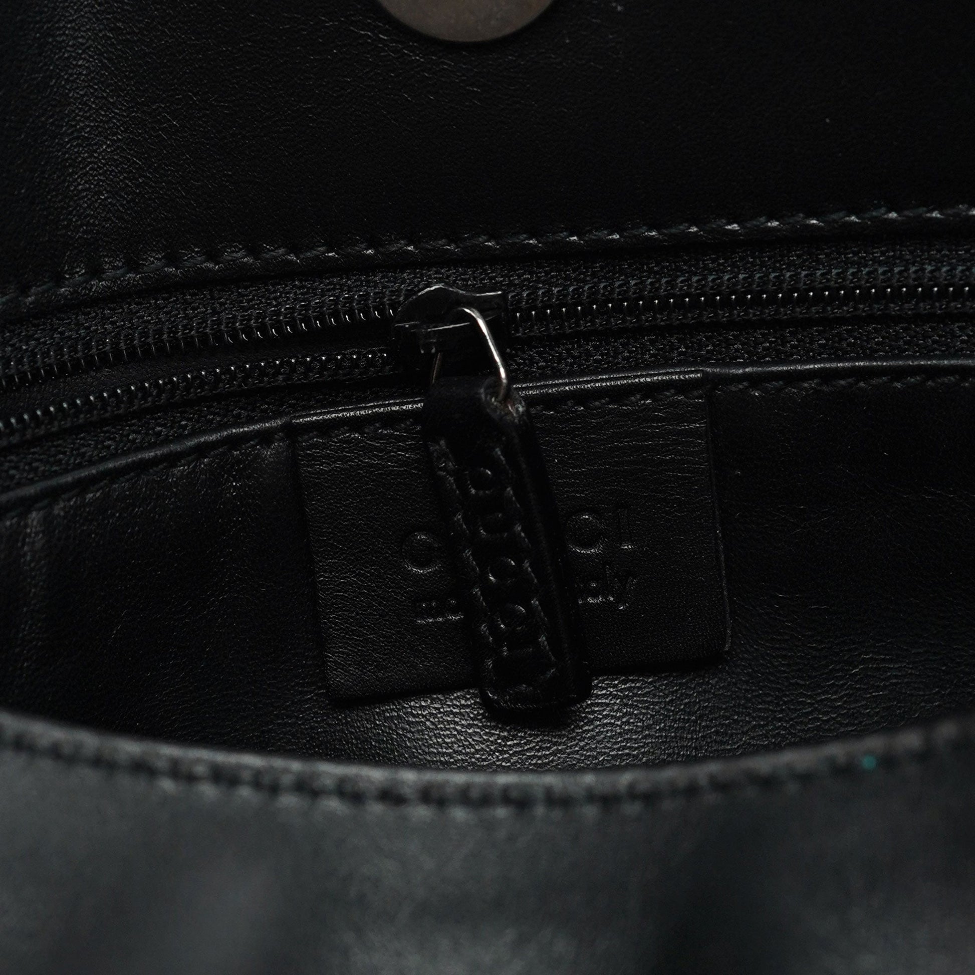 Designed by Tom Ford in the late 1990s, this Gucci shoulder bag is handcrafted from luxurious black calfskin leather. It features silver-tone hardware engraved with the Gucci logo, a secure magnetic closure, and a calfskin-lined interior with a zipper pocket. The Gucci logo is subtly embossed at the front, adding a refined touch to this timeless design.