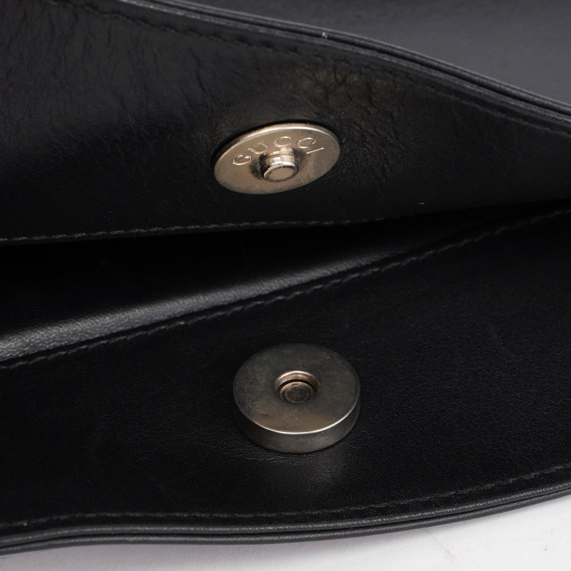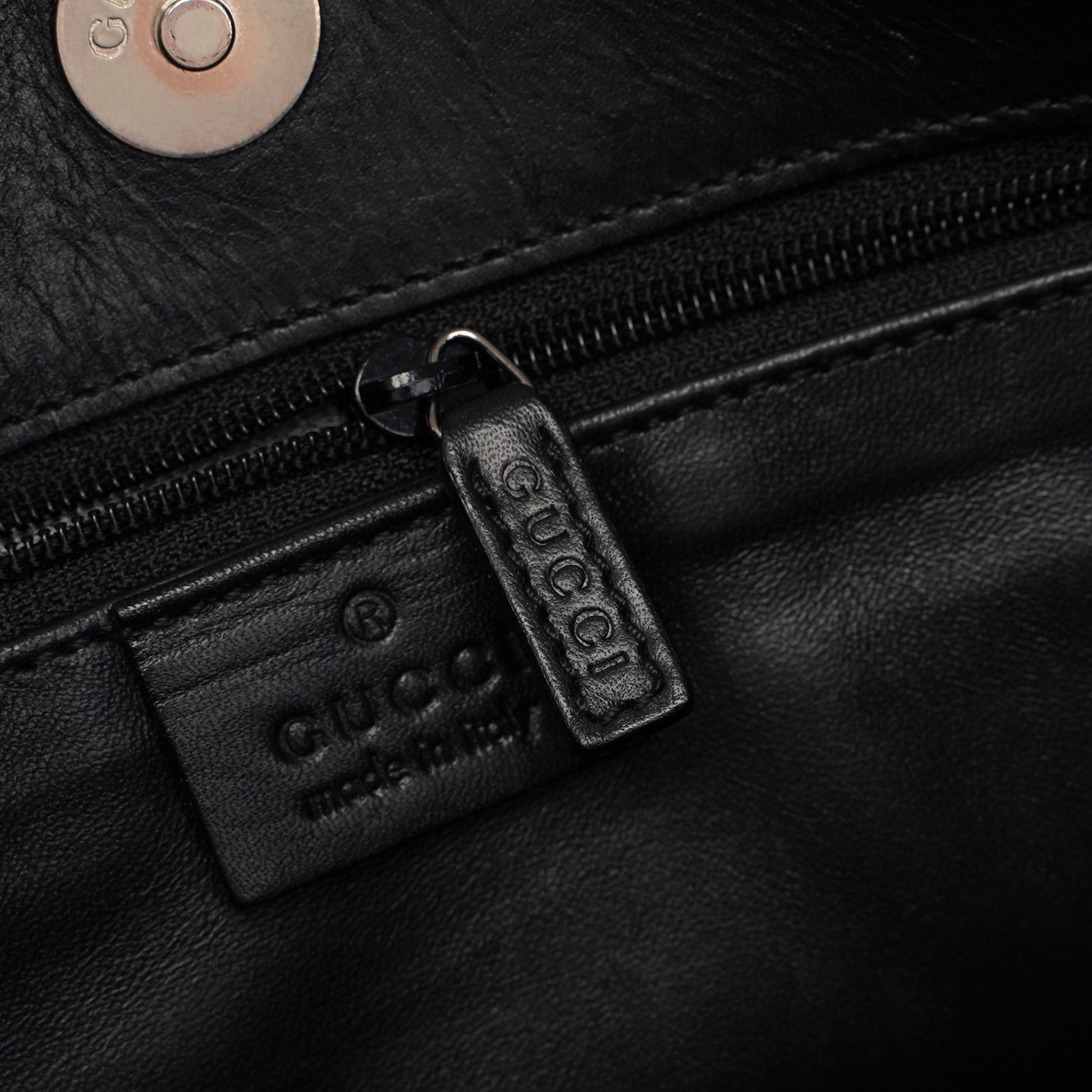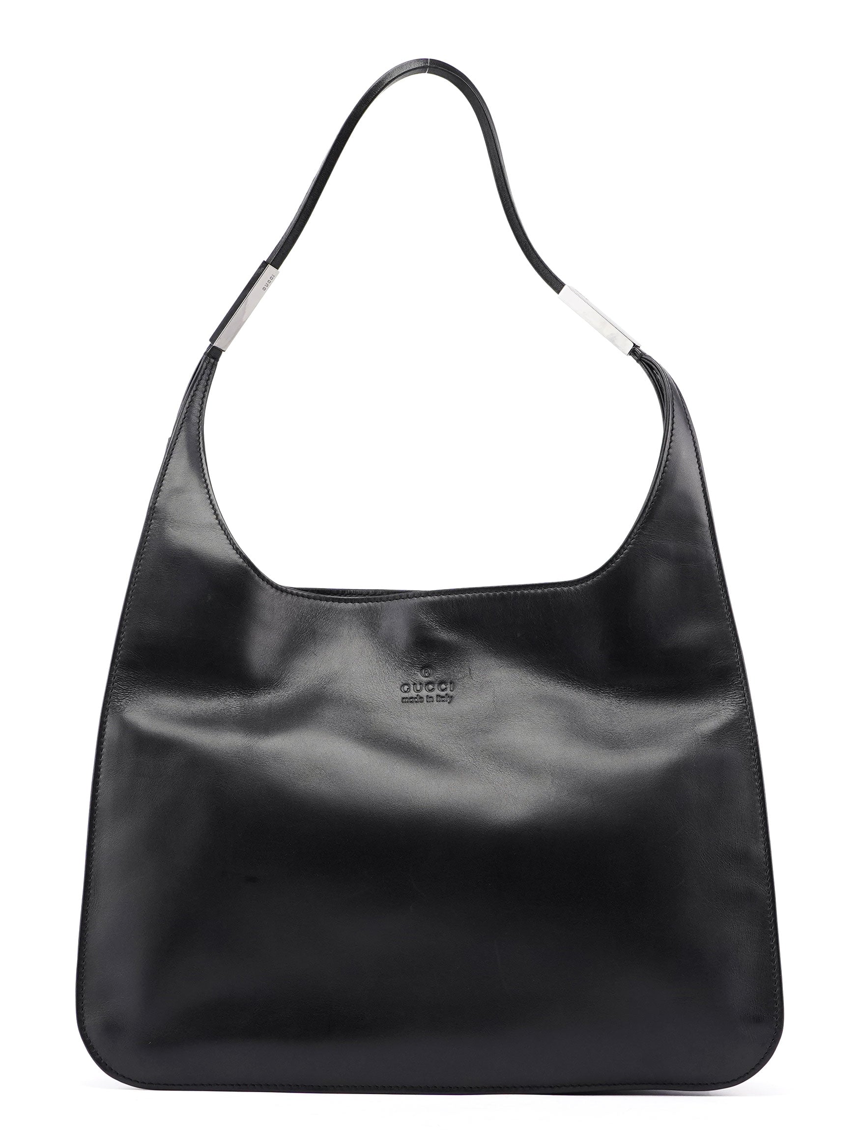 Designed by Tom Ford in the late '90s, the Gucci shoulder bag is handcrafted in black calfskin leather. It features silver-tone hardware engraved with the Gucci logo, a magnetic closure, and the interior is calfskin-lined with a zipper pocket. The Gucci logo is subtly embossed on the front.