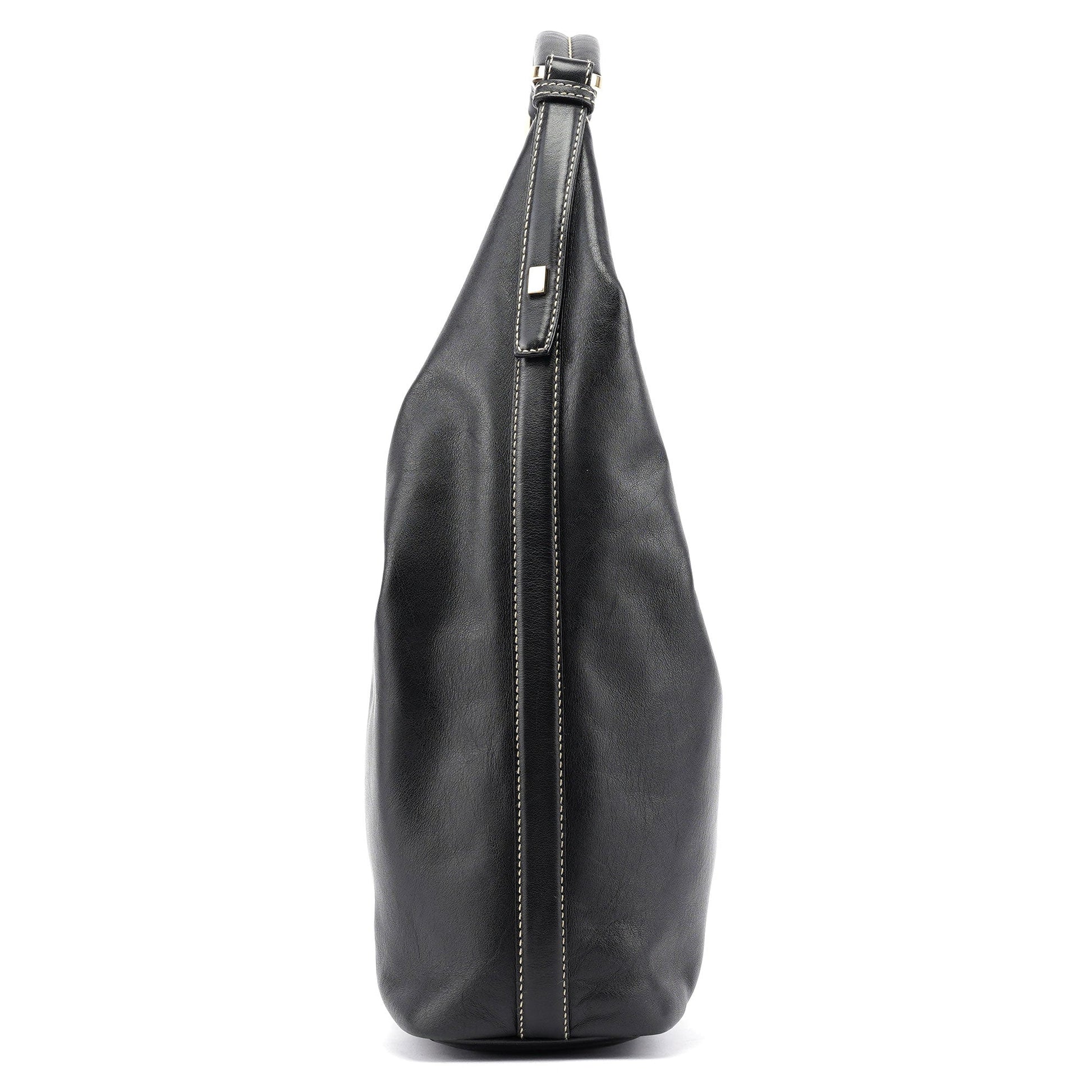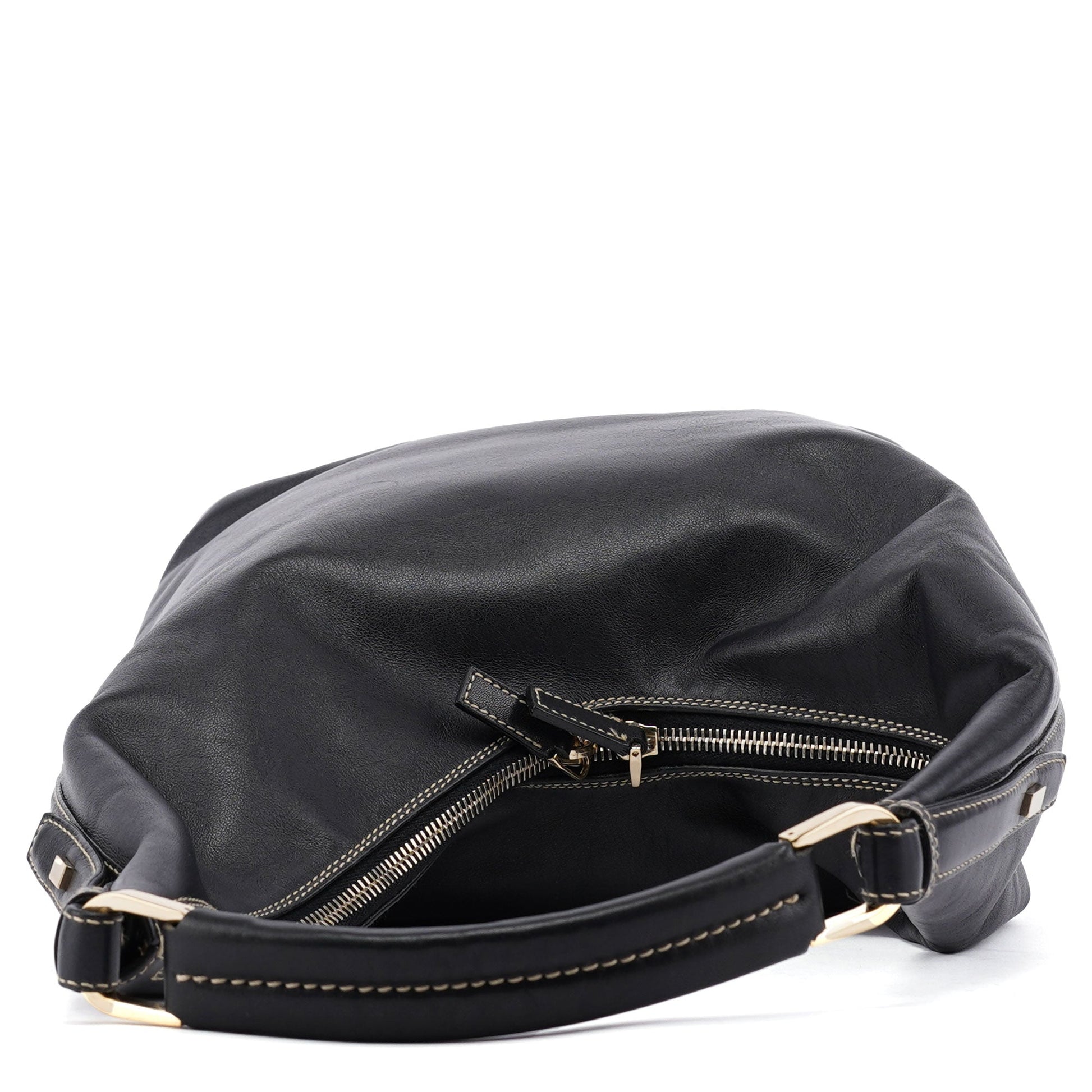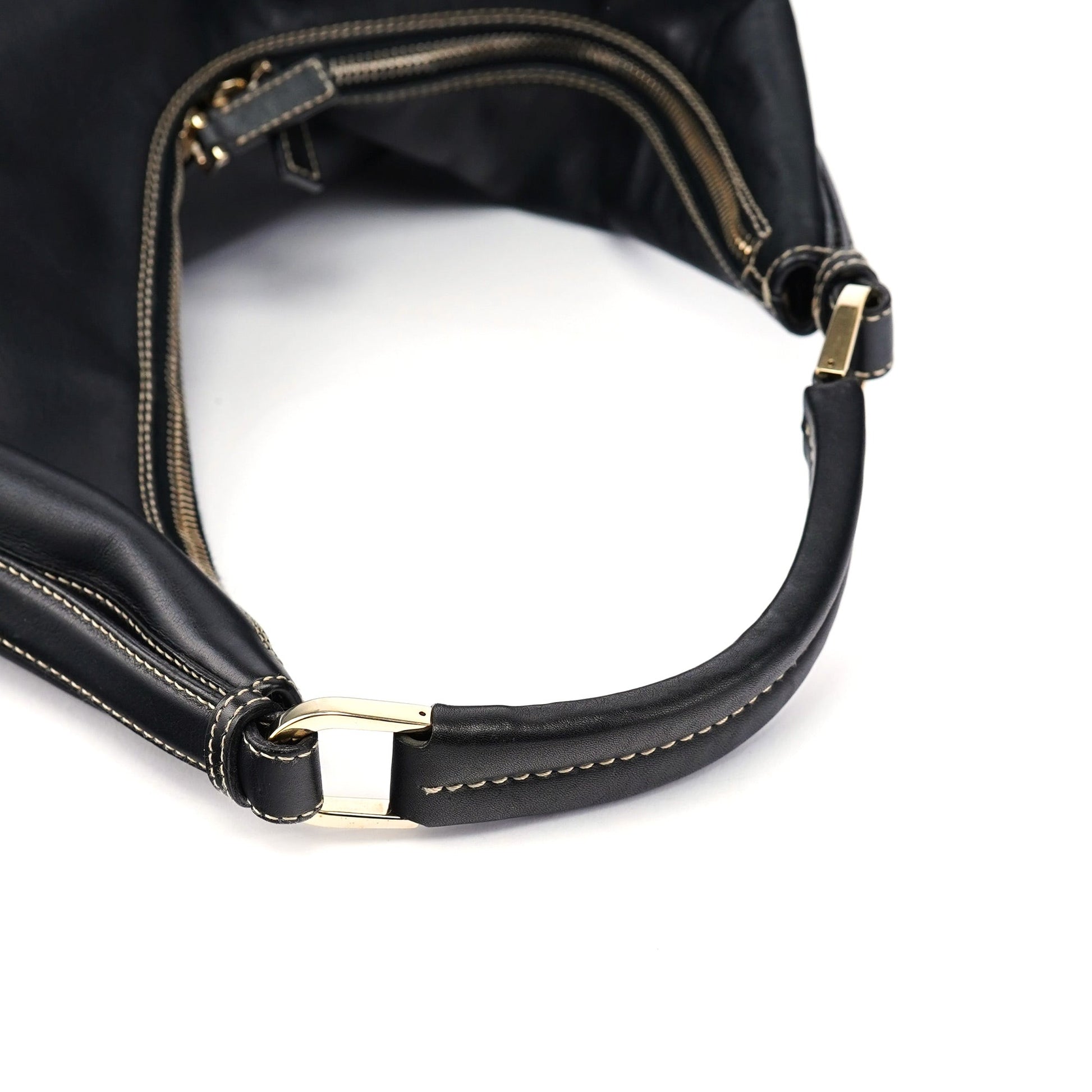 Designed by Tom Ford in the late 1990s, this Gucci hobo bag is handcrafted from black calfskin leather and features gold-tone hardware, contrast stitching, and a double zipper closure. The GG monogram suede-lined interior includes a zipper pocket, while the Gucci logo plate at the front adds a signature touch of timeless elegance.