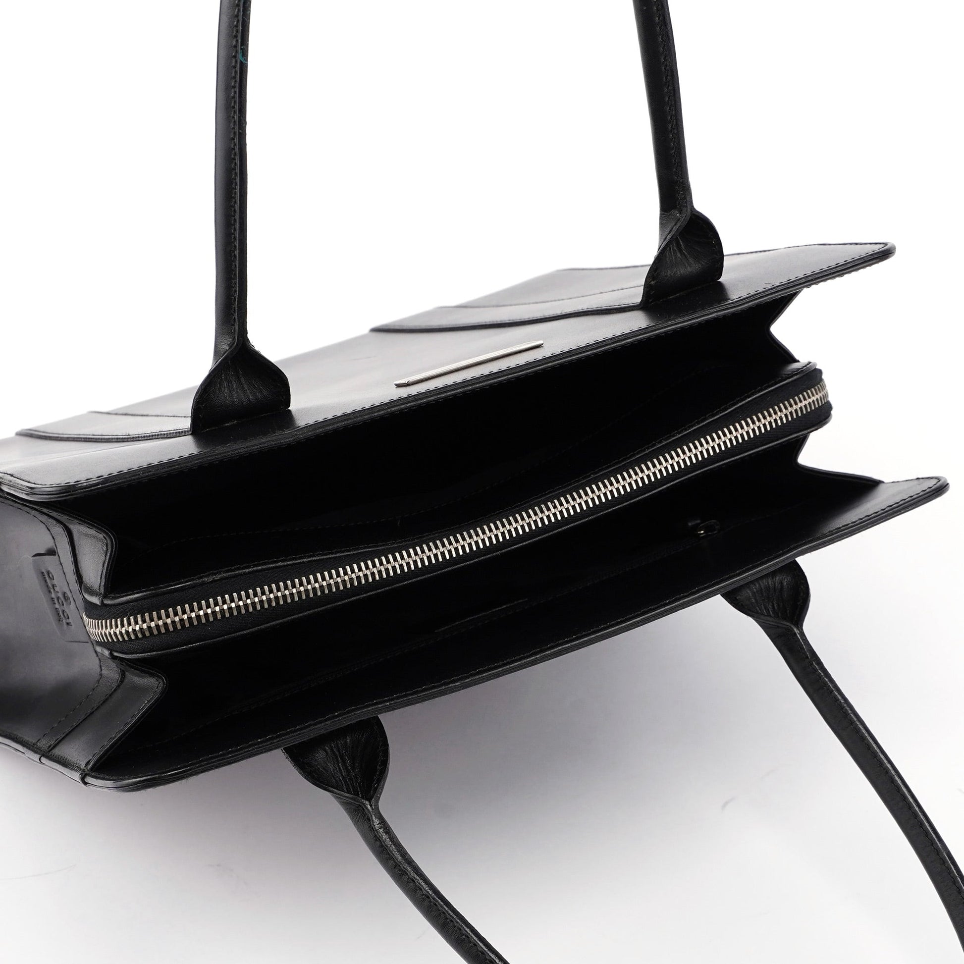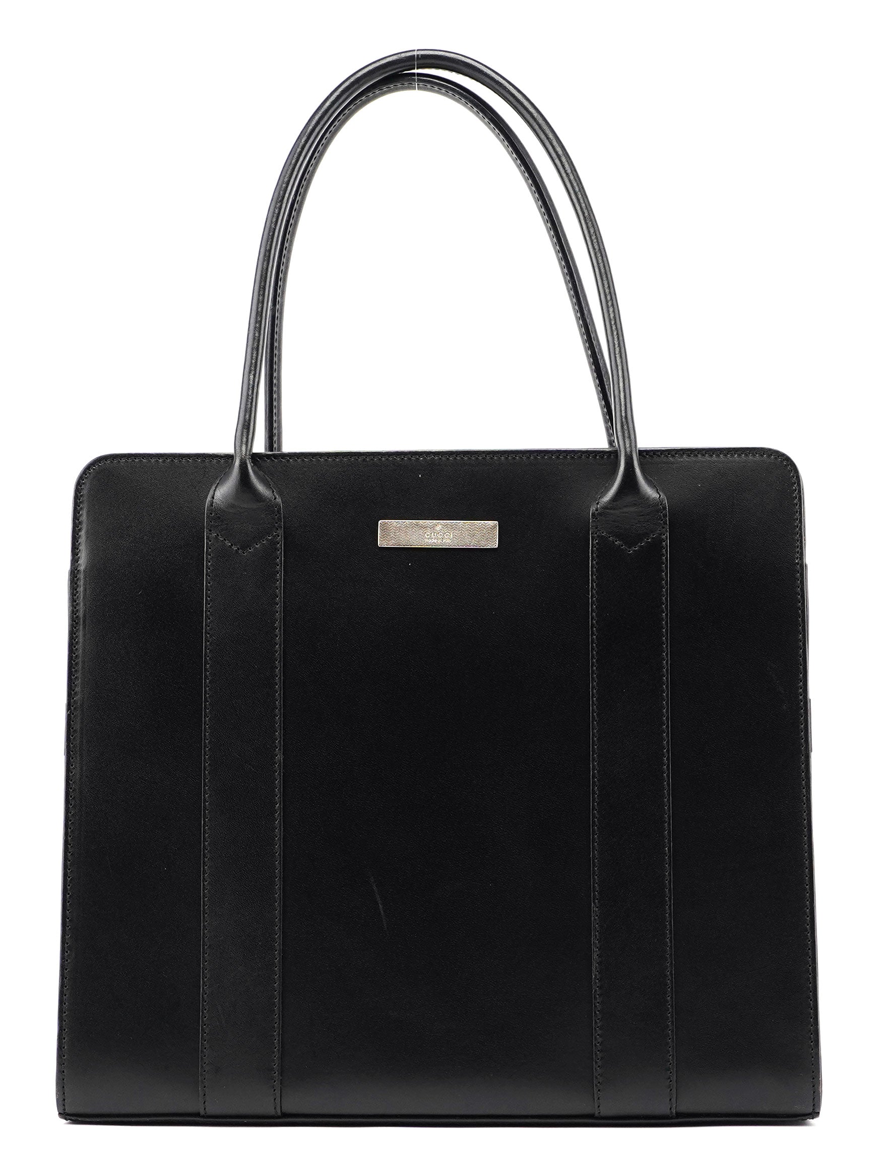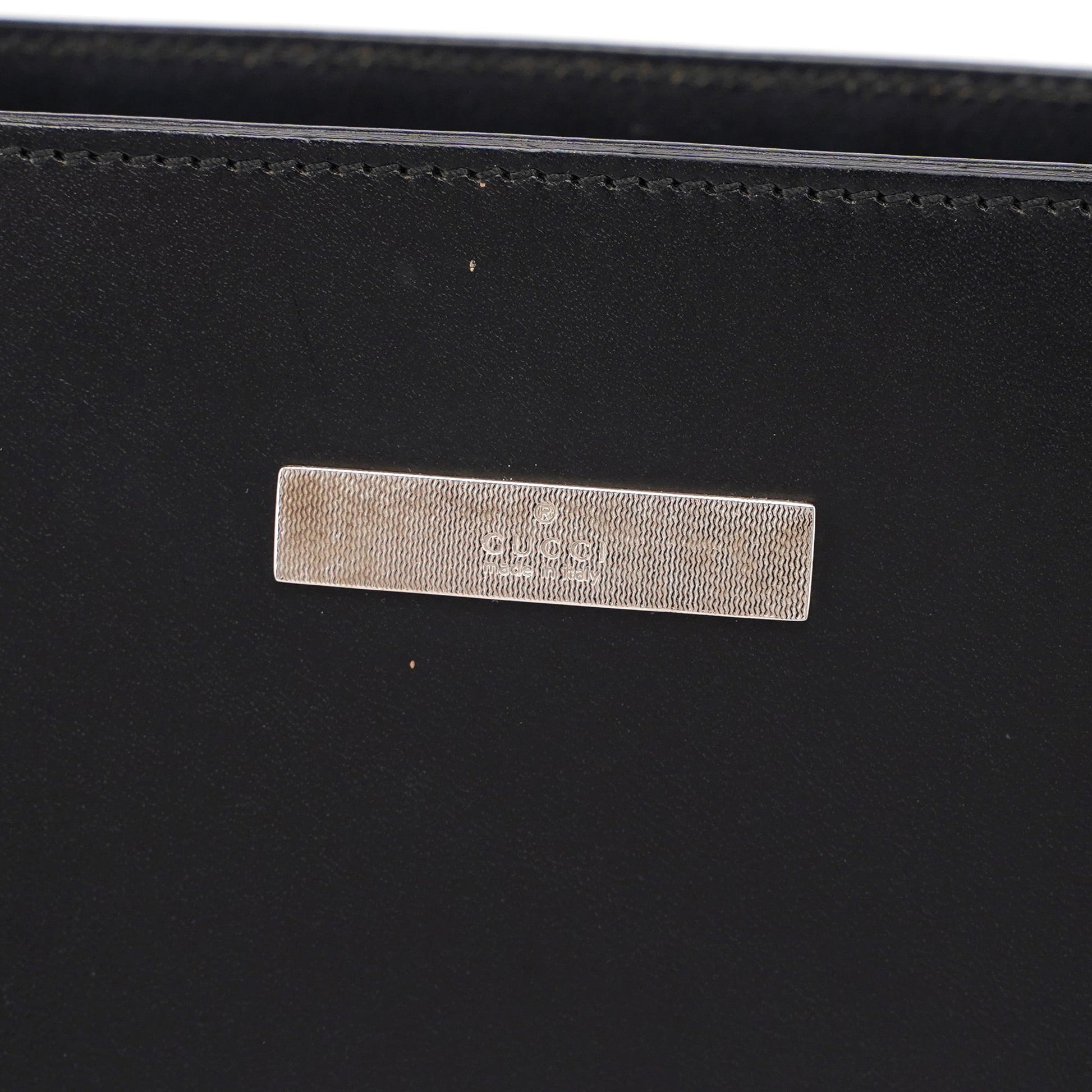 Handcrafted from black calfskin leather, this Gucci Vitello Tote Bag by Tom Ford from the late 1990s features three interior compartments, one with a zipper closure. All compartments are lined in satin and include an interior zipper pocket. The Gucci logo plate adorns the front, showcasing timeless elegance.