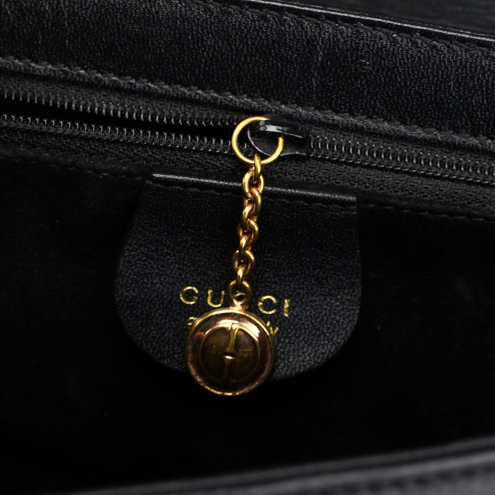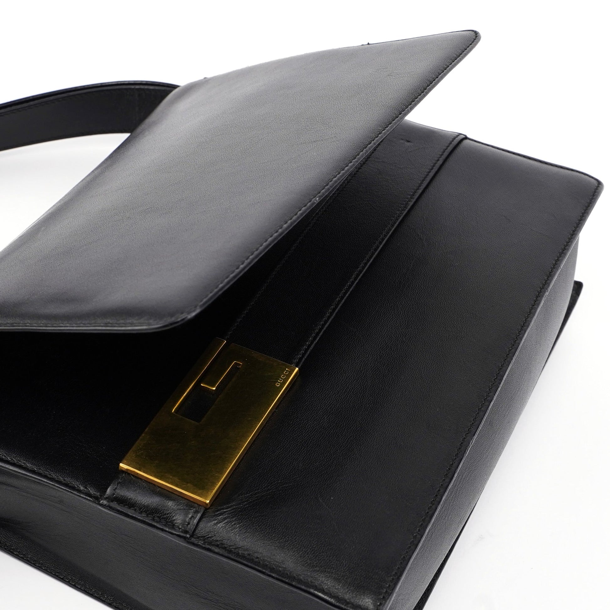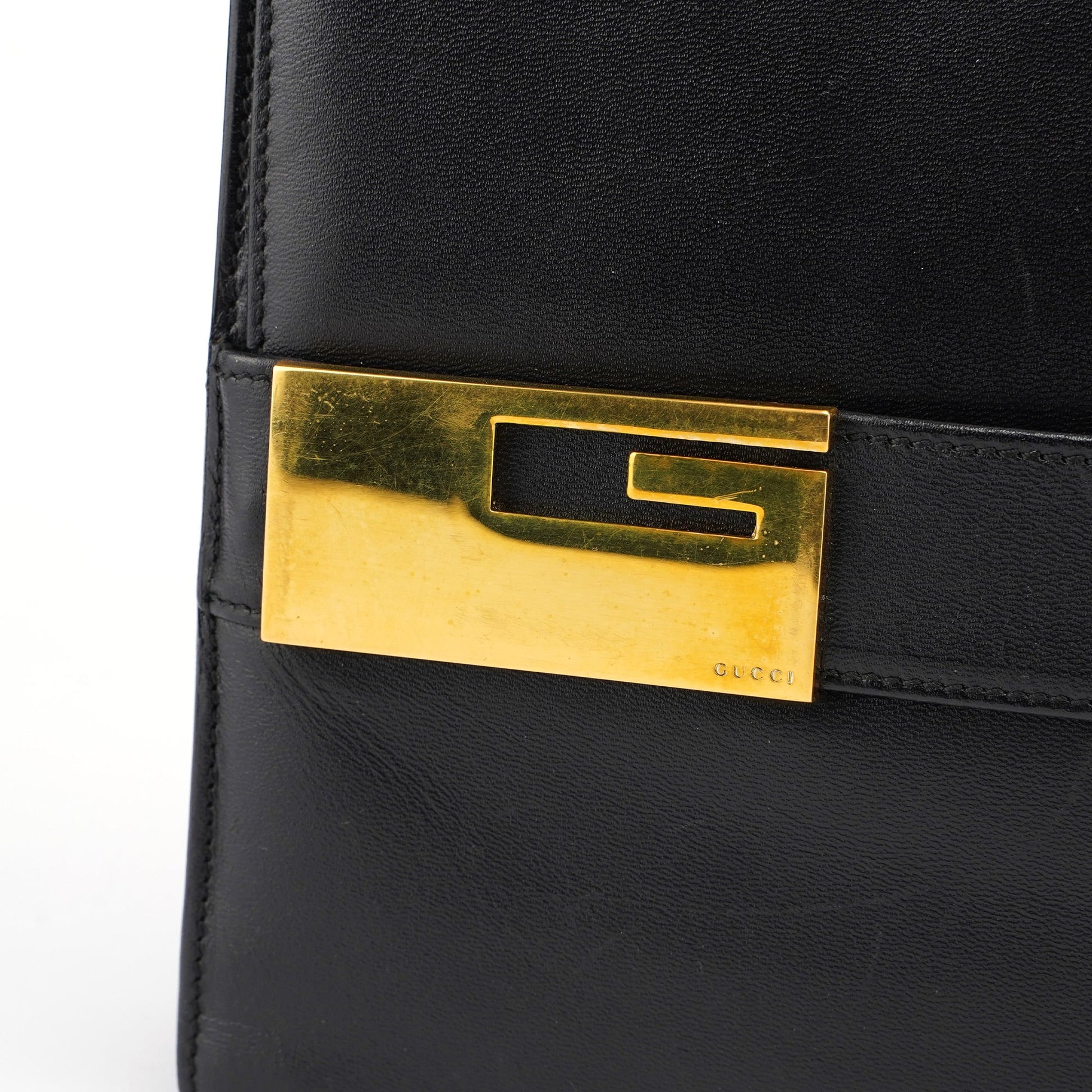 Designed by Tom Ford in the late '90s, the Gucci Square G bag exudes elegance. Its black calfskin leather exterior is accentuated by gold-tone hardware bearing the iconic Gucci logo. The flap closure opens to reveal a luxurious interior lined with sumptuous suede, complete with a convenient interior zipper pocket.