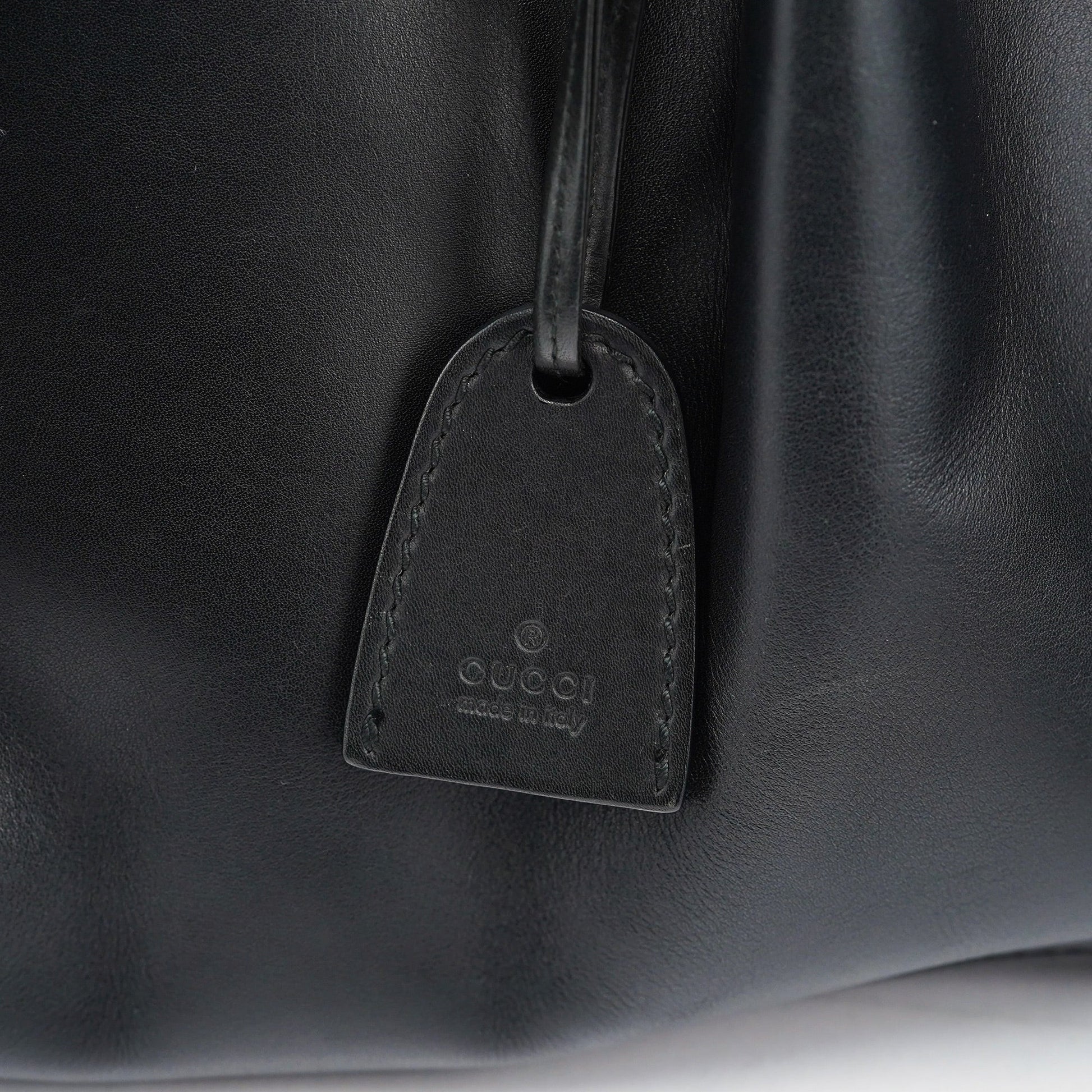 Designed by Tom Ford in the late 1990s, the Gucci Vitello handbag is handcrafted from black calfskin leather and features silver-tone hardware. A leather Gucci logo bangle and an attached pouch add distinctive charm, while the magnetic closure secures a suede-lined interior that includes practical storage. A seamless blend of elegance and functionality.