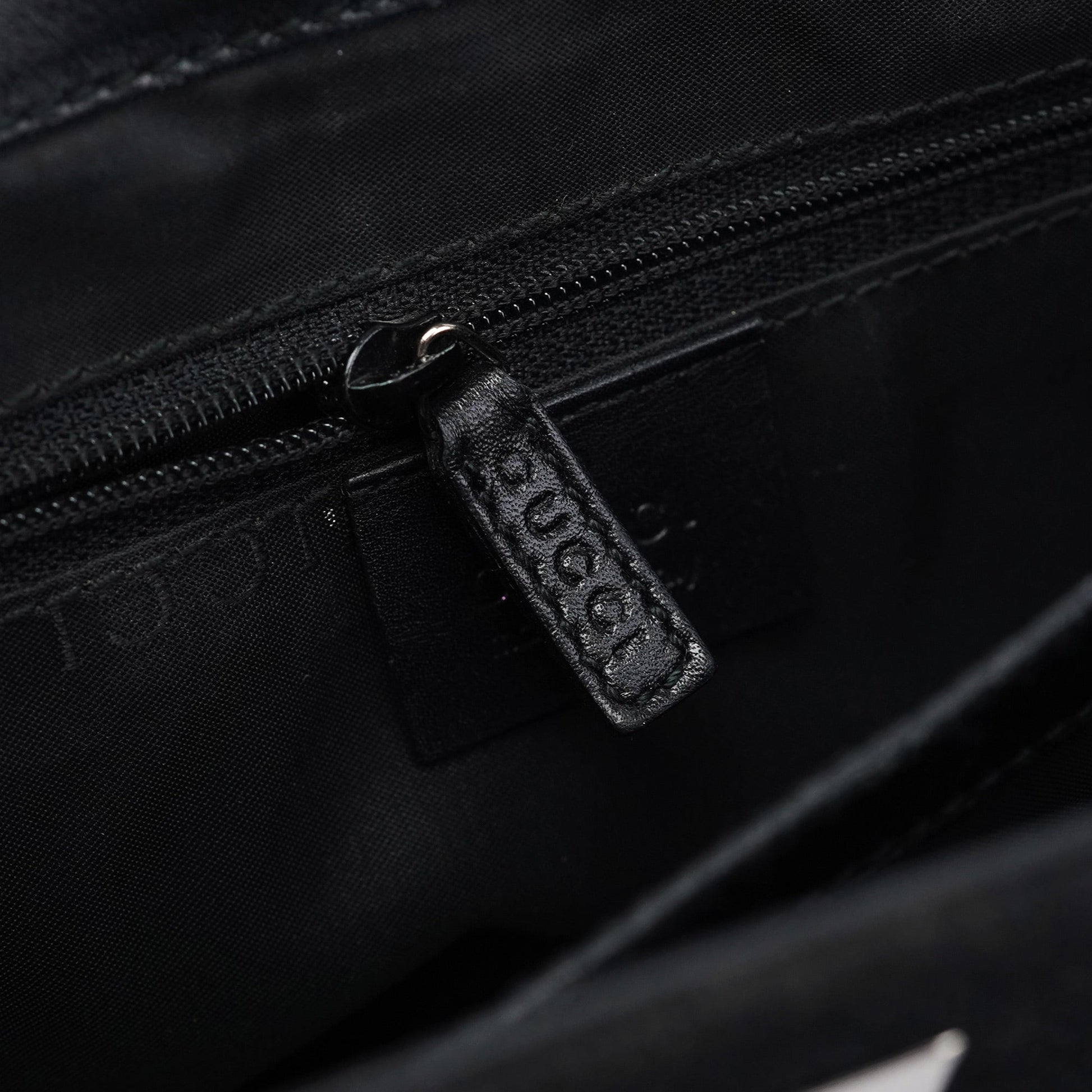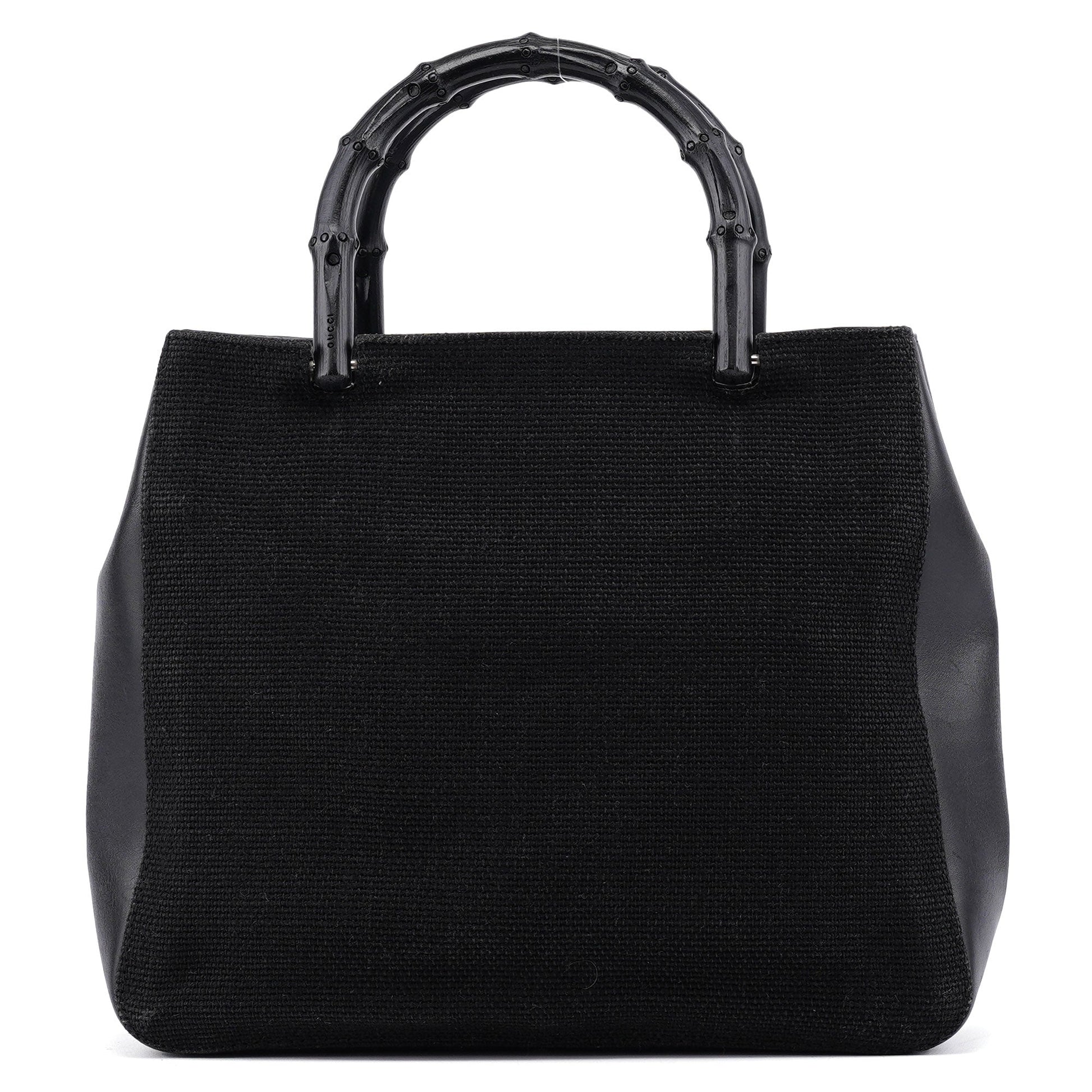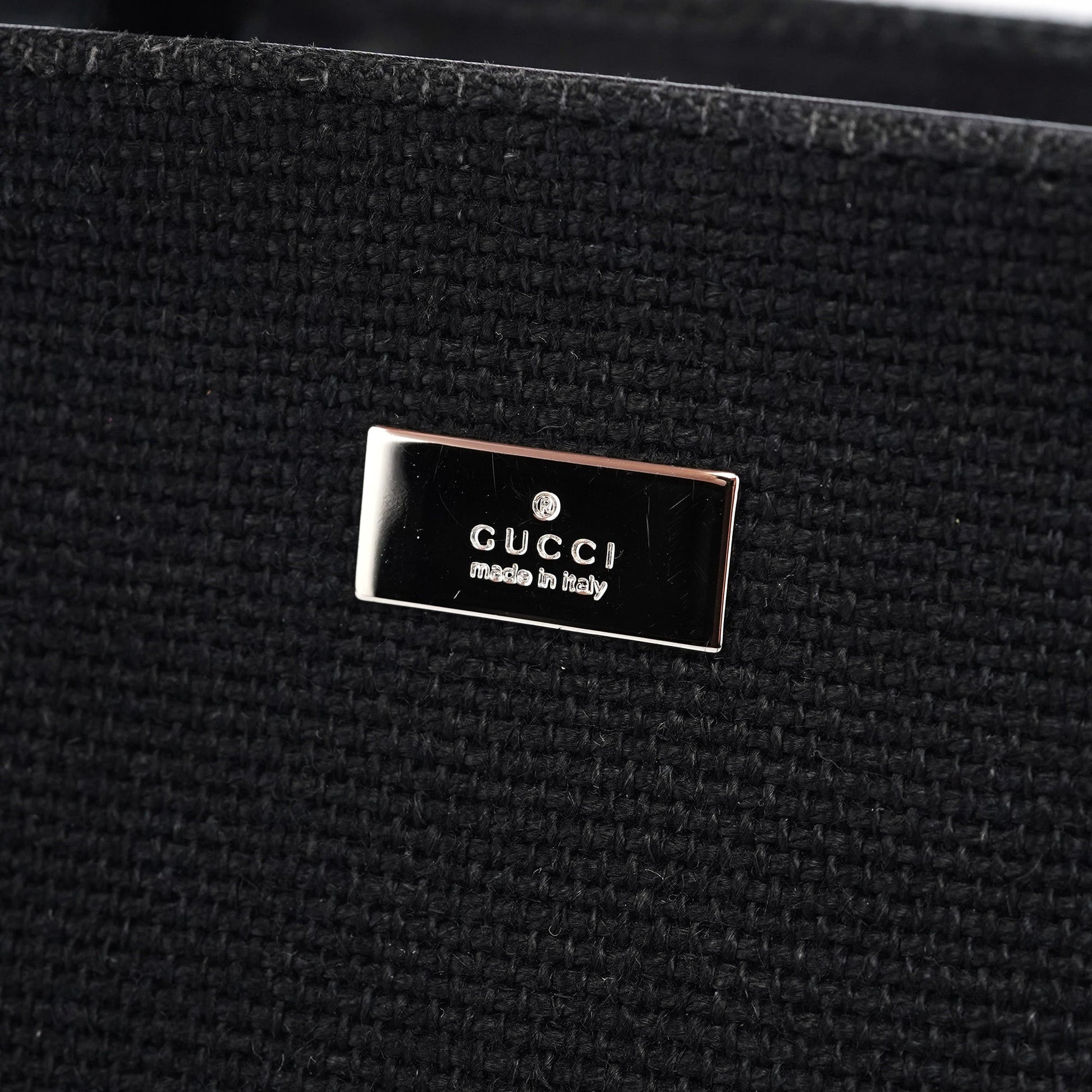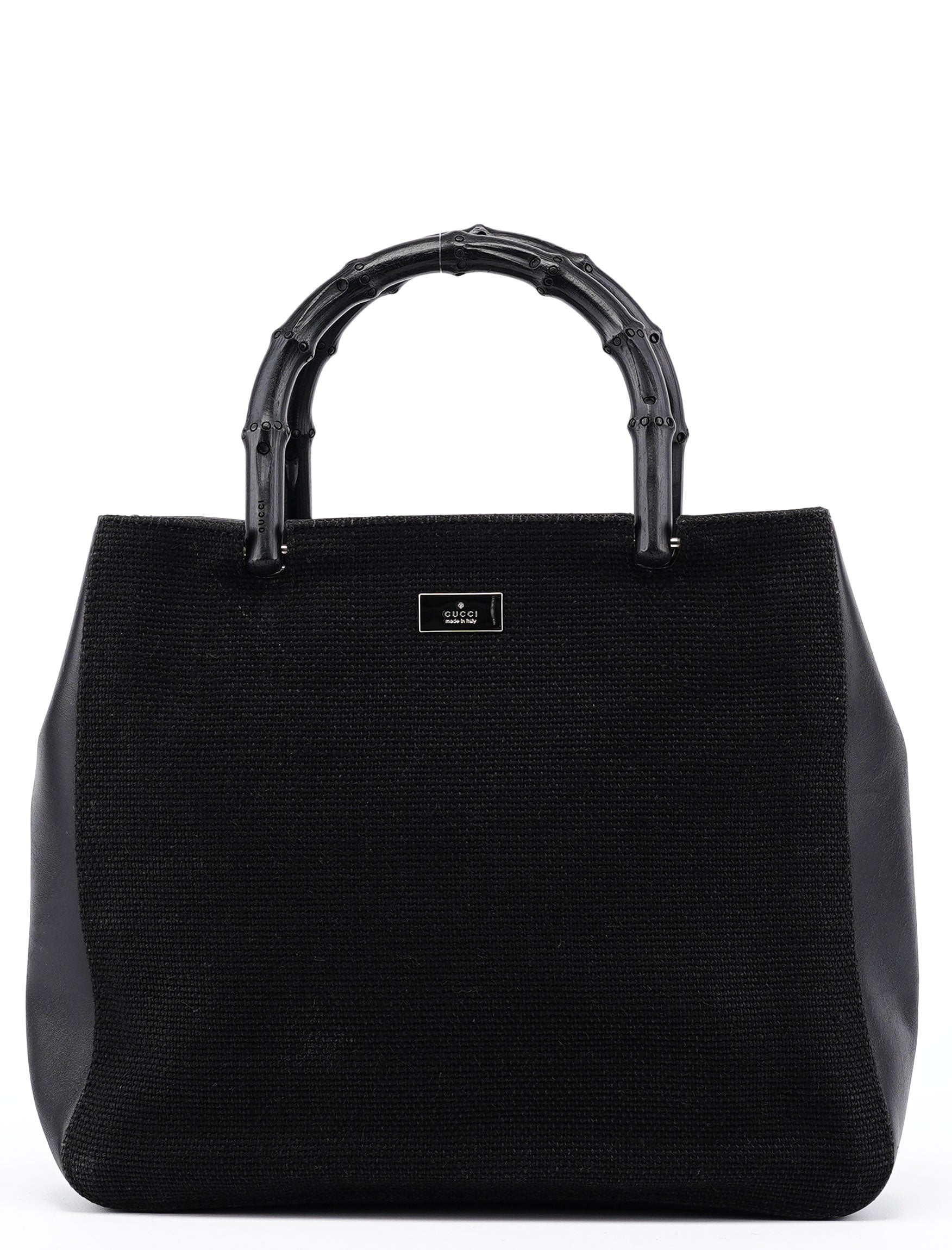 Designed by Tom Ford in the late 1990s, this Gucci Bamboo bag is handcrafted from black canvas with two classic gloss black bamboo handles. It features silver tone hardware, two compartments, and a satin-lined interior with an interior zipper pocket. The Gucci logo plate adorns the front, showcasing timeless elegance.