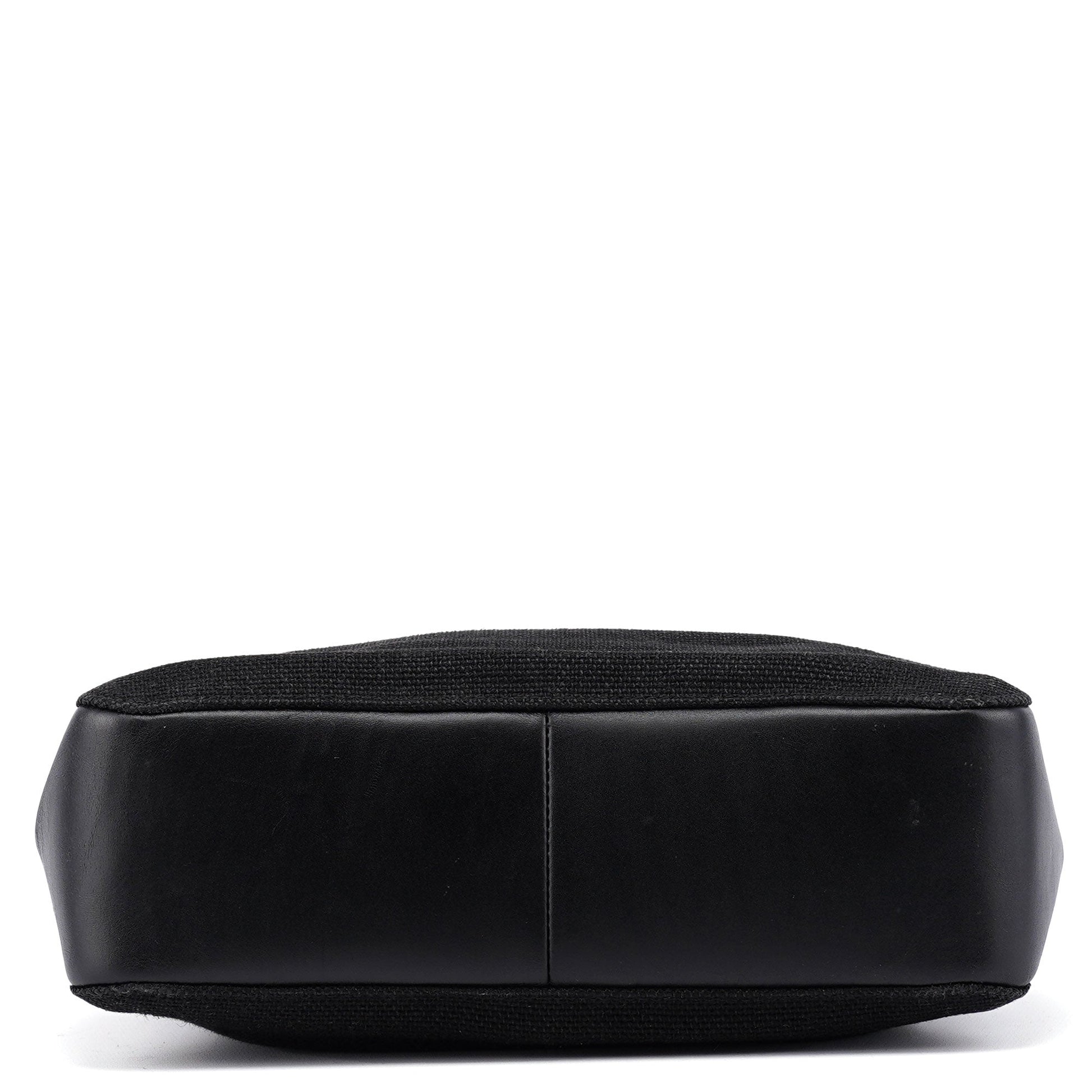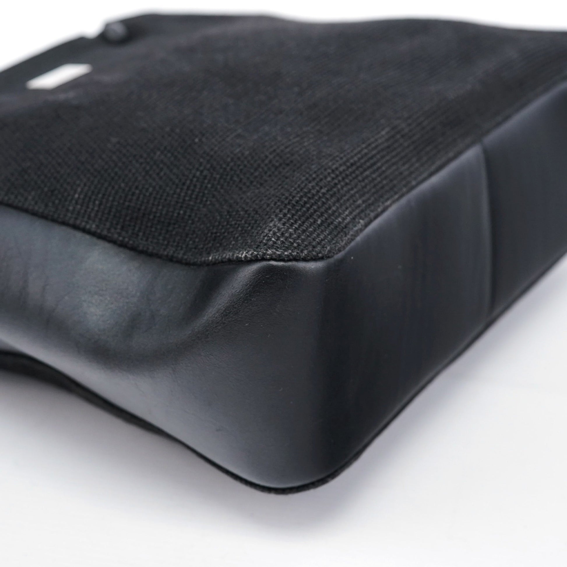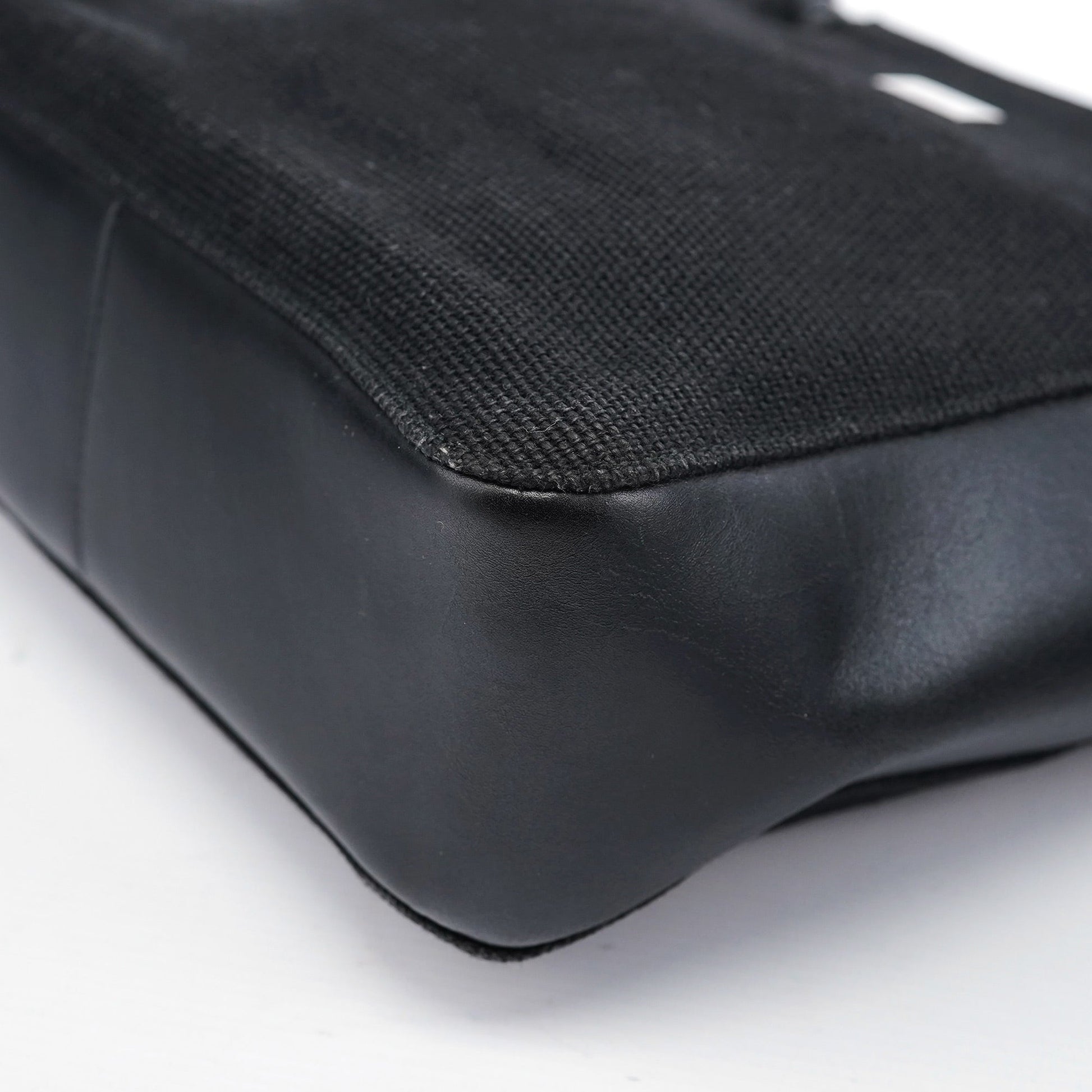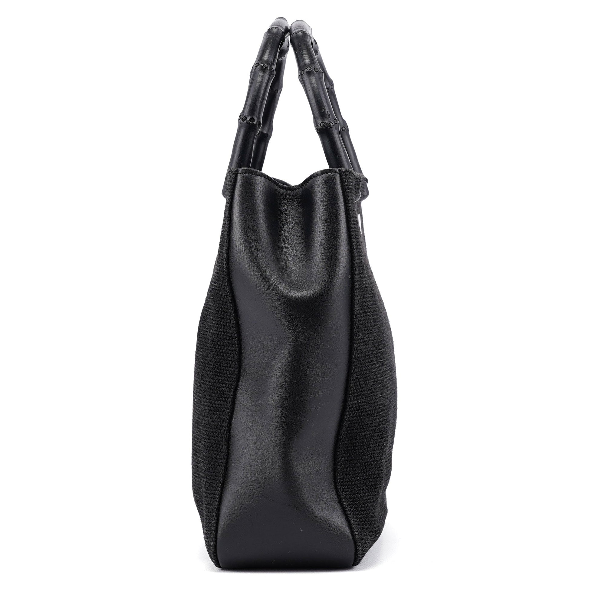 Designed by Tom Ford in the late 1990s, this Gucci Bamboo bag is handcrafted from black canvas with two classic gloss black bamboo handles. It features silver tone hardware, two compartments, and a satin-lined interior with an interior zipper pocket. The Gucci logo plate adorns the front, showcasing timeless elegance.