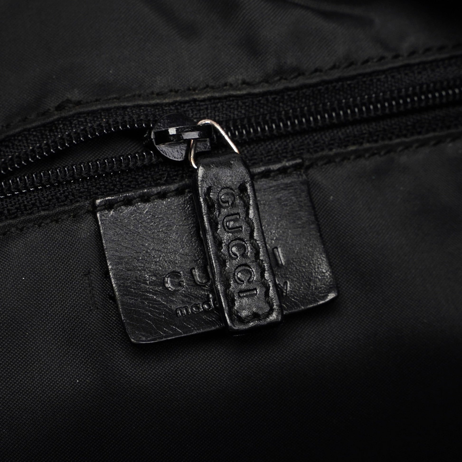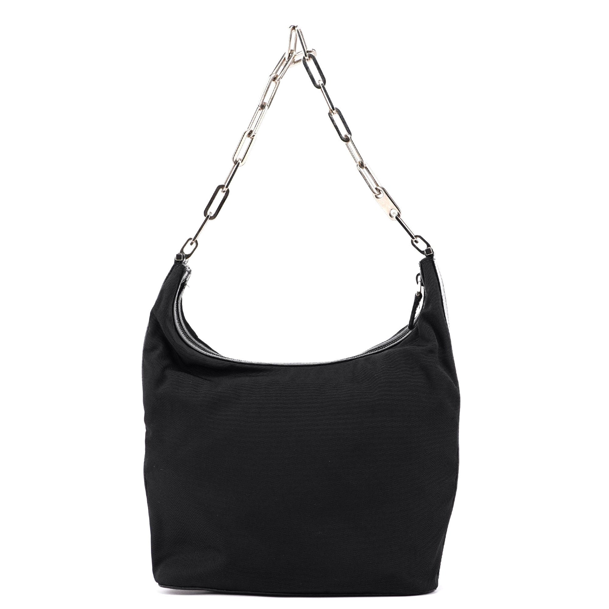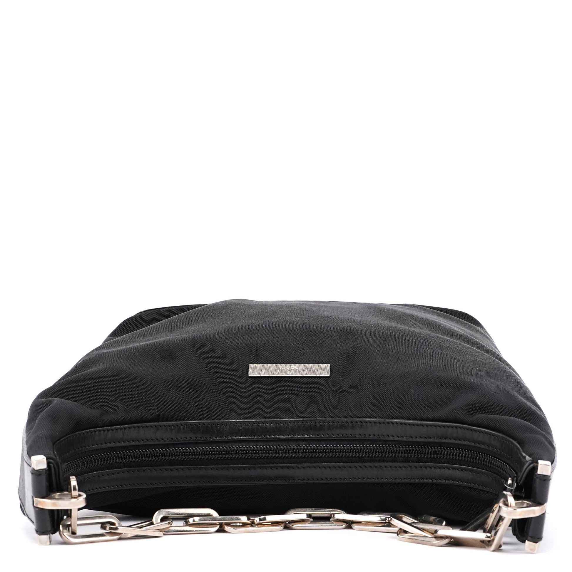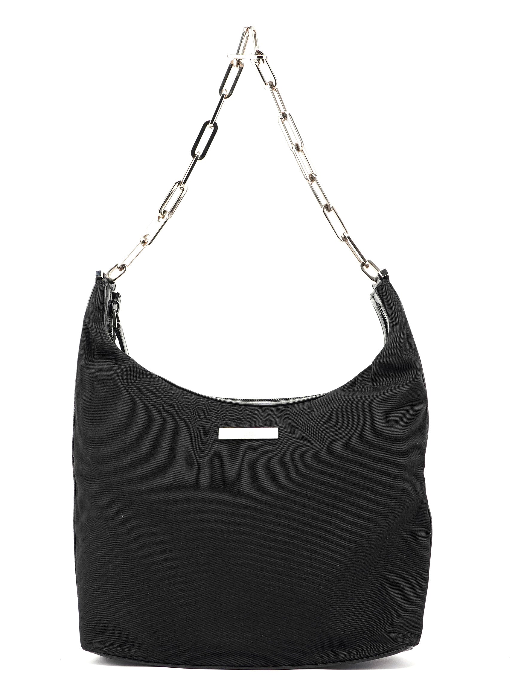 This late 1990s Gucci black canvas bag, designed by Tom Ford, showcases calfskin leather trim and sides, paired with a silver-tone stainless steel chain handle featuring Gucci logo engraving. It secures with a zipper closure and has a satin-lined interior that includes an interior zipper pocket, completed with a Gucci logo plaque on the front.