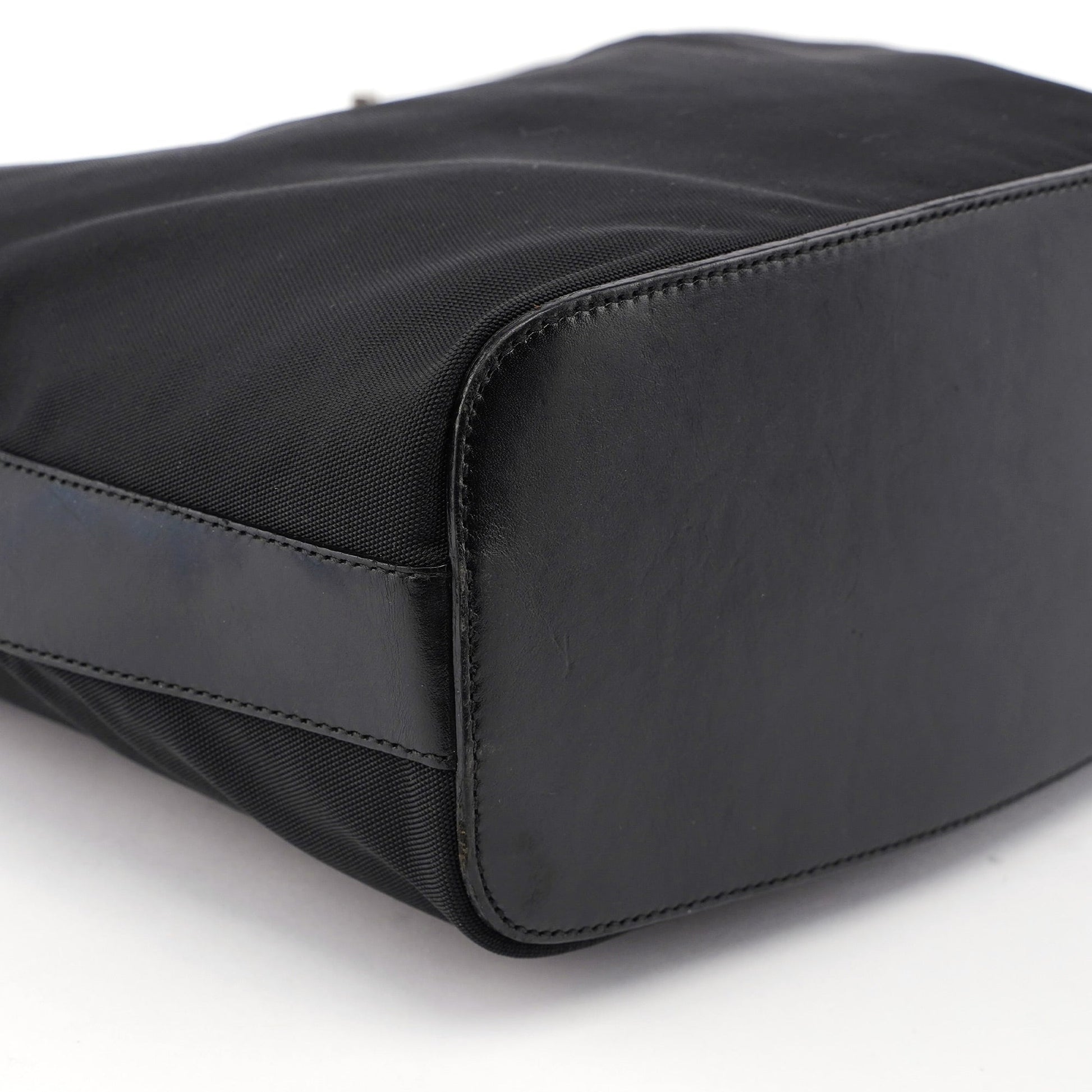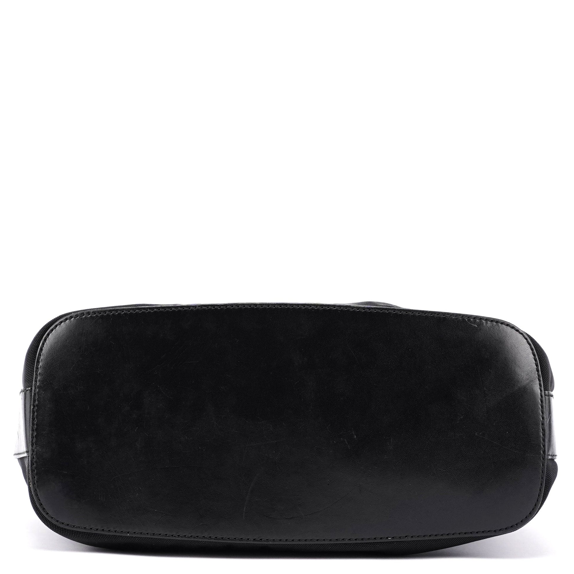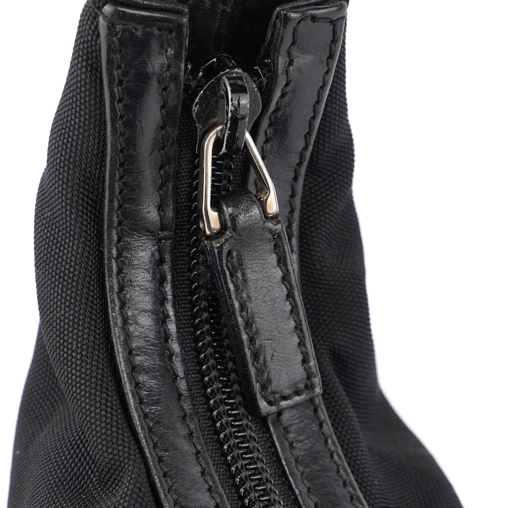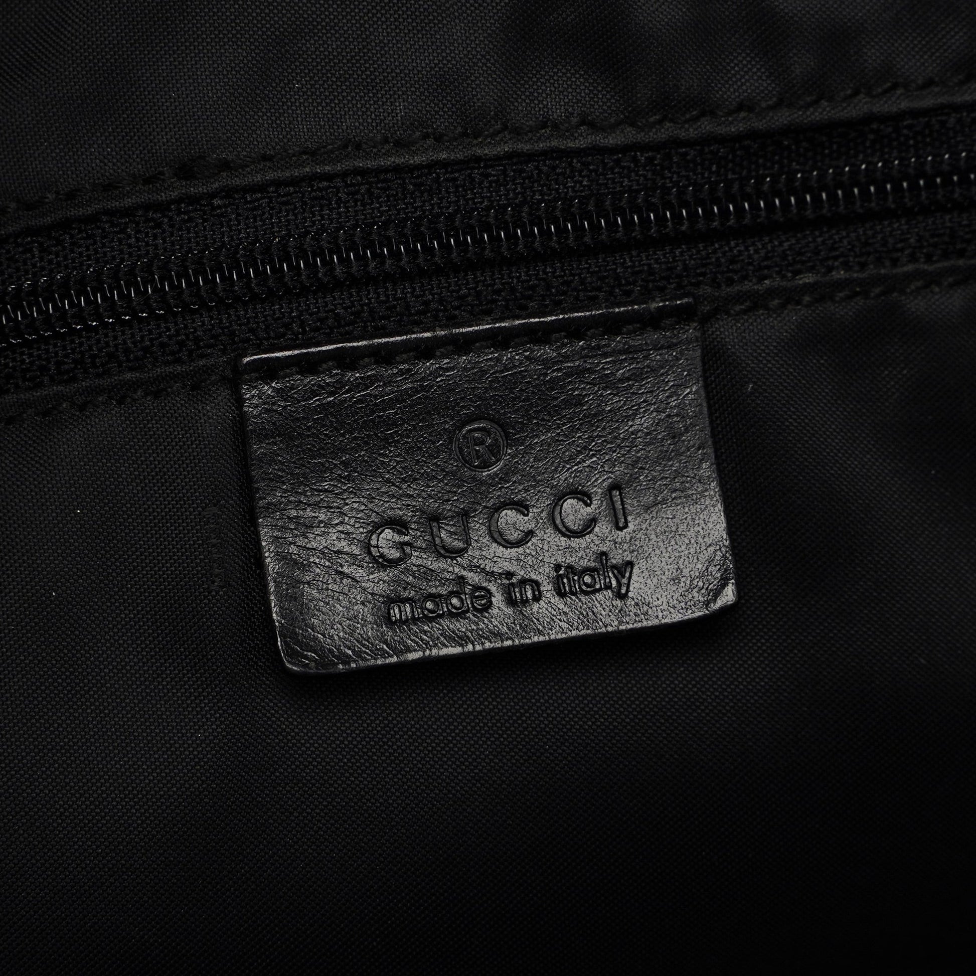 This late 1990s Gucci black canvas bag, designed by Tom Ford, showcases calfskin leather trim and sides, paired with a silver-tone stainless steel chain handle featuring Gucci logo engraving. It secures with a zipper closure and has a satin-lined interior that includes an interior zipper pocket, completed with a Gucci logo plaque on the front.